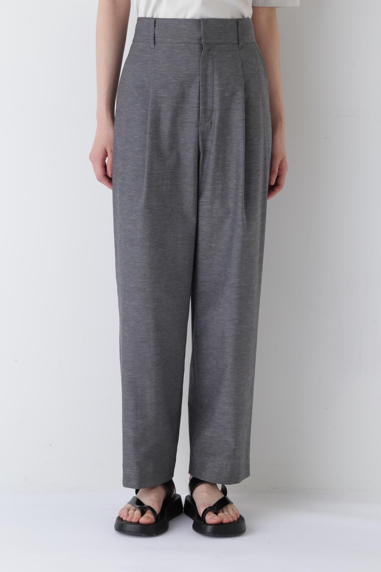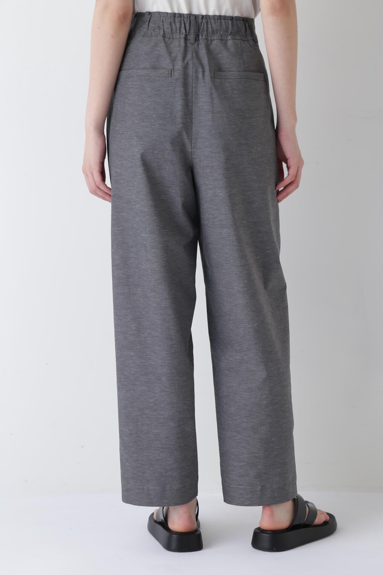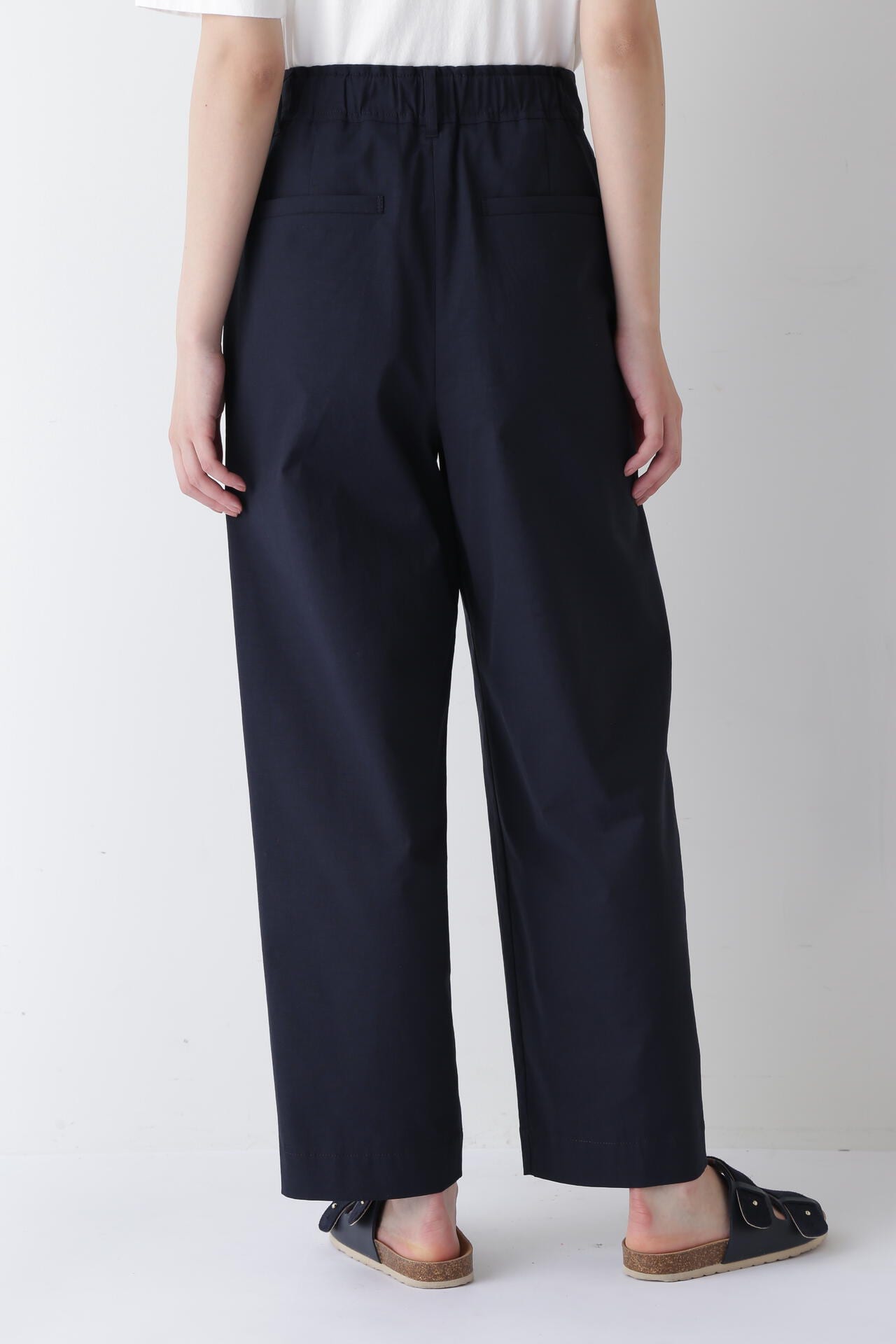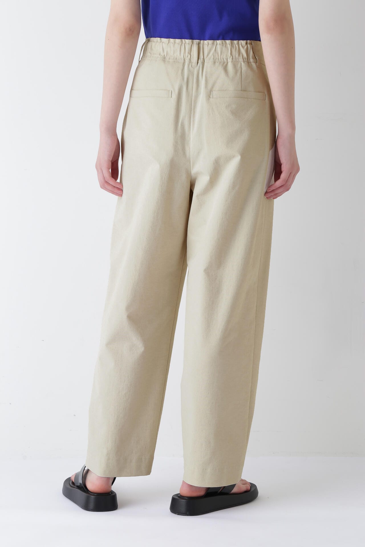 タックが入り、腰回りはゆったりとしたバレルシルエットのイージー仕様パンツ。きちんと感はありつつウエストベルトの後ろがゴム仕様なので快適に着ていただけます。