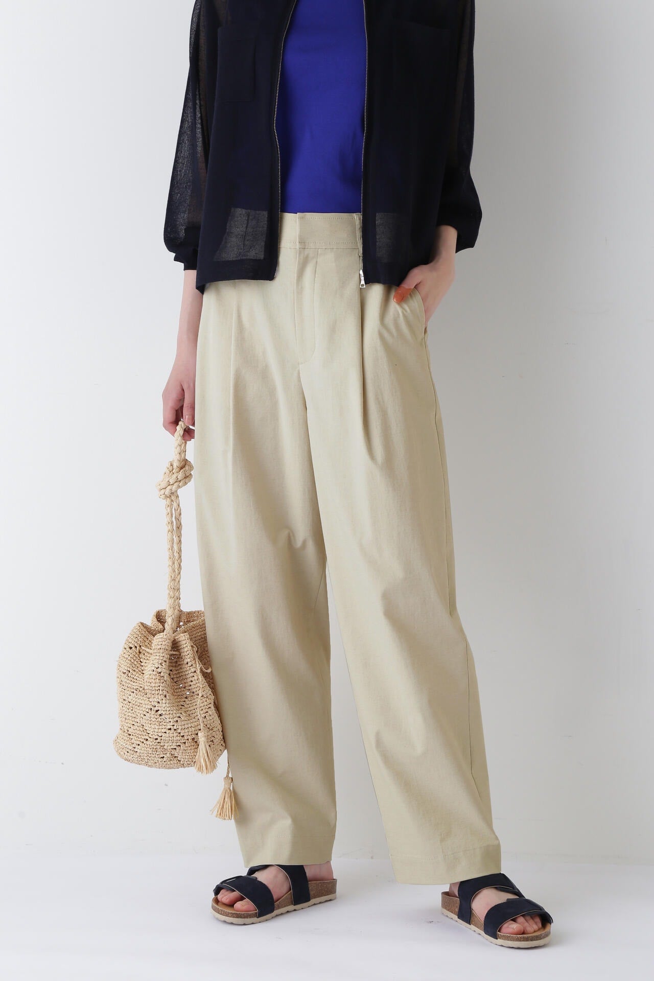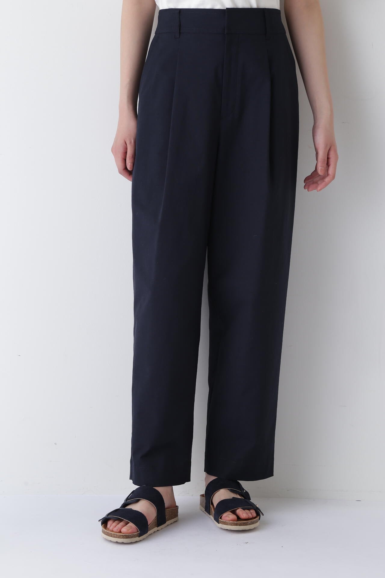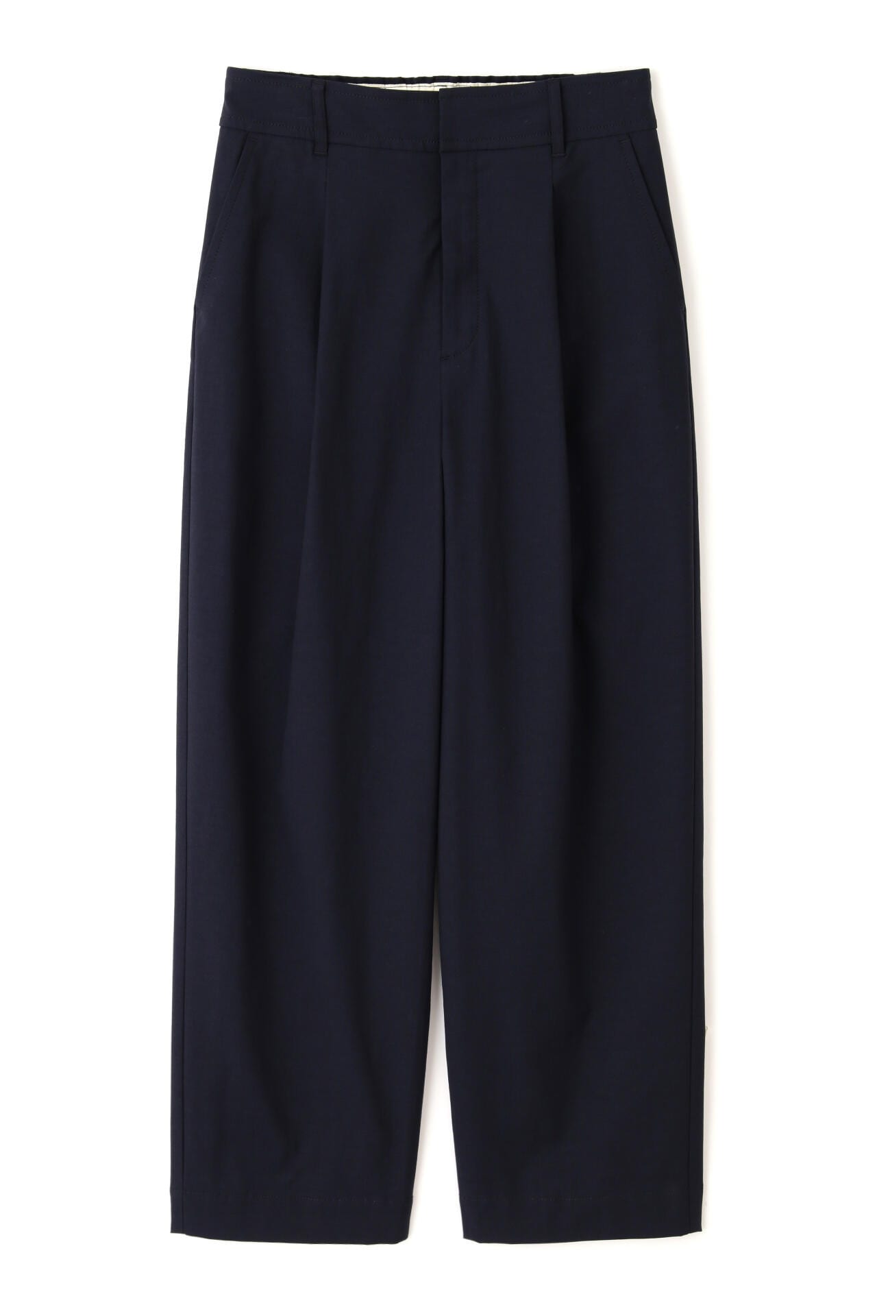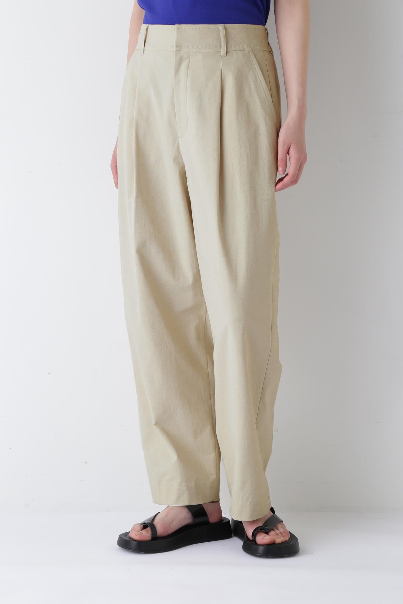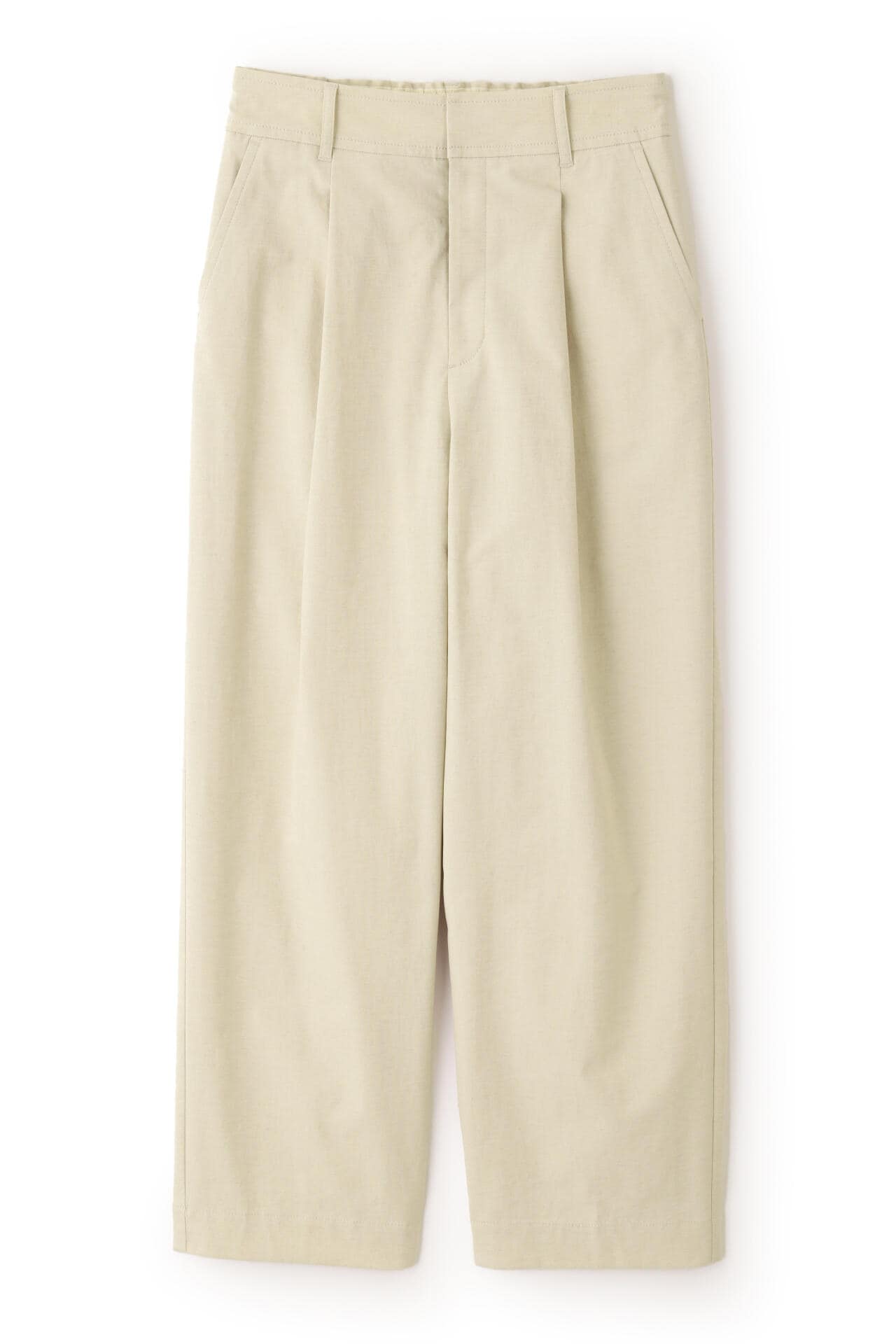 タックが入り、腰回りはゆったりとしたバレルシルエットのイージー仕様パンツ。きちんと感はありつつウエストベルトの後ろがゴム仕様なので快適に着ていただけます。