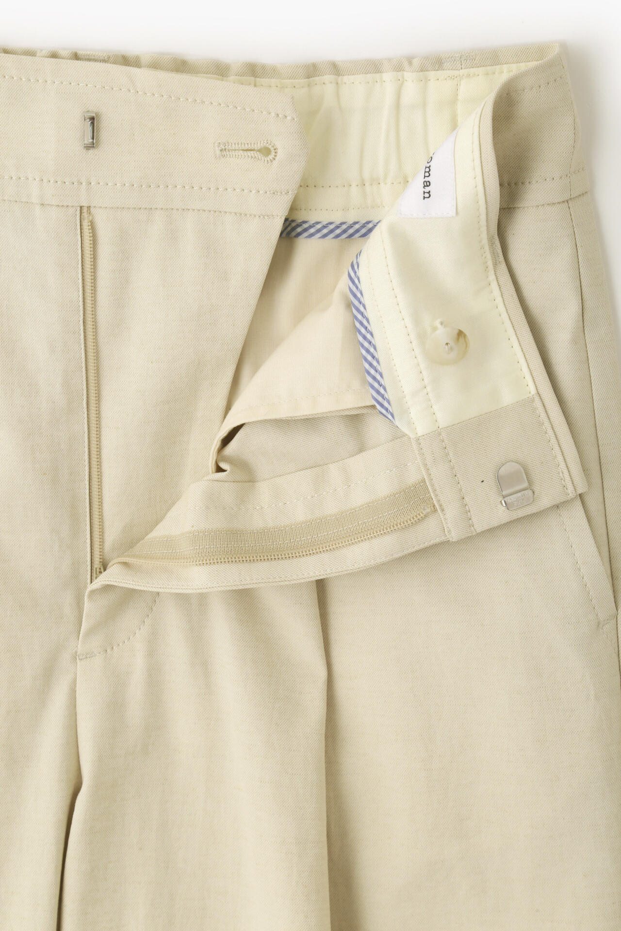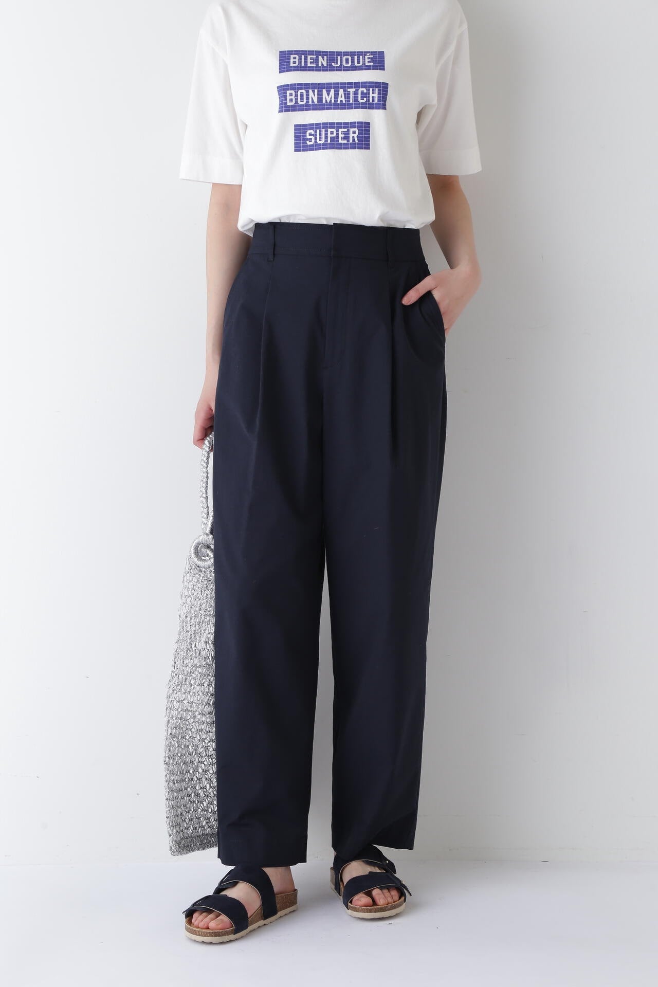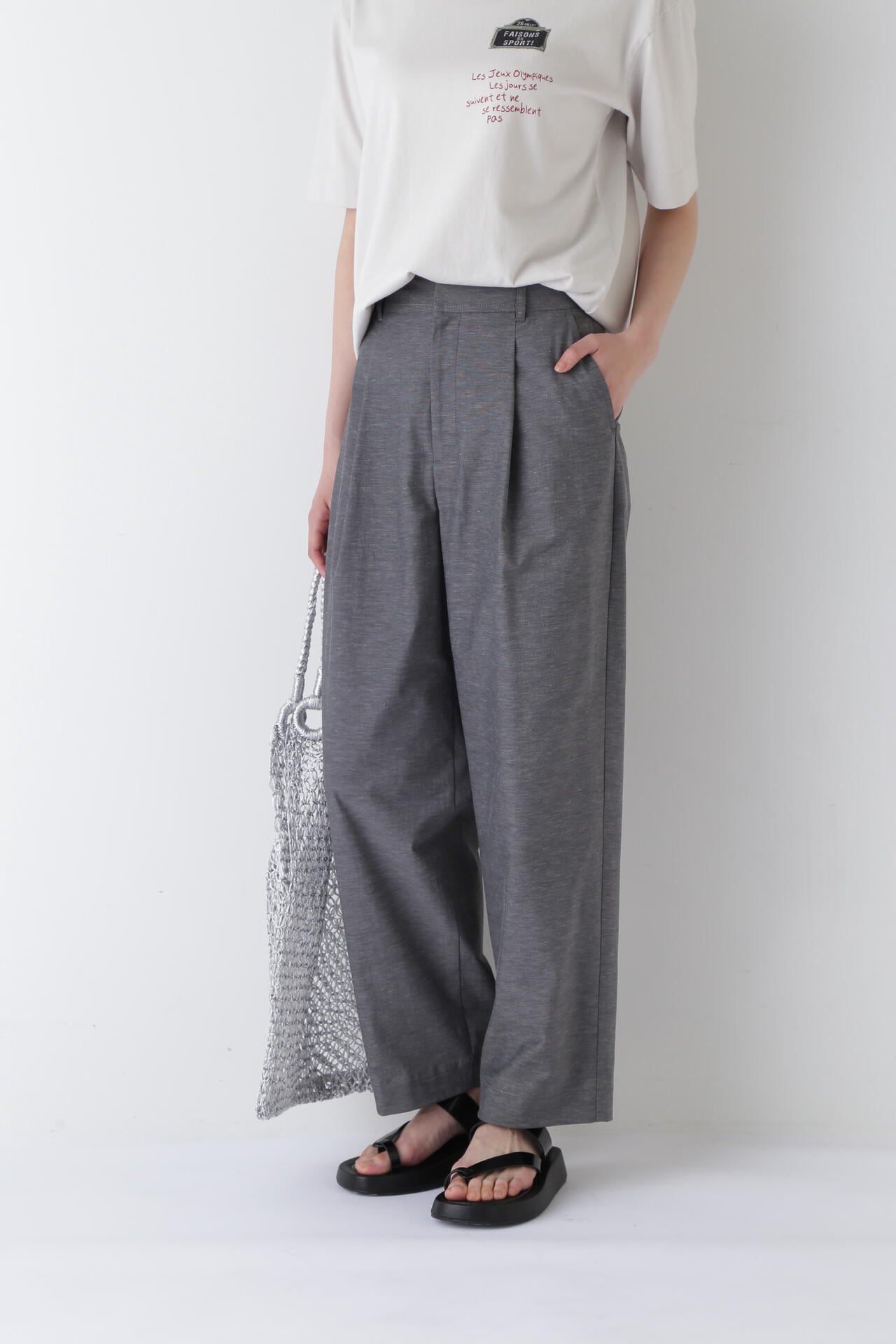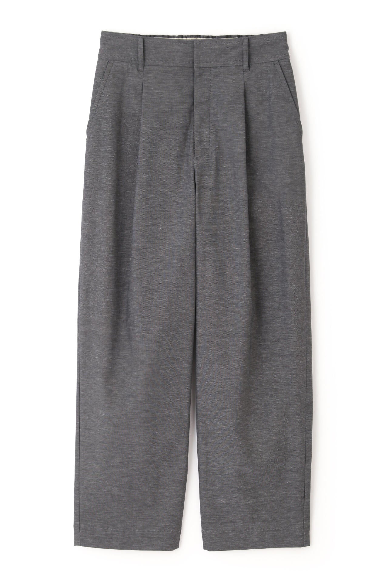 タックが入り、腰回りはゆったりとしたバレルシルエットのイージー仕様パンツ。きちんと感はありつつウエストベルトの後ろがゴム仕様なので快適に着ていただけます。