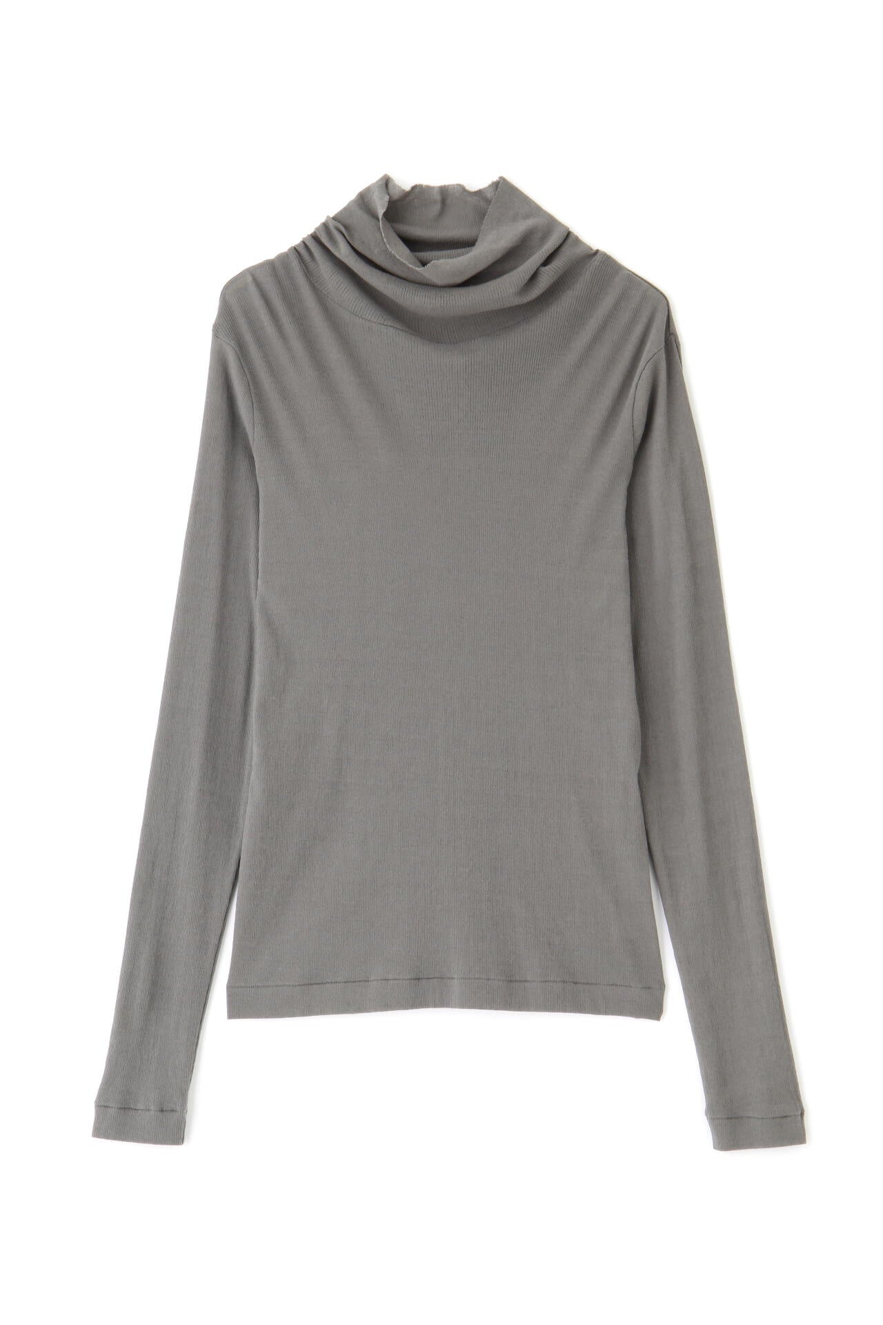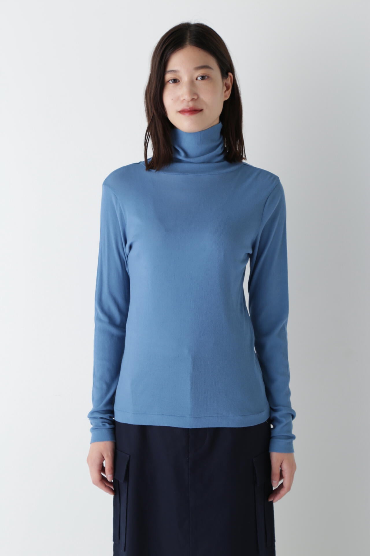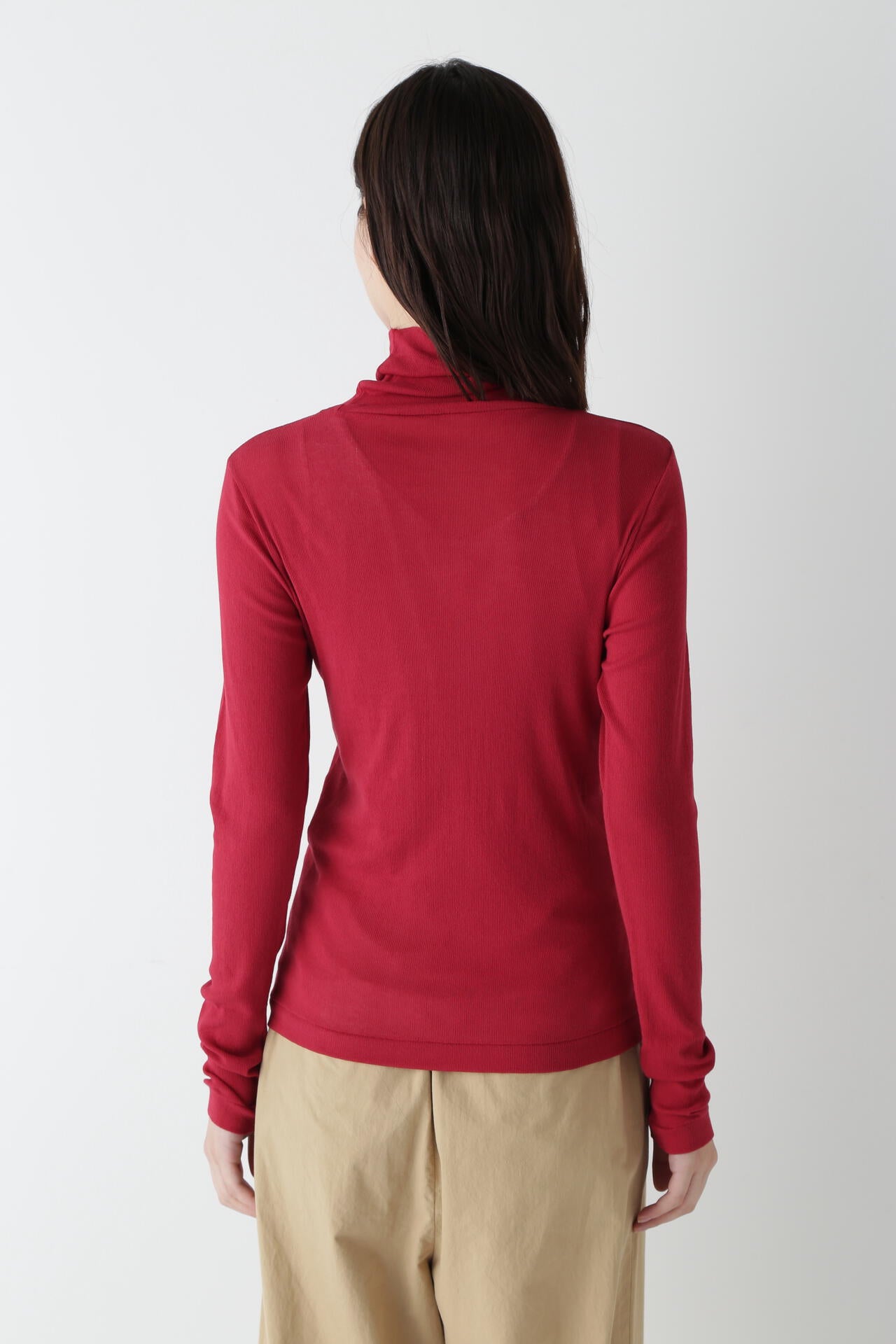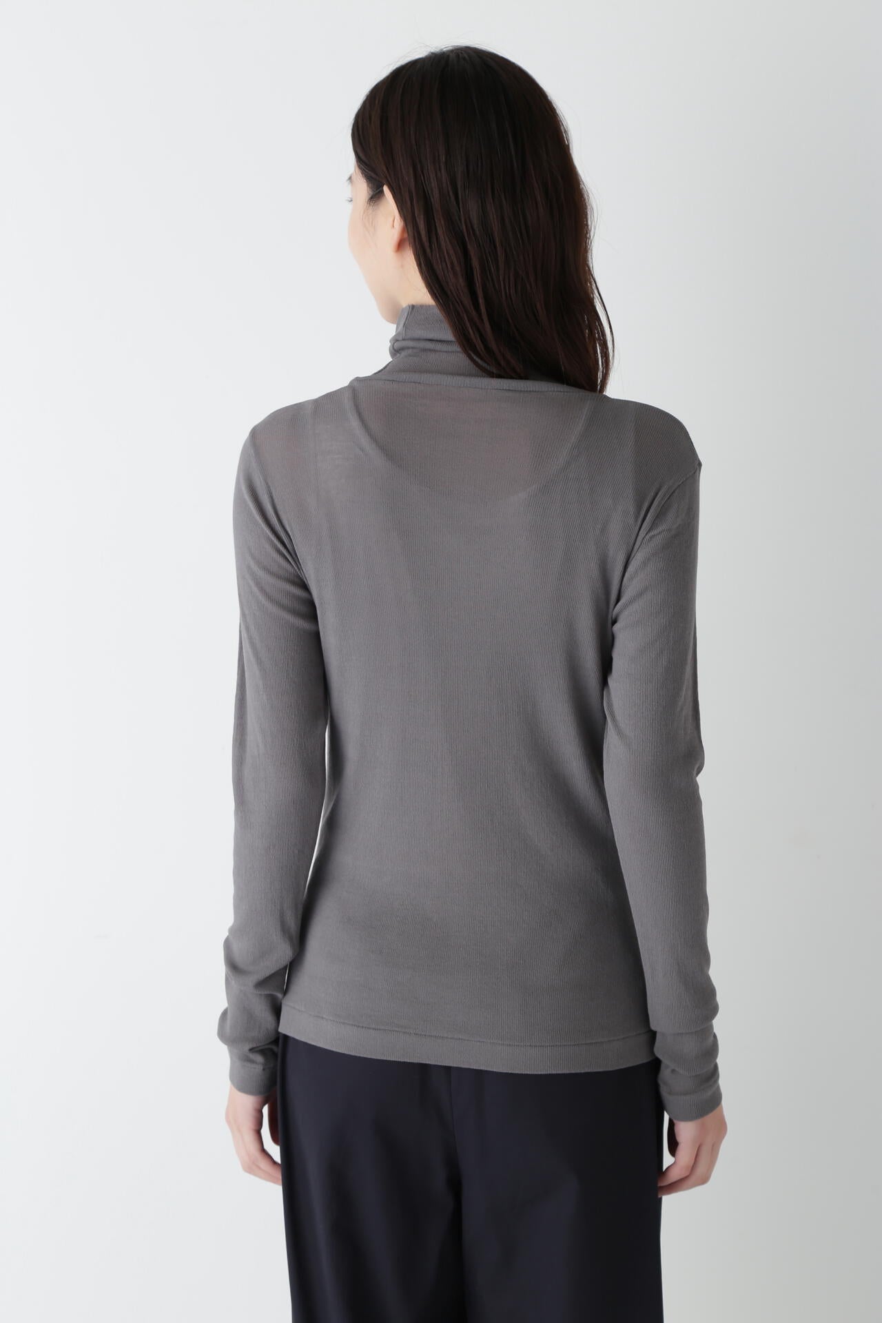 身体にほどよくフィットするサイズ感のシアーテレコのタートルネックです。衿はややゆったりとした作りで衿端は断ち切りにしているので肌あたりもとても柔らかいです。
