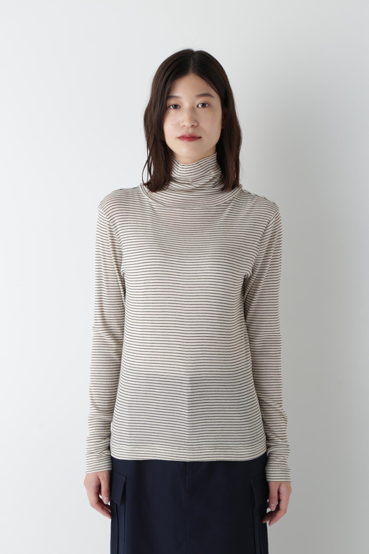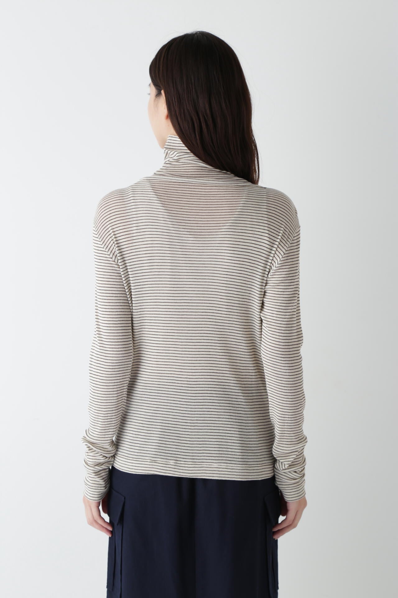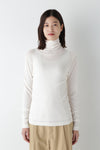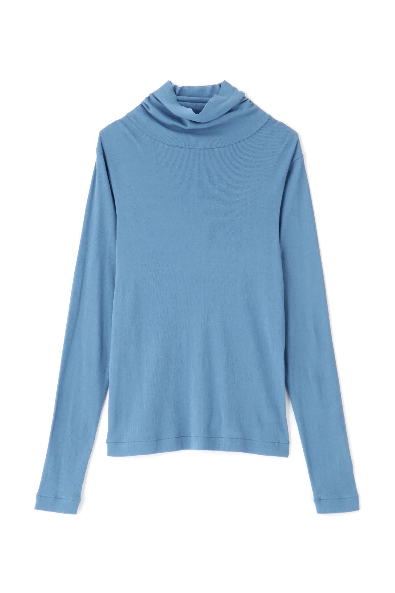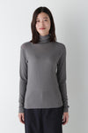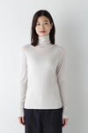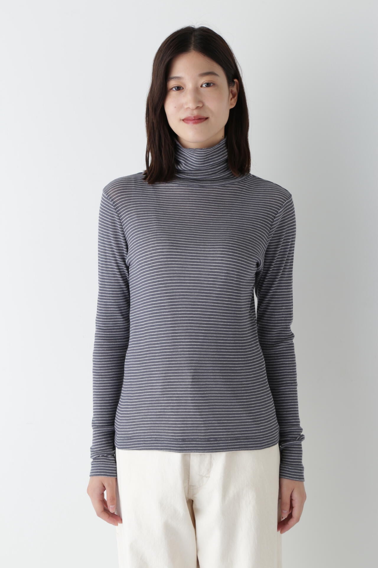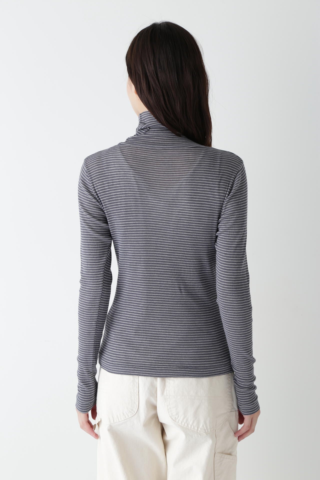 身体にほどよくフィットするサイズ感のシアーテレコのタートルネックです。衿はややゆったりとした作りで衿端は断ち切りにしているので肌あたりもとても柔らかいです。