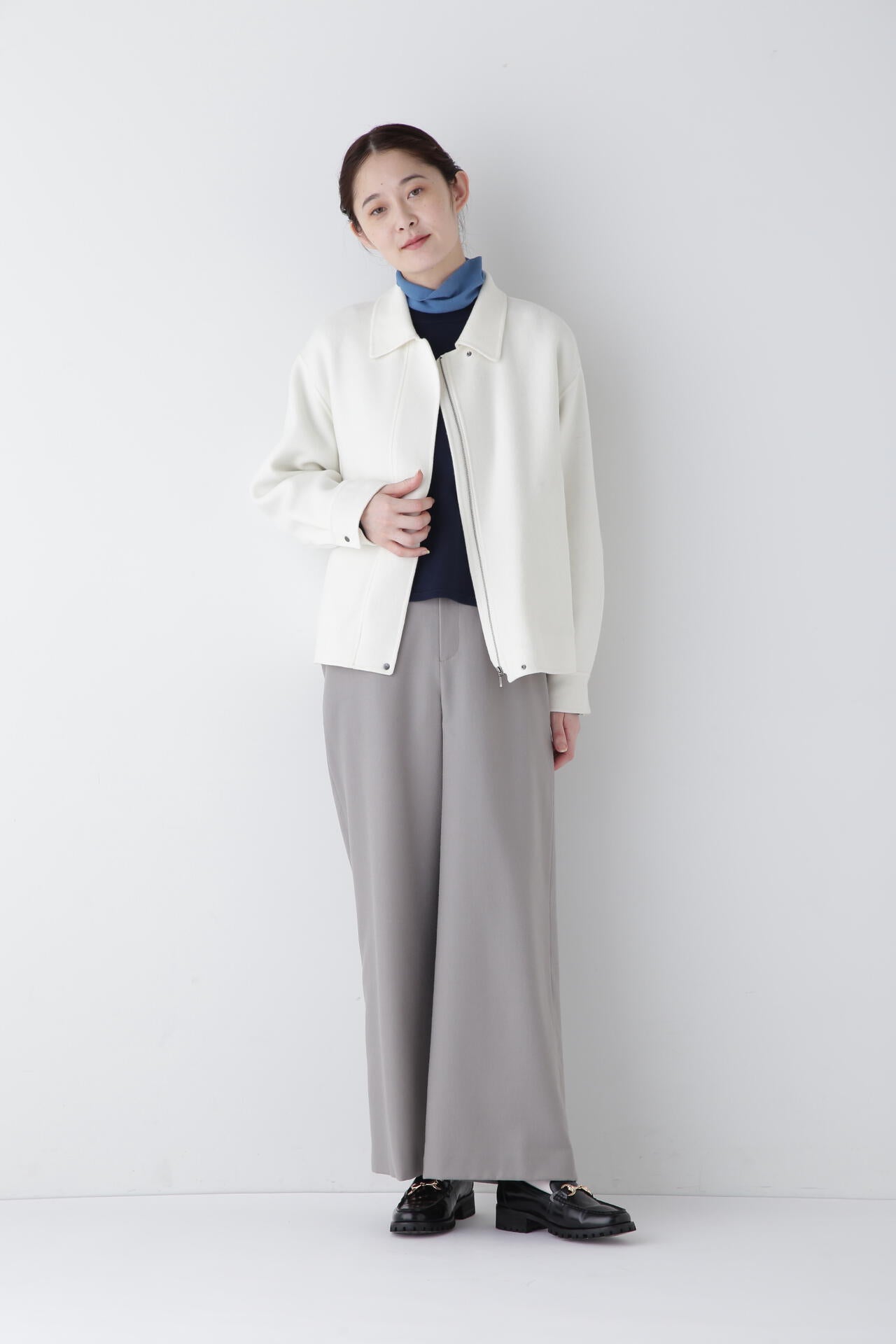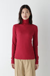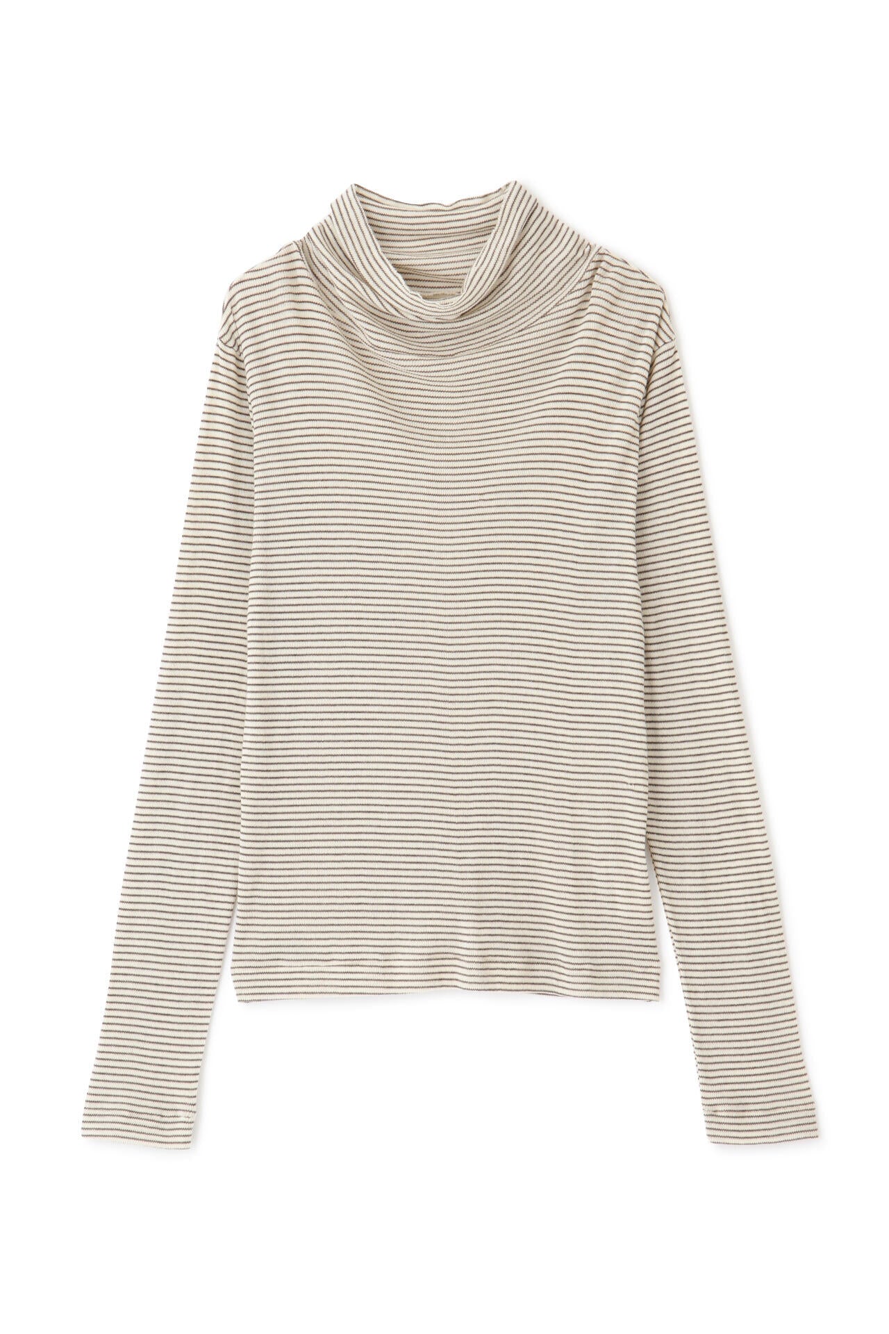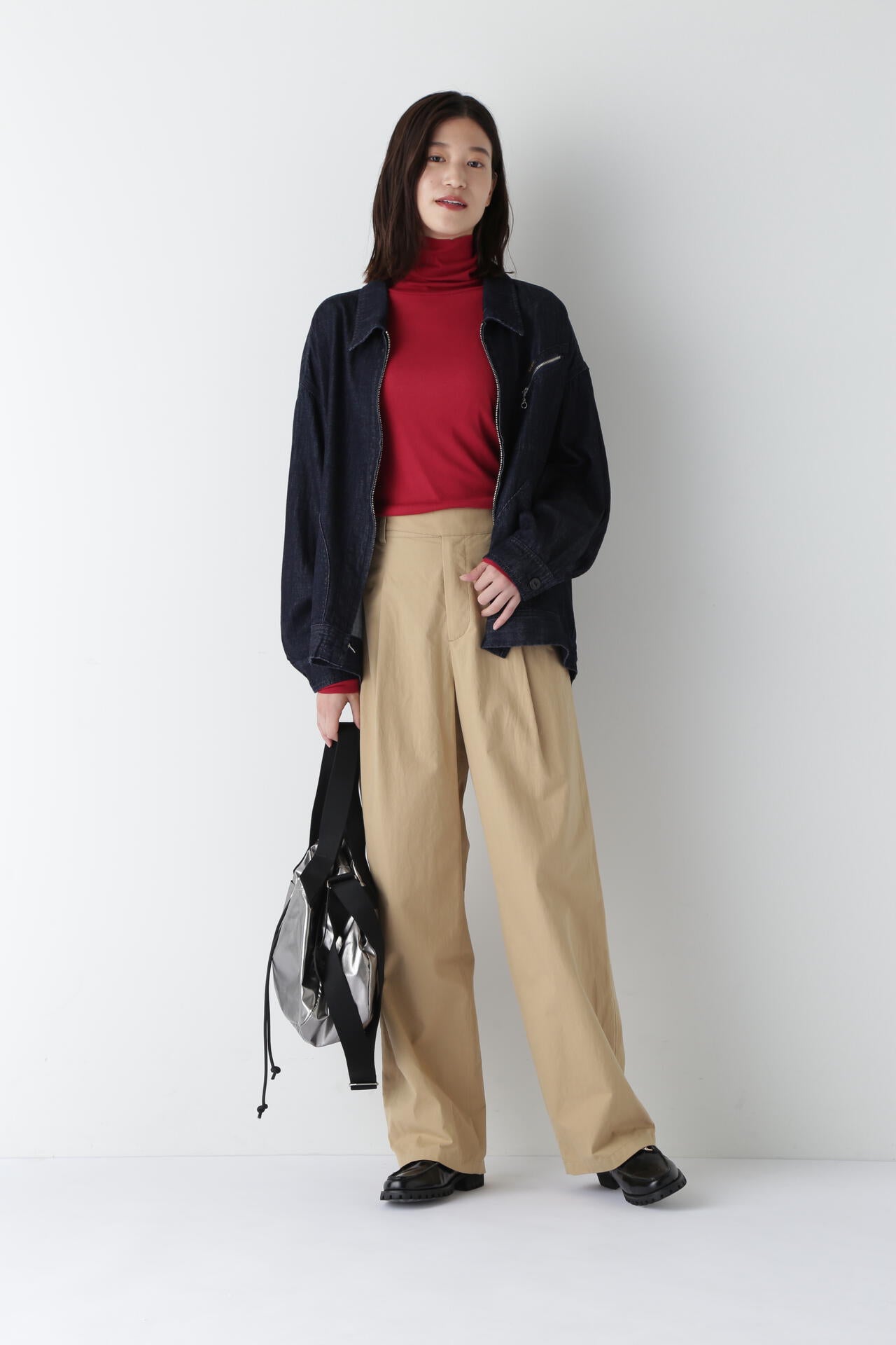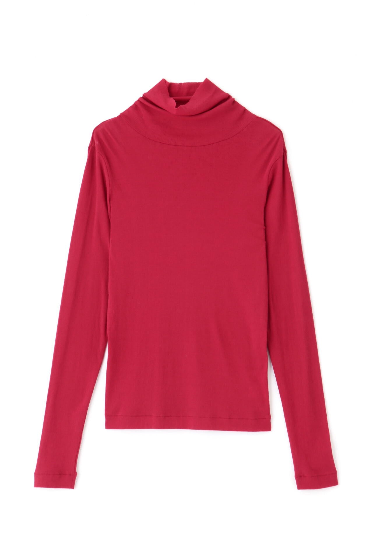 身体にほどよくフィットするサイズ感のシアーテレコのタートルネックです。衿はややゆったりとした作りで衿端は断ち切りにしているので肌あたりもとても柔らかいです。