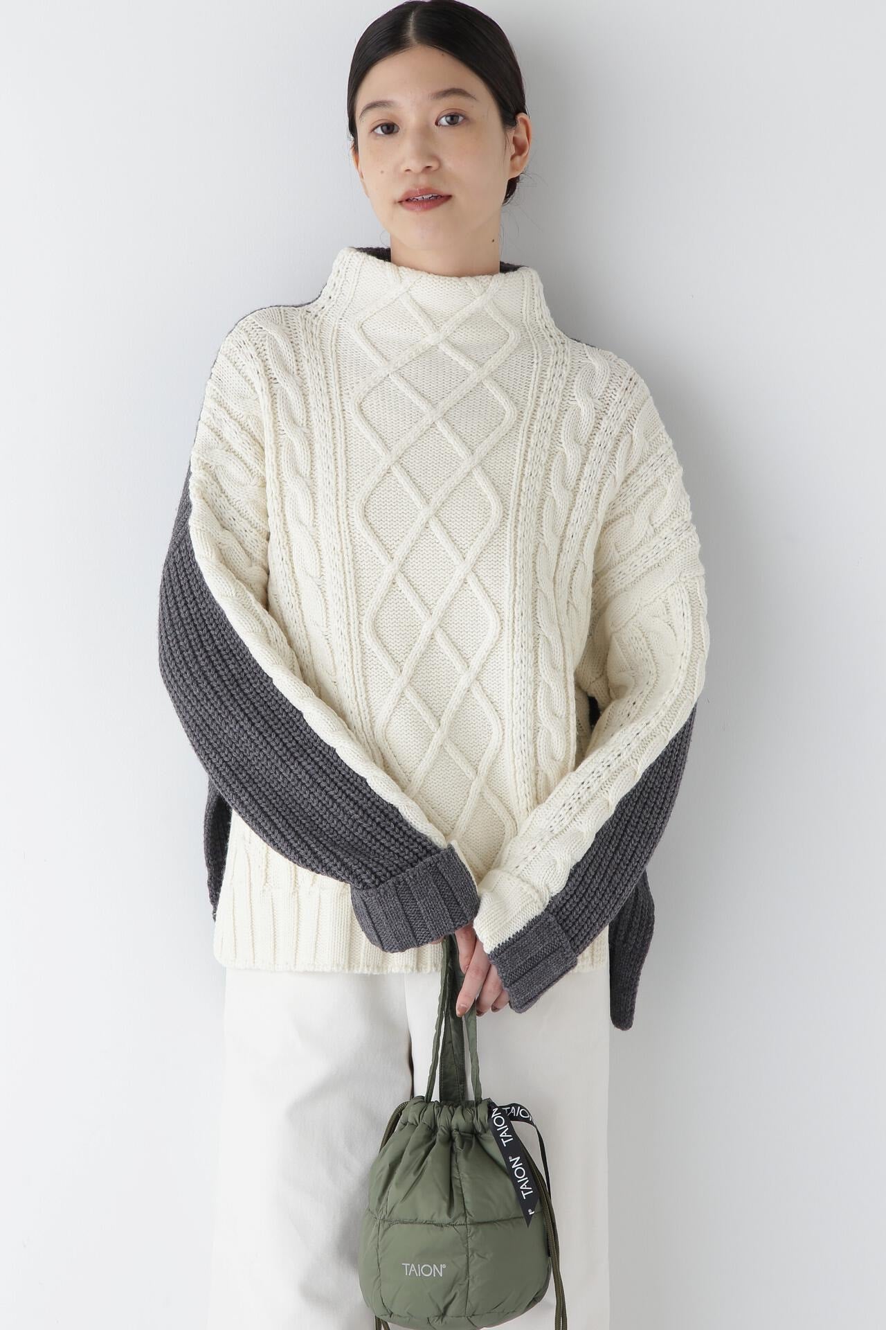 前後で編み方とカラーが異なった主役級ニットです。前身頃はケーブル編み、後ろ身頃を畦編みのコンビにして表情を変えました。ハイネック部分はラフに折り返したような仕様にしています。前後差があり抜け感のあるデザインです。