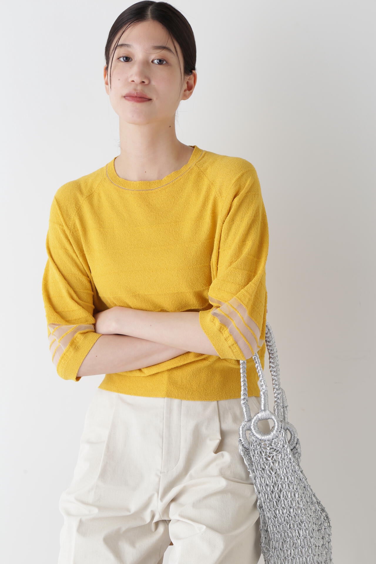 14Gガーターで地柄ボーダーに編み立てた、ボリューム袖がトレンド感のある着回しの効くニットプルオーバーです。袖部分のボーダーピッチを変化させ、袖口を透けさせてポイントにしました。衿リブ部分にも透ける細ラインを入れてバランスをとっています。