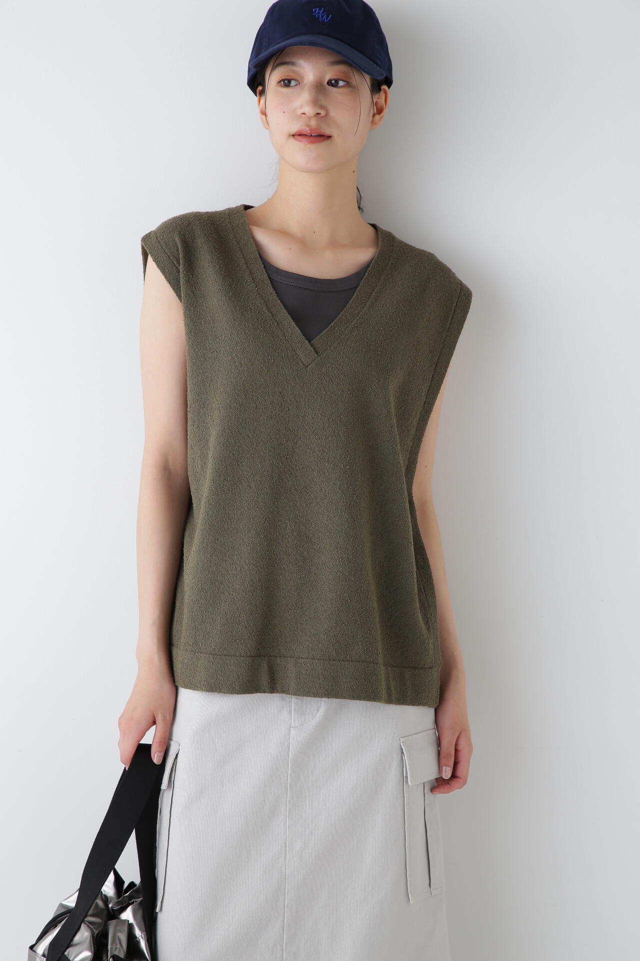 細番手のブークレを編み立てた表情のある素材感が特徴のVネックベスト。脇はループ止めで解放感があり風通しが良いです。ループの位置を変えて丈のバランスを調節することができます。