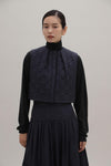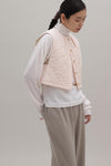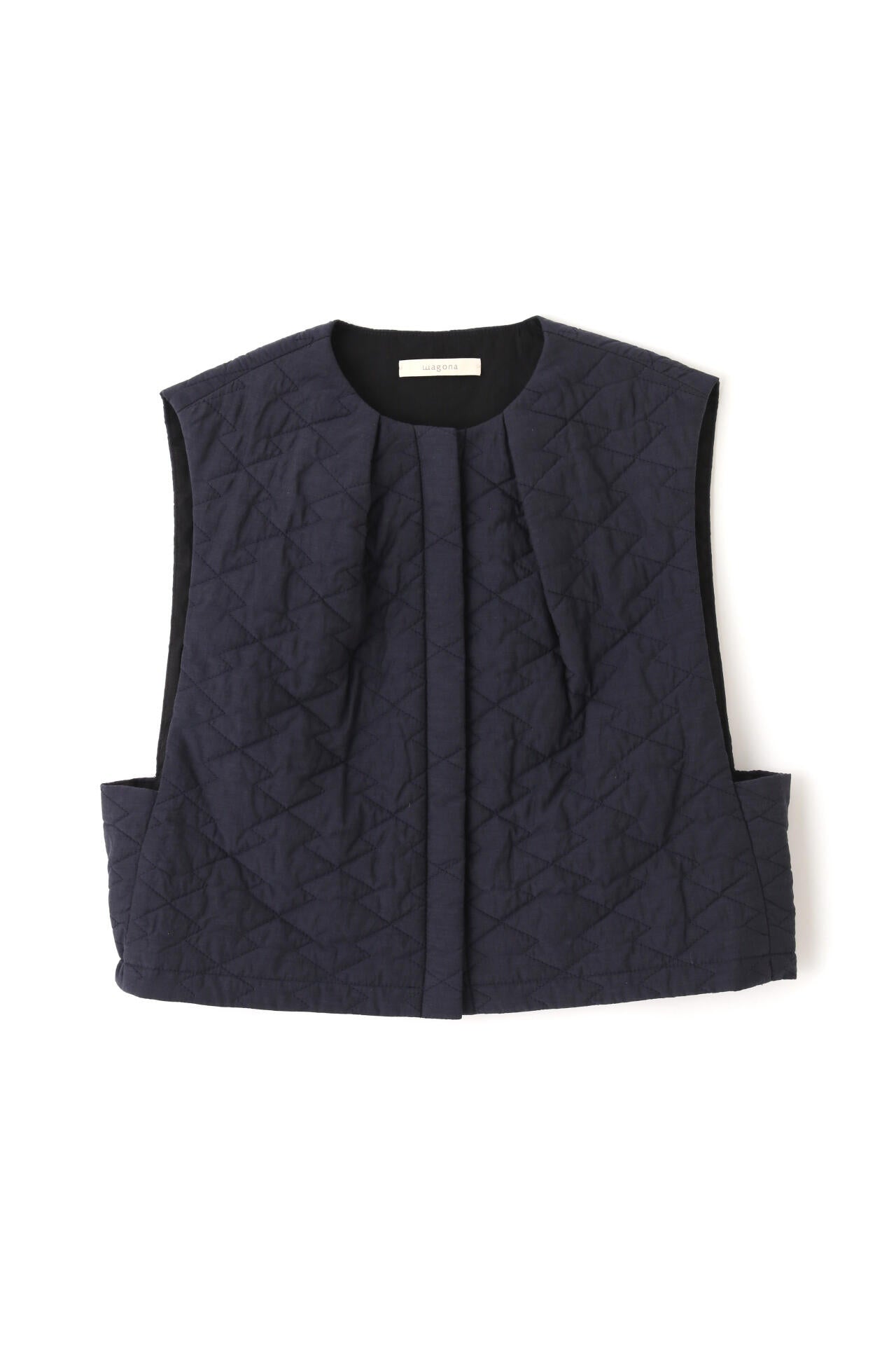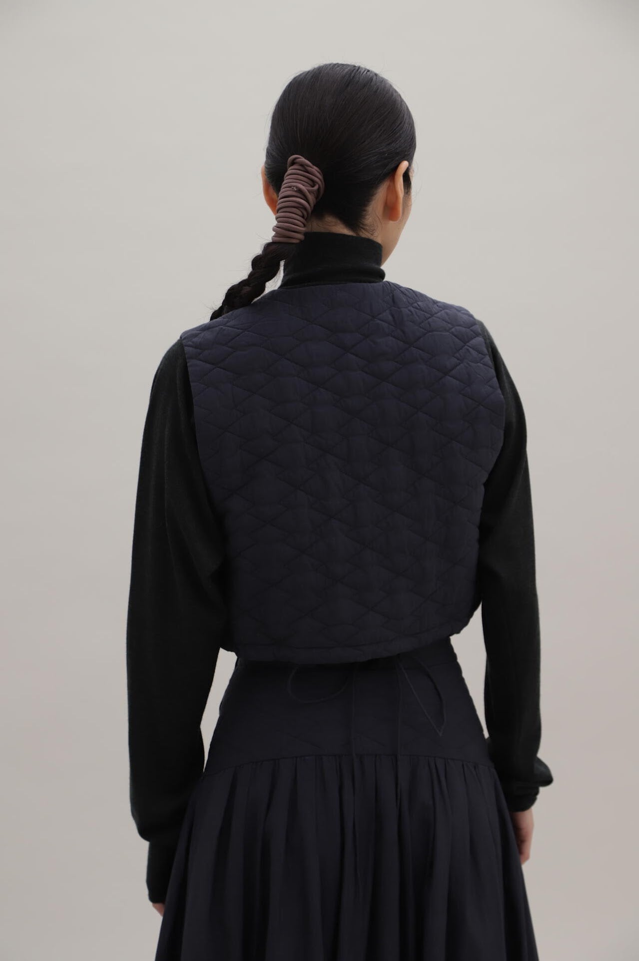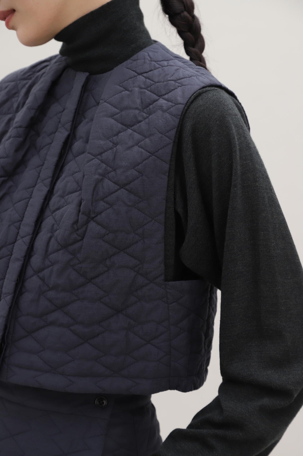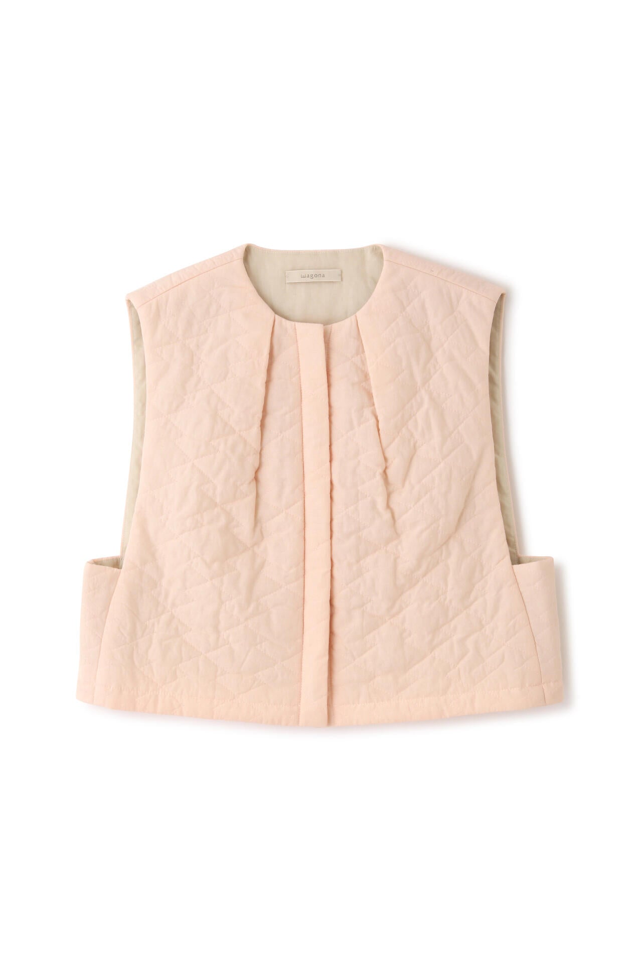 ショート丈のキルティングを施したベスト。ショート丈にしたことで今年らしいコーディネートやスタイルアップのバランスを作ってくれます。襟ぐりに入れたタックが顔周りのアクセントに。裾の内側でもアジャスタで絞れる仕様にしています。アームホールが広めな作りでインナーを選びません。
