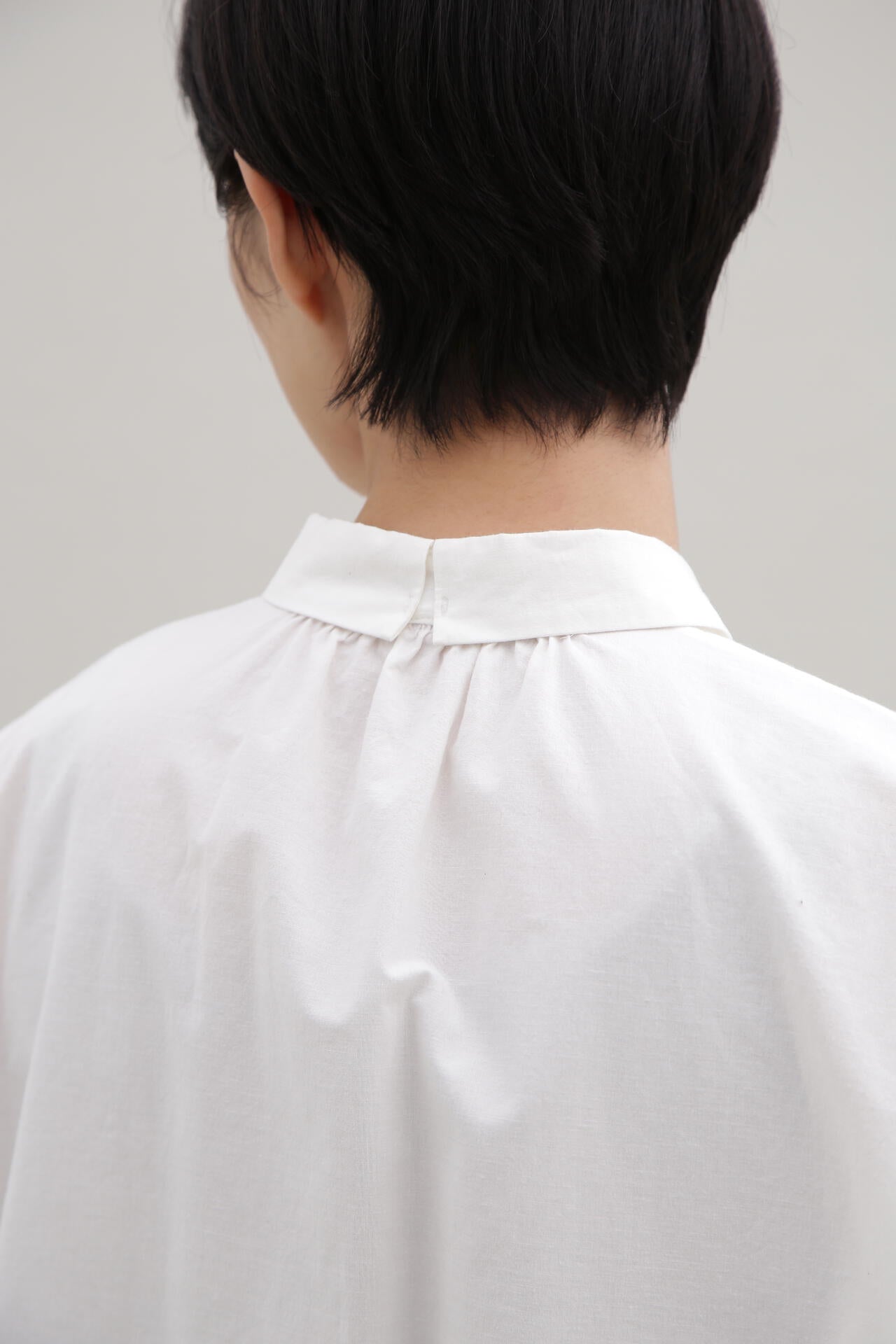 凛としたシャツに衿の後ろに入れた切り込みや袖口のギャザーディテールで優しげな表情に仕上げたシャツ。袖口はボタンを外し折り上げると袖丈の調節にもなります。程よくゆったりとしたサイズ感はボトムインでもアウトでもバランスのよいデザイン。