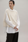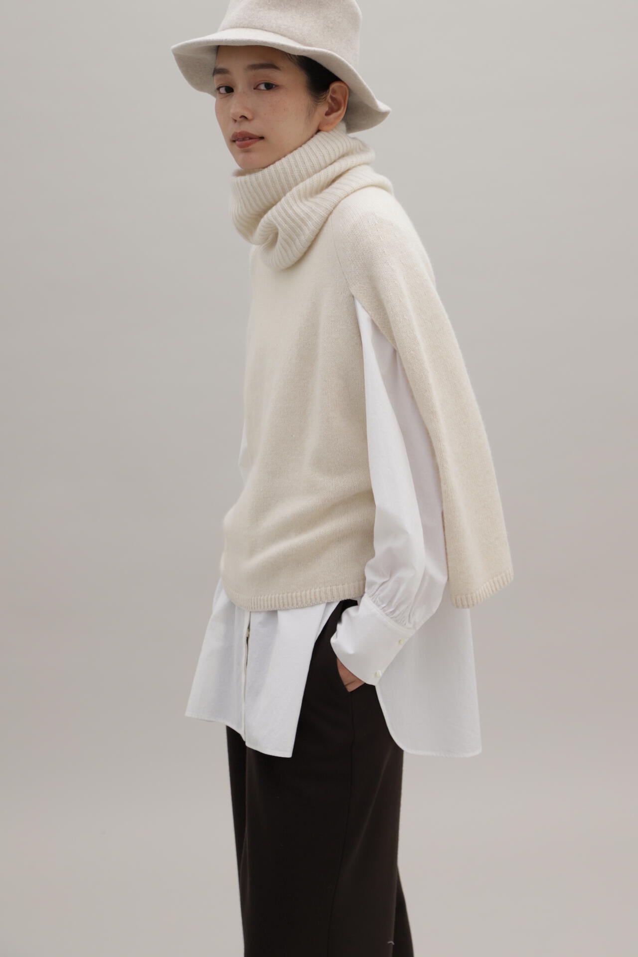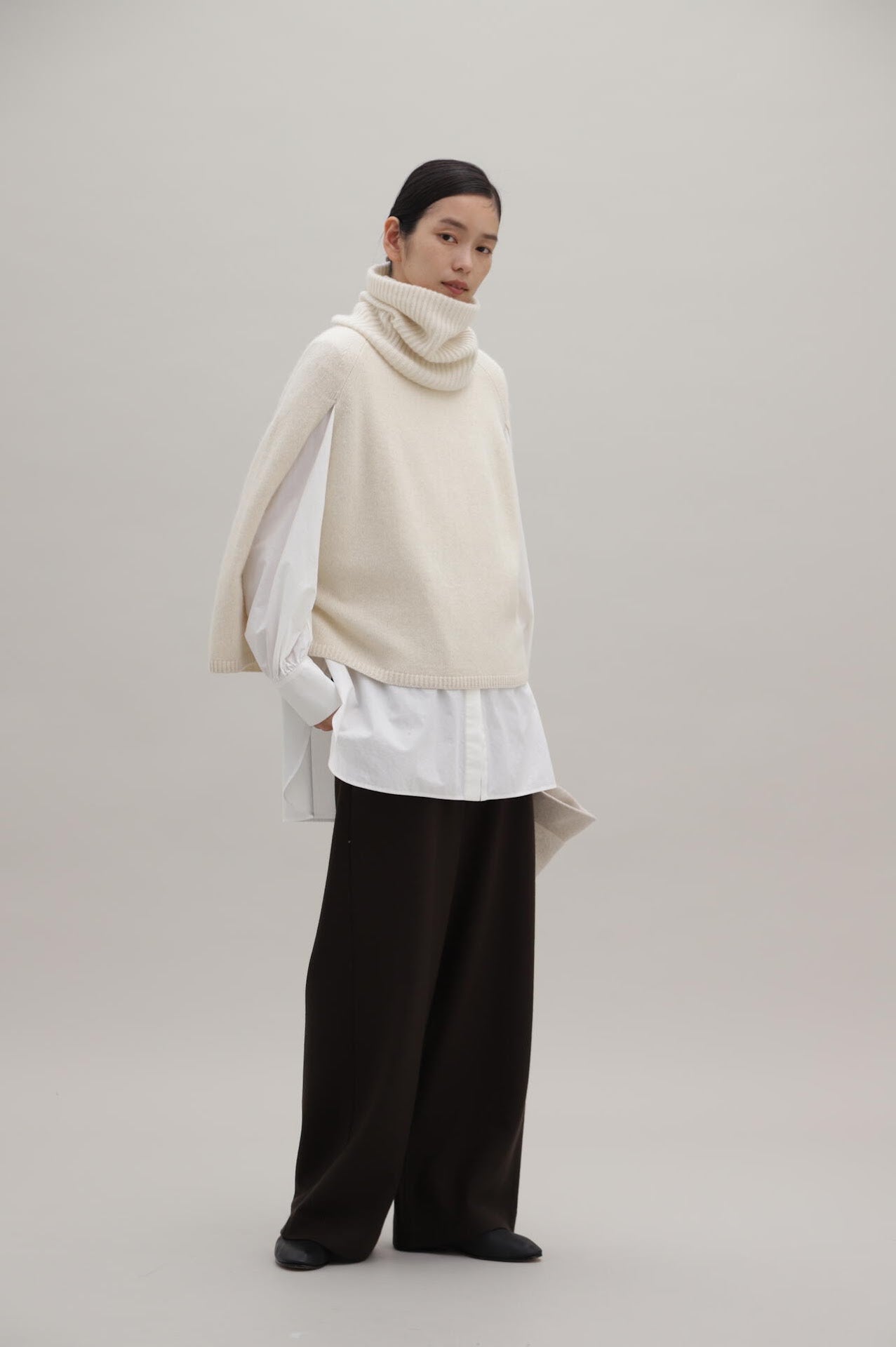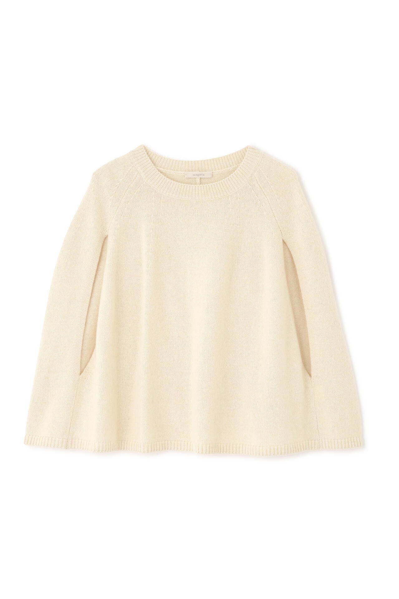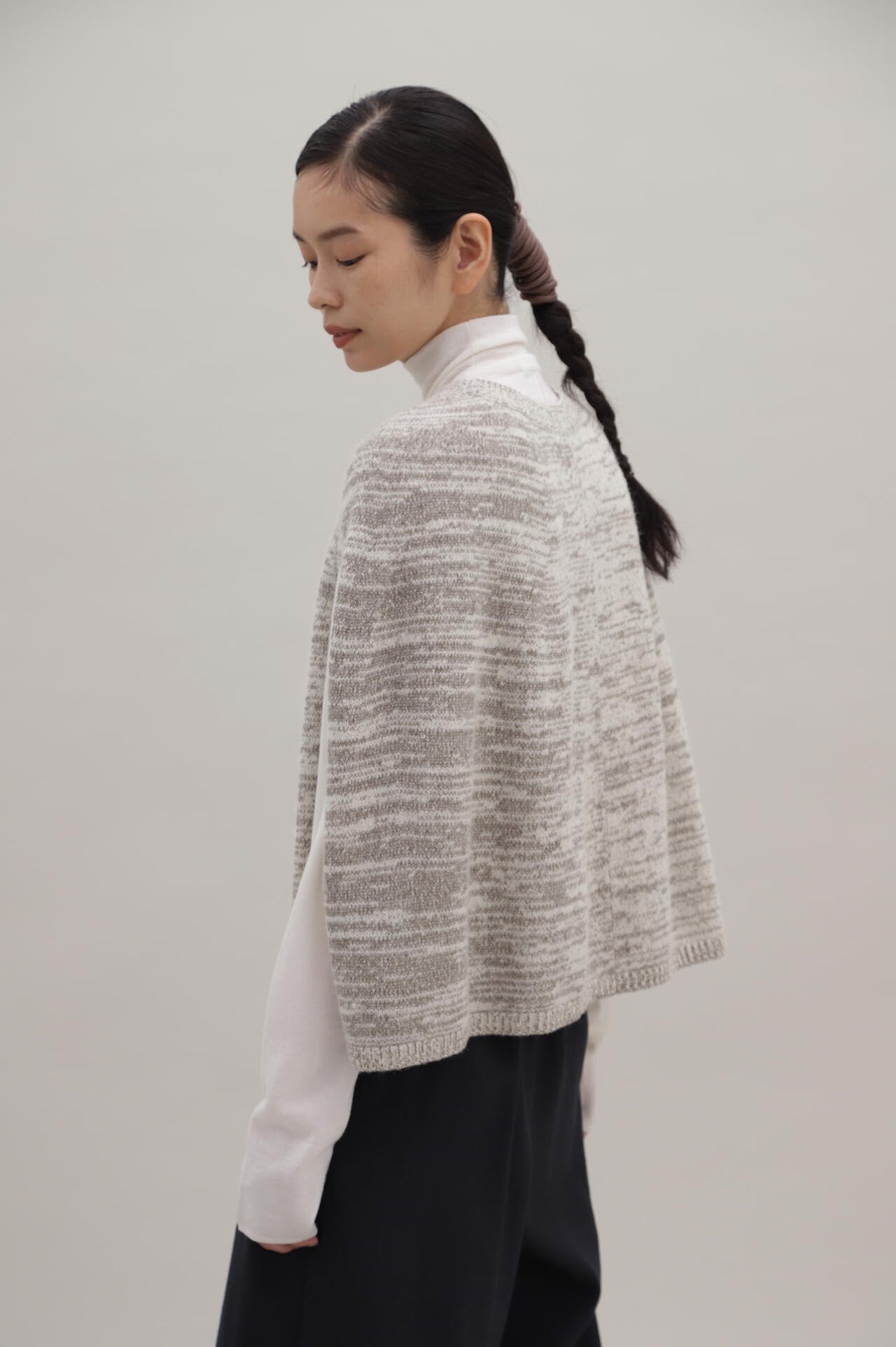 温かみのある糸でゆったりと編まれたケープデザインのニットトップス。ウール×フォックスの無染色の生成りの糸にシルクの配色カラーを混ぜ奥行きのある表情にしています。大きく開けたスリットは腕を出しやすくしたデザイン。