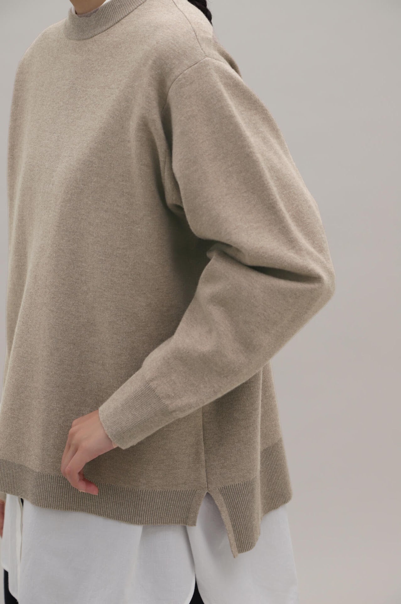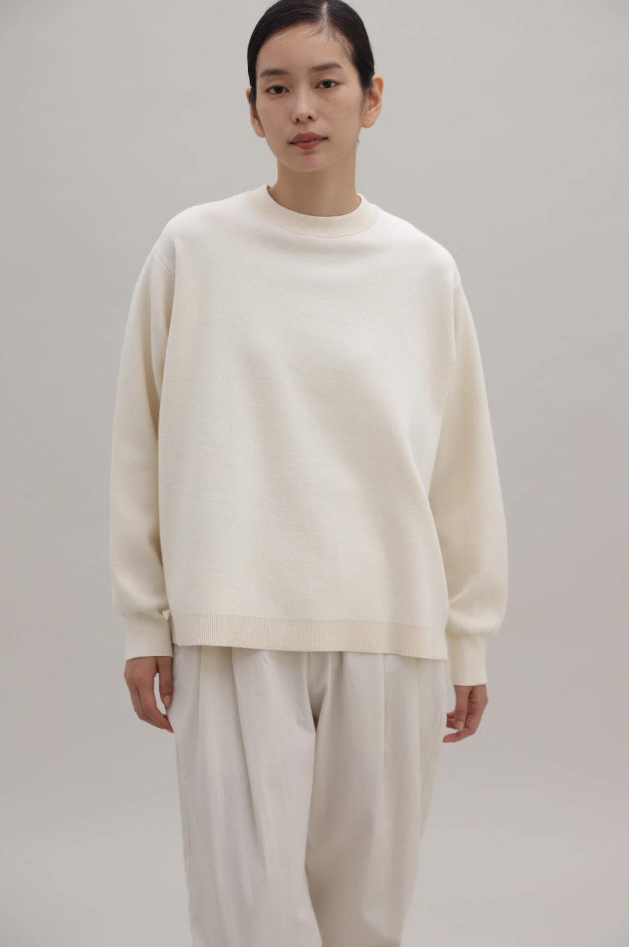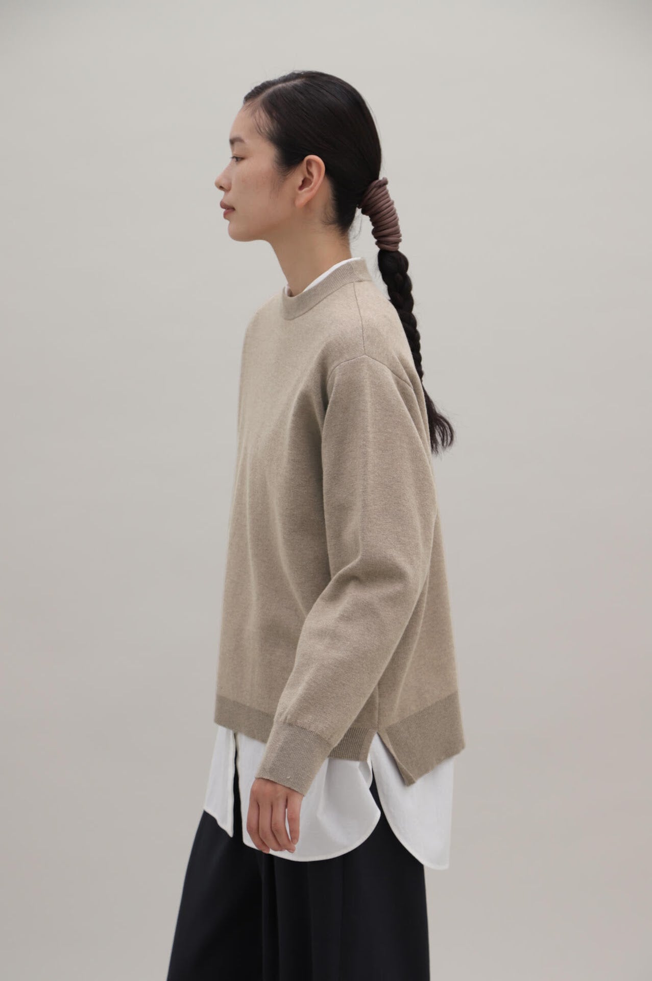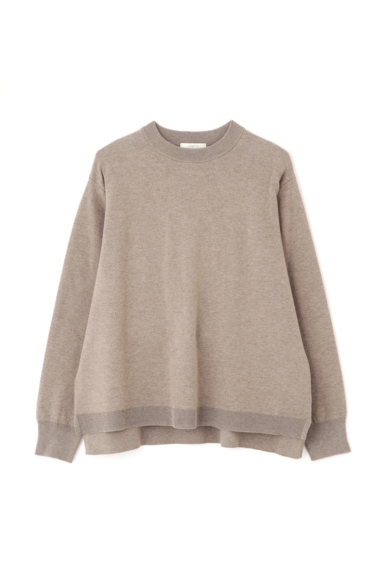 ソフトでとても滑らかな肌触りのトレーナー風ニットは袖が上向きのバンザイをしているようなユニークなデザイン。腕の上げ下げが楽に感じ、腕を下ろしているときは綺麗に収まるwagonaのオリジナルのパターン。顔周りにくる衿ぐりのリブに厚みを持たせ、サイドにはスリット開きのディテールを入れシンプルな中にもニュアンスを出しています。長いシーズン着用できるプルオーバーです。