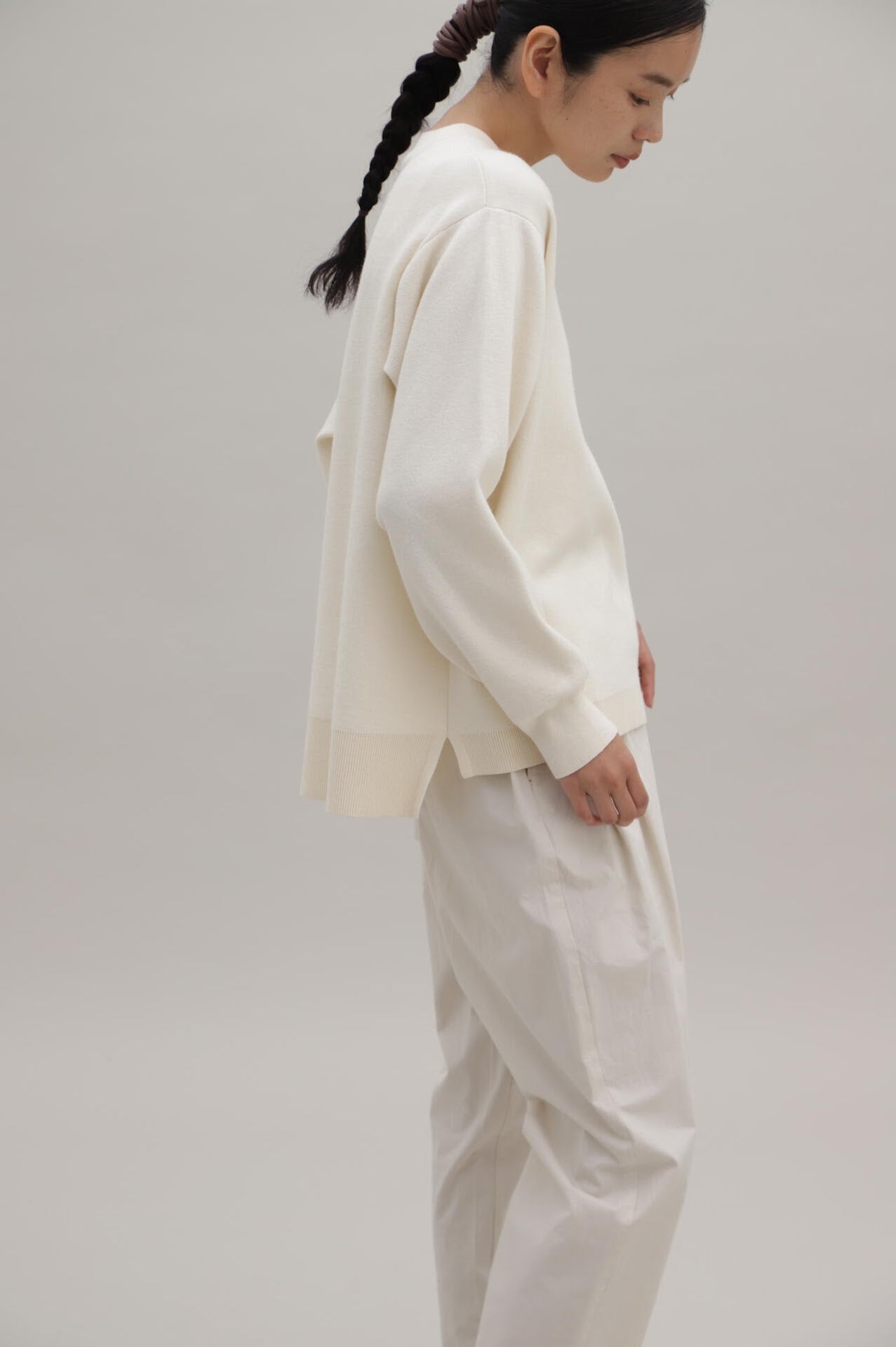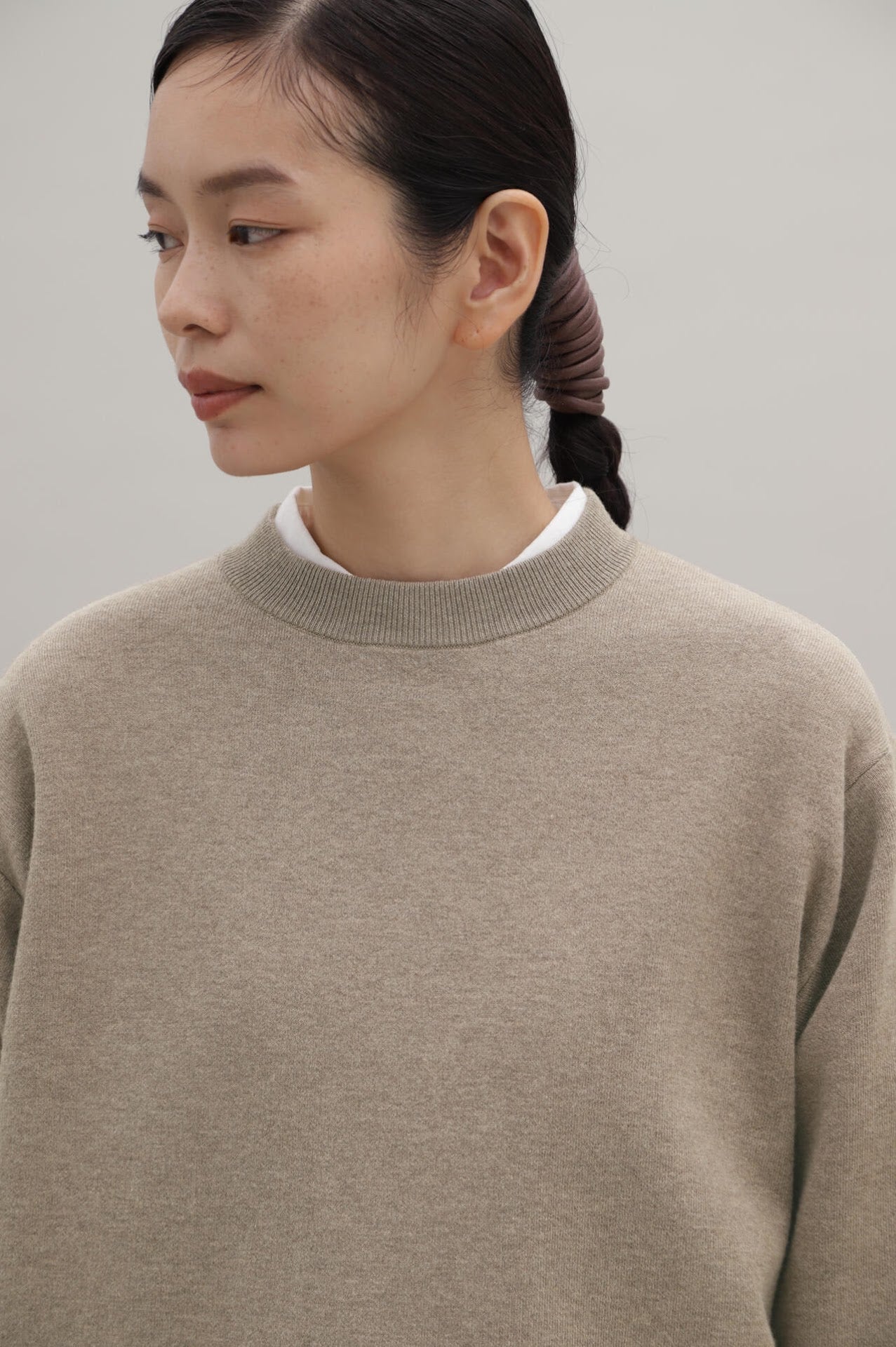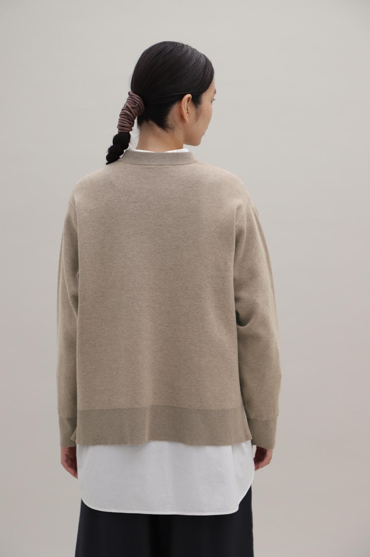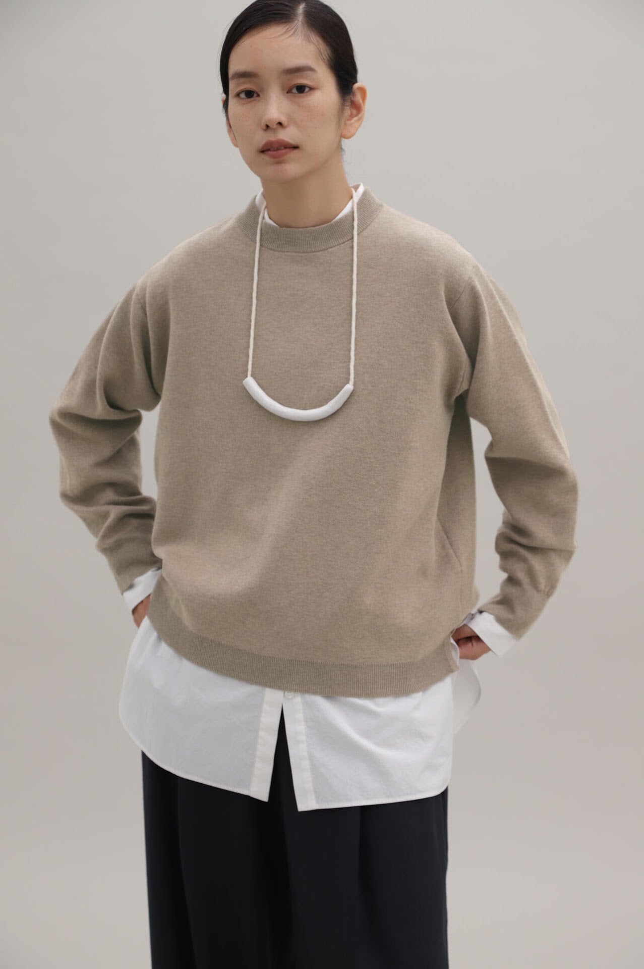 ソフトでとても滑らかな肌触りのトレーナー風ニットは袖が上向きのバンザイをしているようなユニークなデザイン。腕の上げ下げが楽に感じ、腕を下ろしているときは綺麗に収まるwagonaのオリジナルのパターン。顔周りにくる衿ぐりのリブに厚みを持たせ、サイドにはスリット開きのディテールを入れシンプルな中にもニュアンスを出しています。長いシーズン着用できるプルオーバーです。