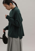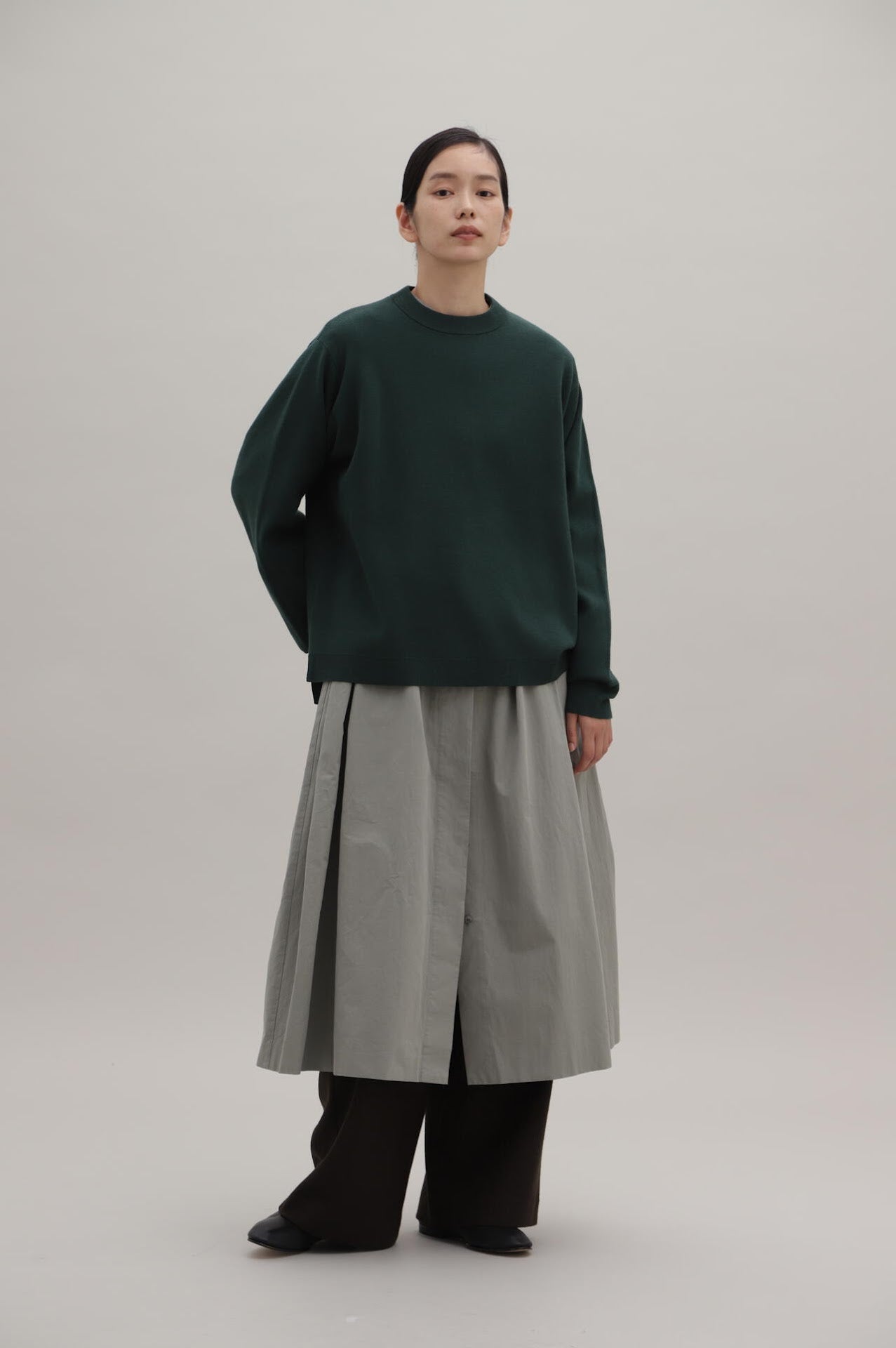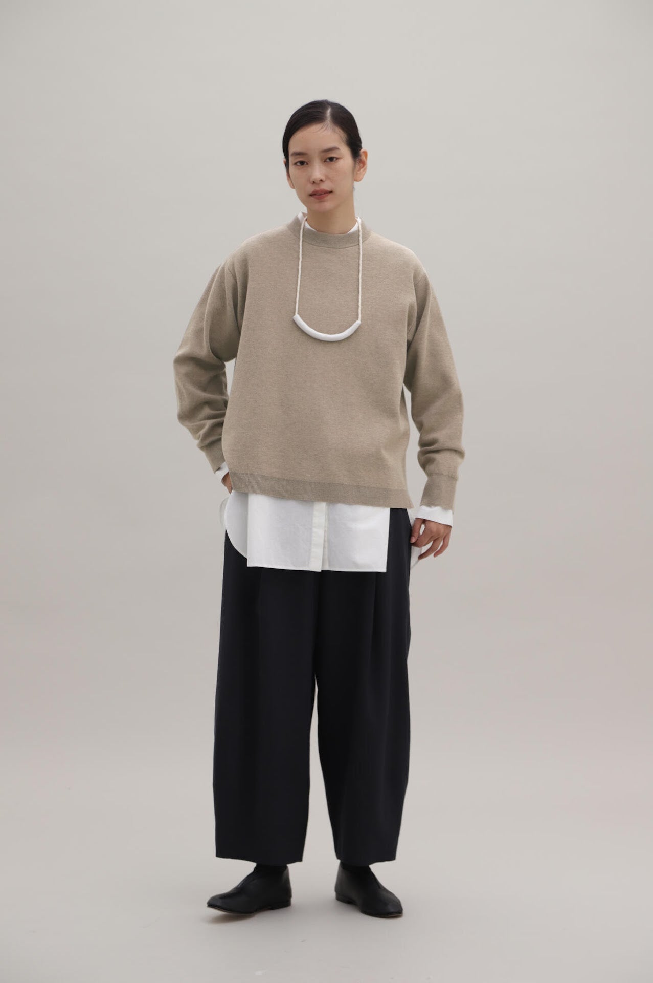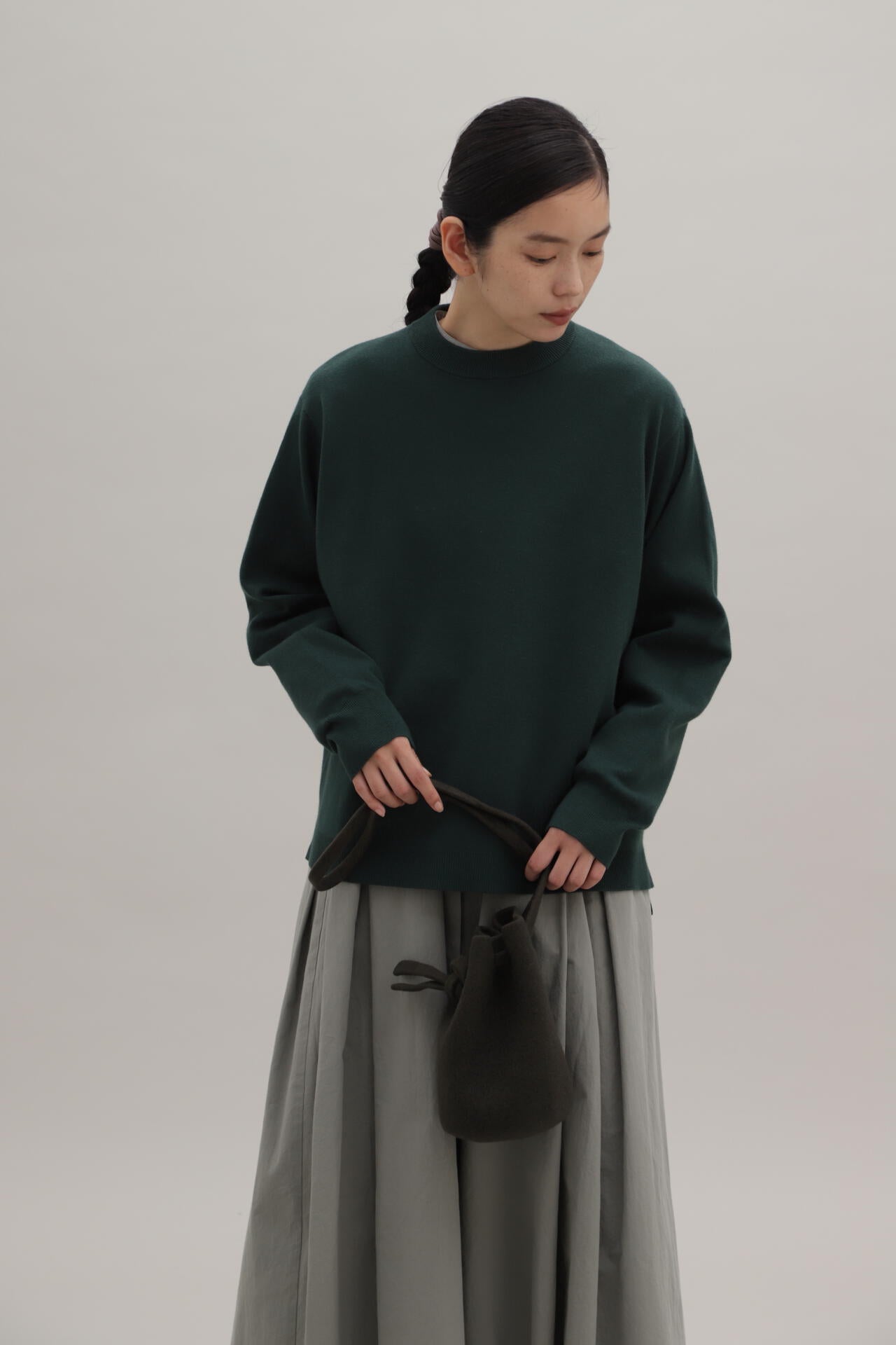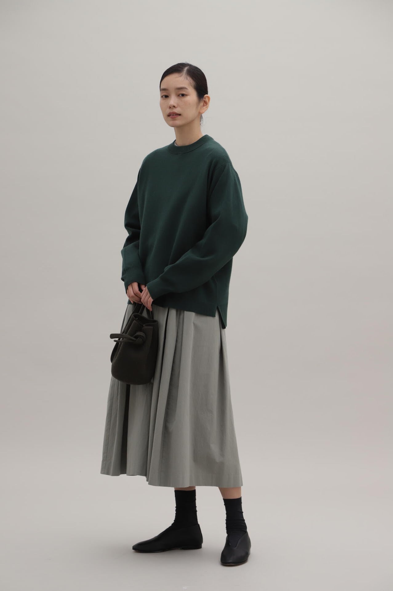 ソフトでとても滑らかな肌触りのトレーナー風ニットは袖が上向きのバンザイをしているようなユニークなデザイン。腕の上げ下げが楽に感じ、腕を下ろしているときは綺麗に収まるwagonaのオリジナルのパターン。顔周りにくる衿ぐりのリブに厚みを持たせ、サイドにはスリット開きのディテールを入れシンプルな中にもニュアンスを出しています。長いシーズン着用できるプルオーバーです。