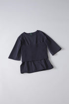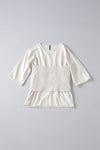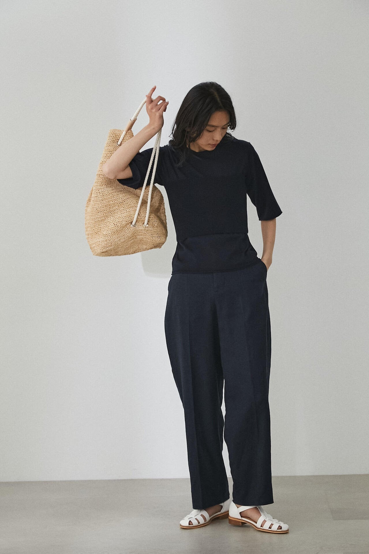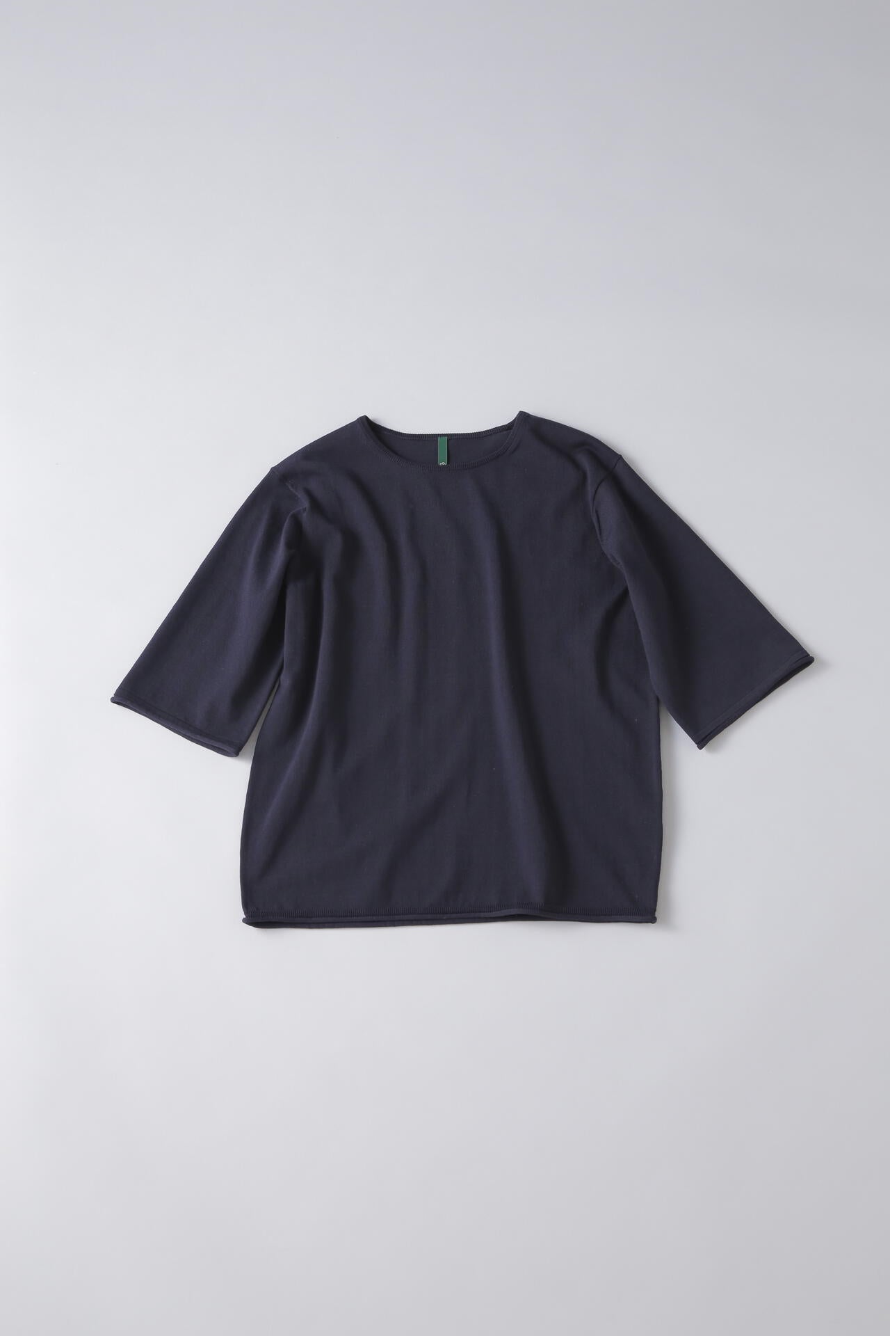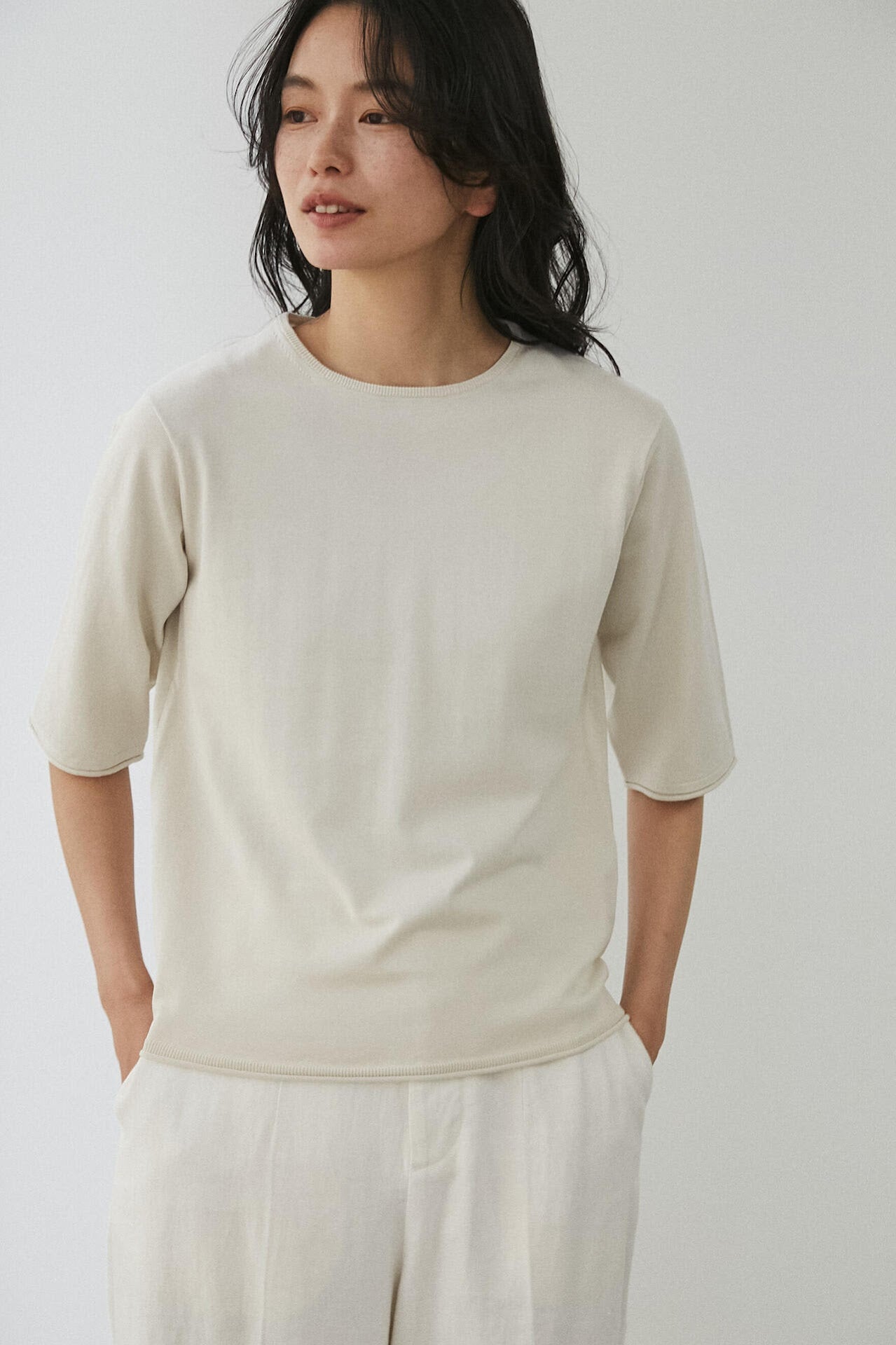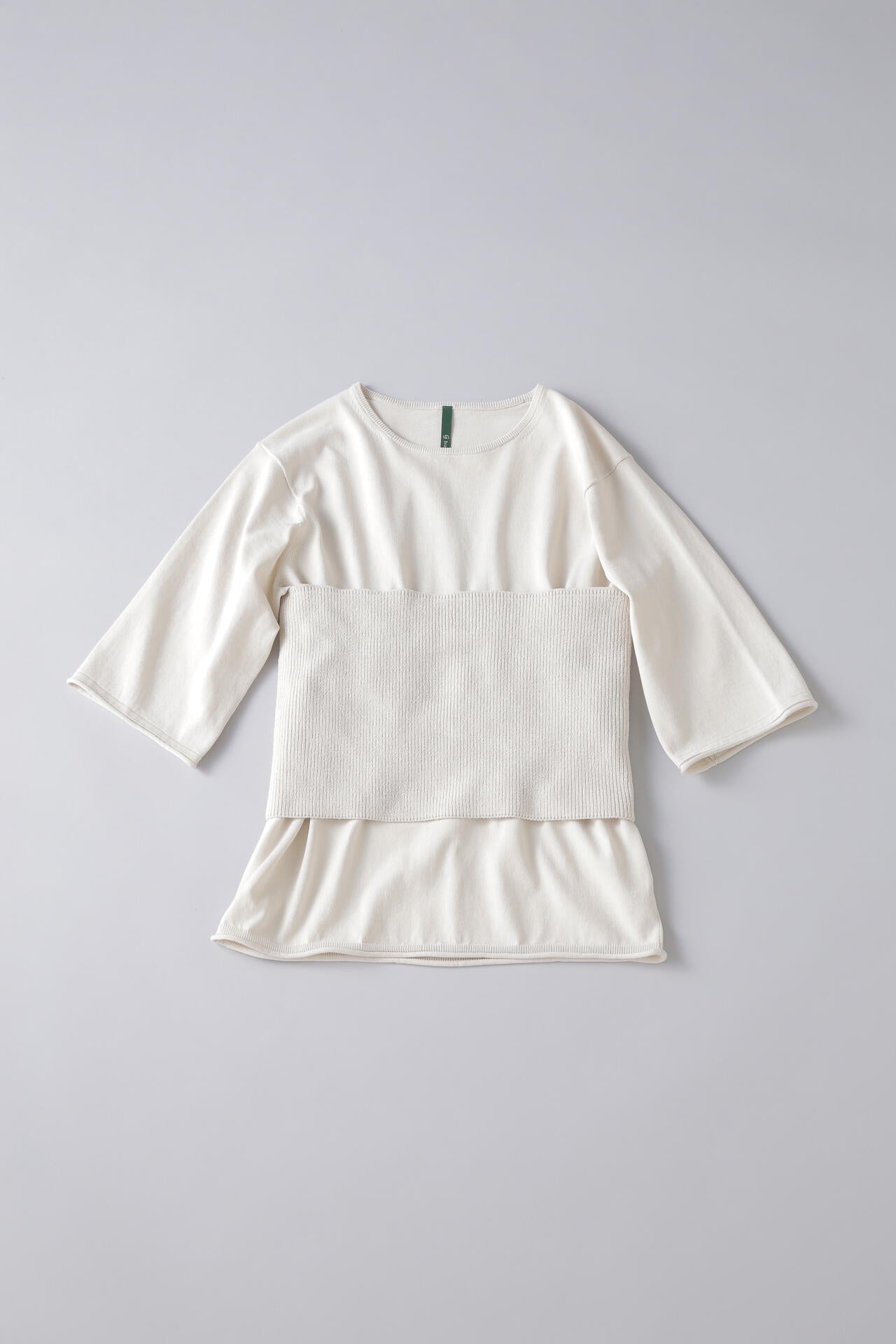 高密度で目面の美しいシンプルなプルオーバーと、同じ糸を多本どりして片畔に編みたてたチューブトップのセットアップです。プルオーバーはシンプルなシルエットで襟元の附属を細く仕上げて大人っぽい仕上がりです。チューブトップは締め付けも少なく丁度よいバランスです。
