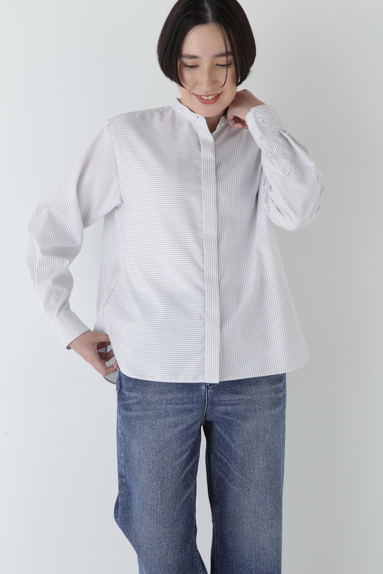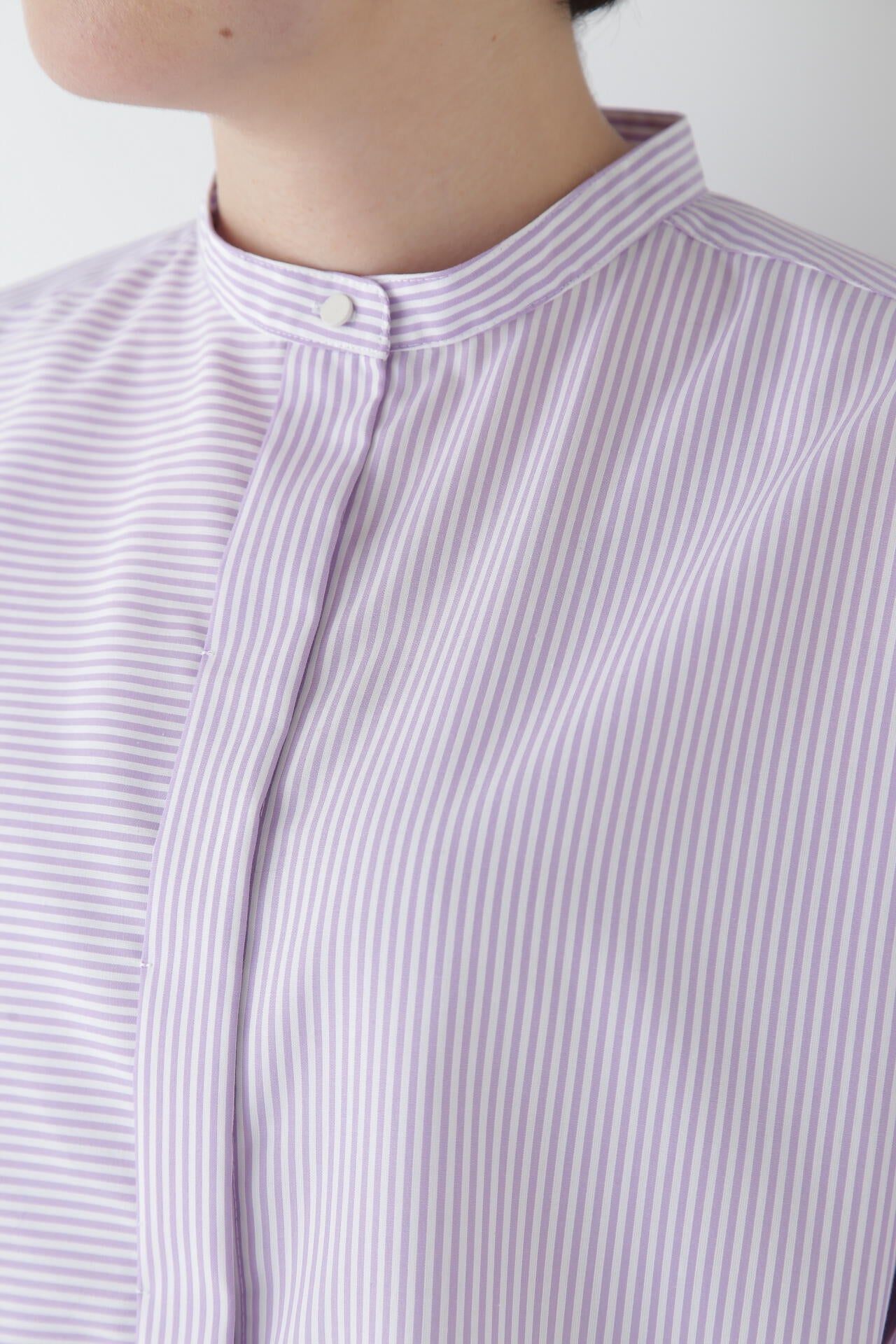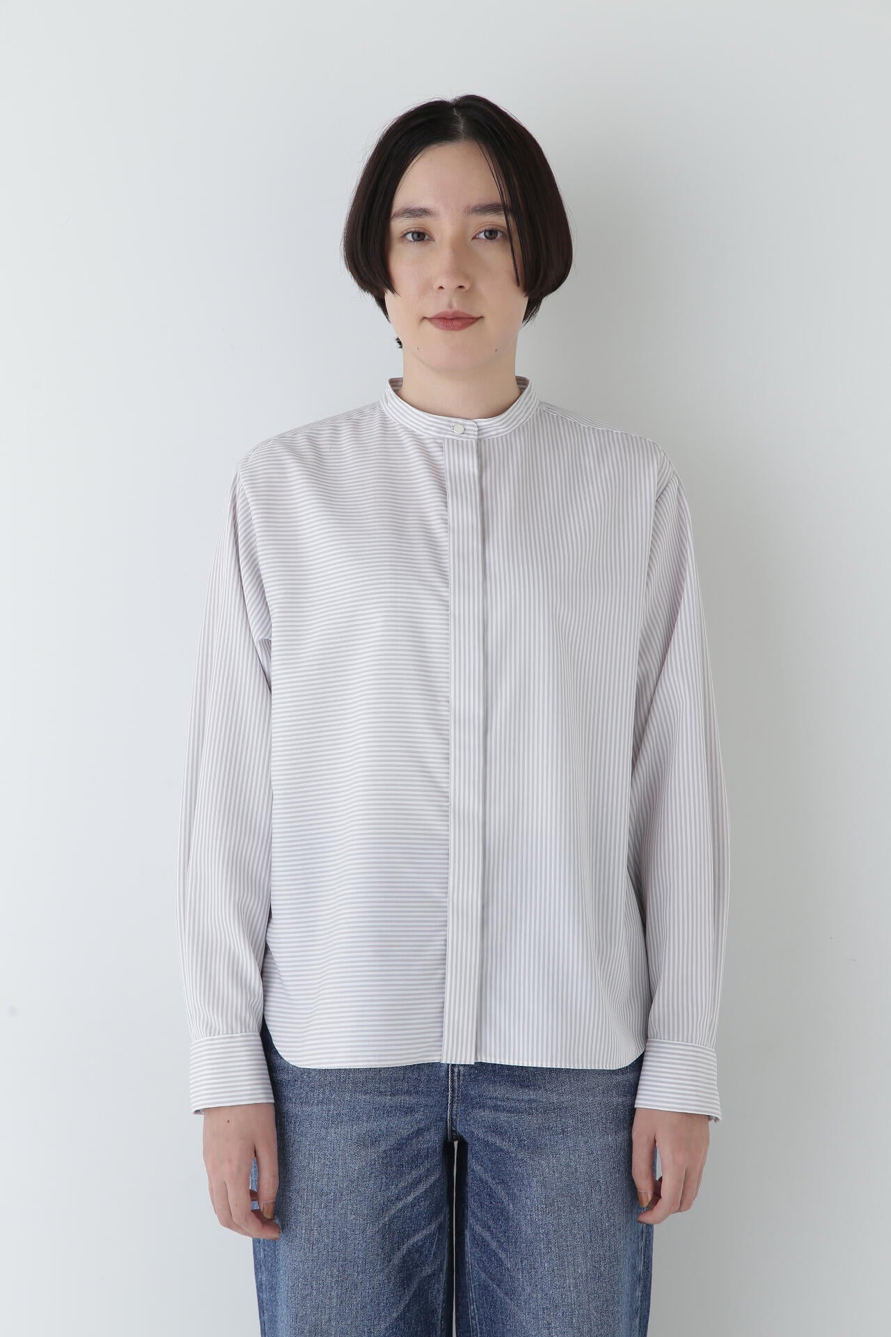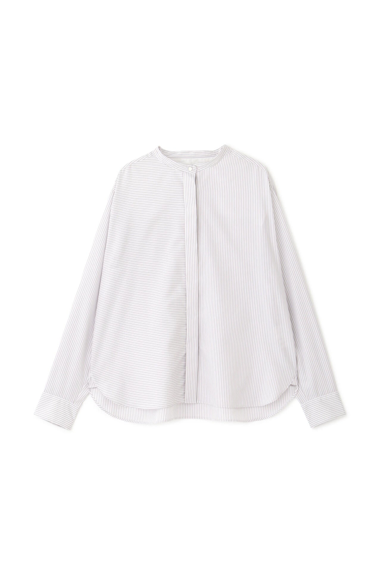 シンプルながらも、ストライプの地の目を変えて前身頃をアシンメトリーに見せたバンドカラーシャツです。