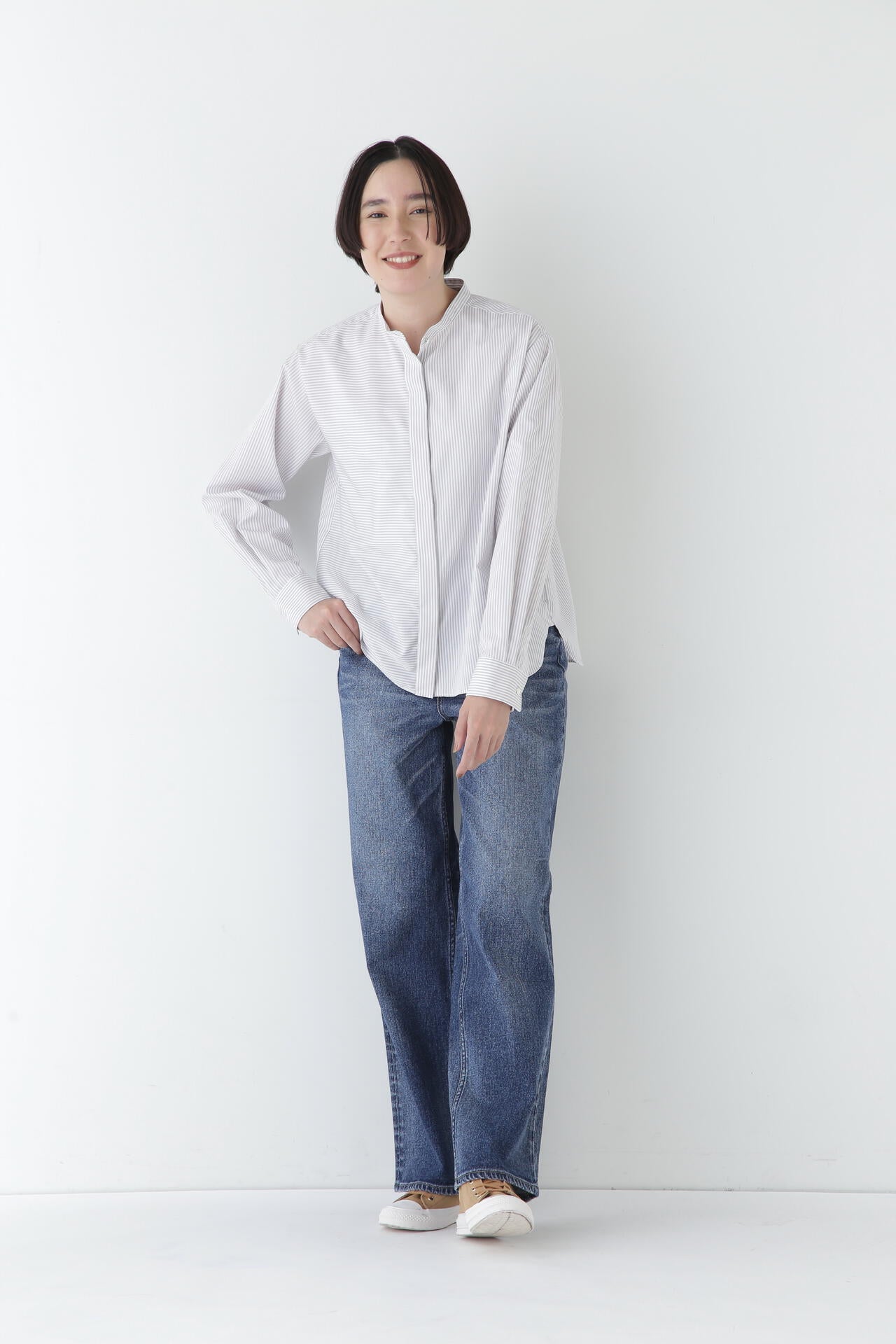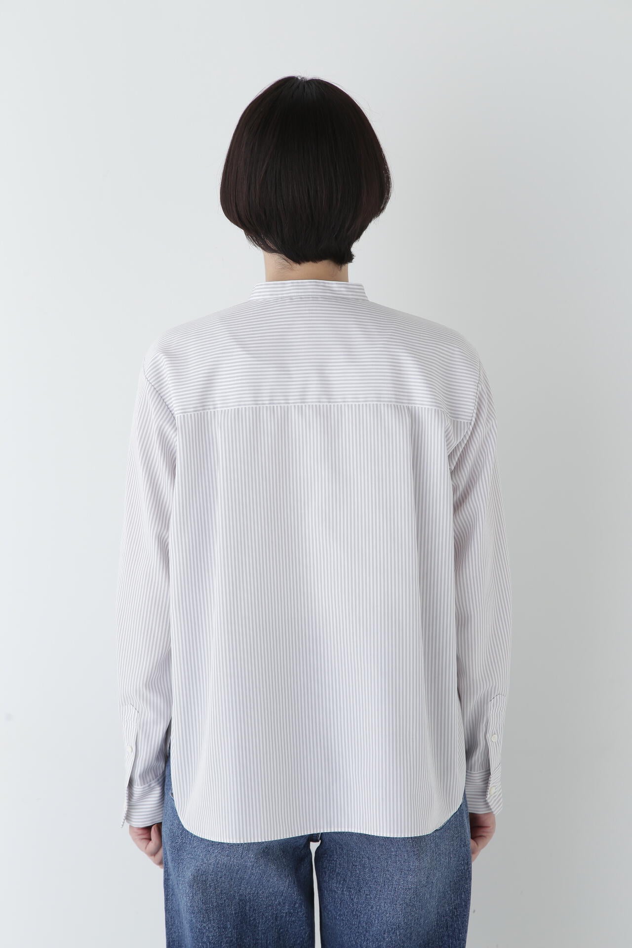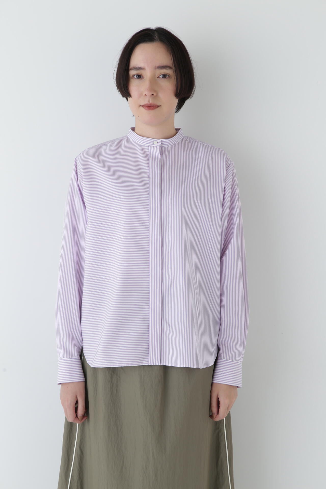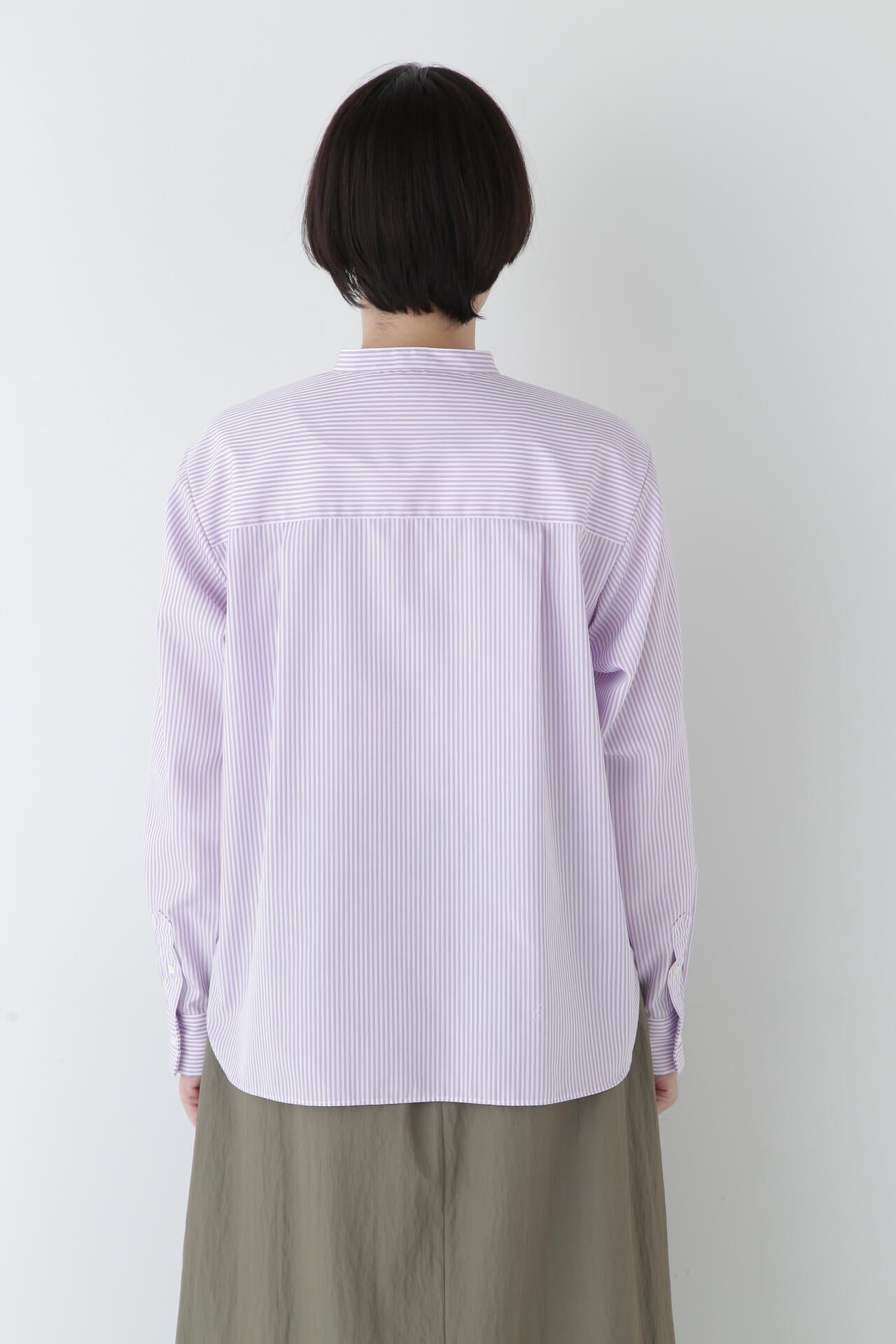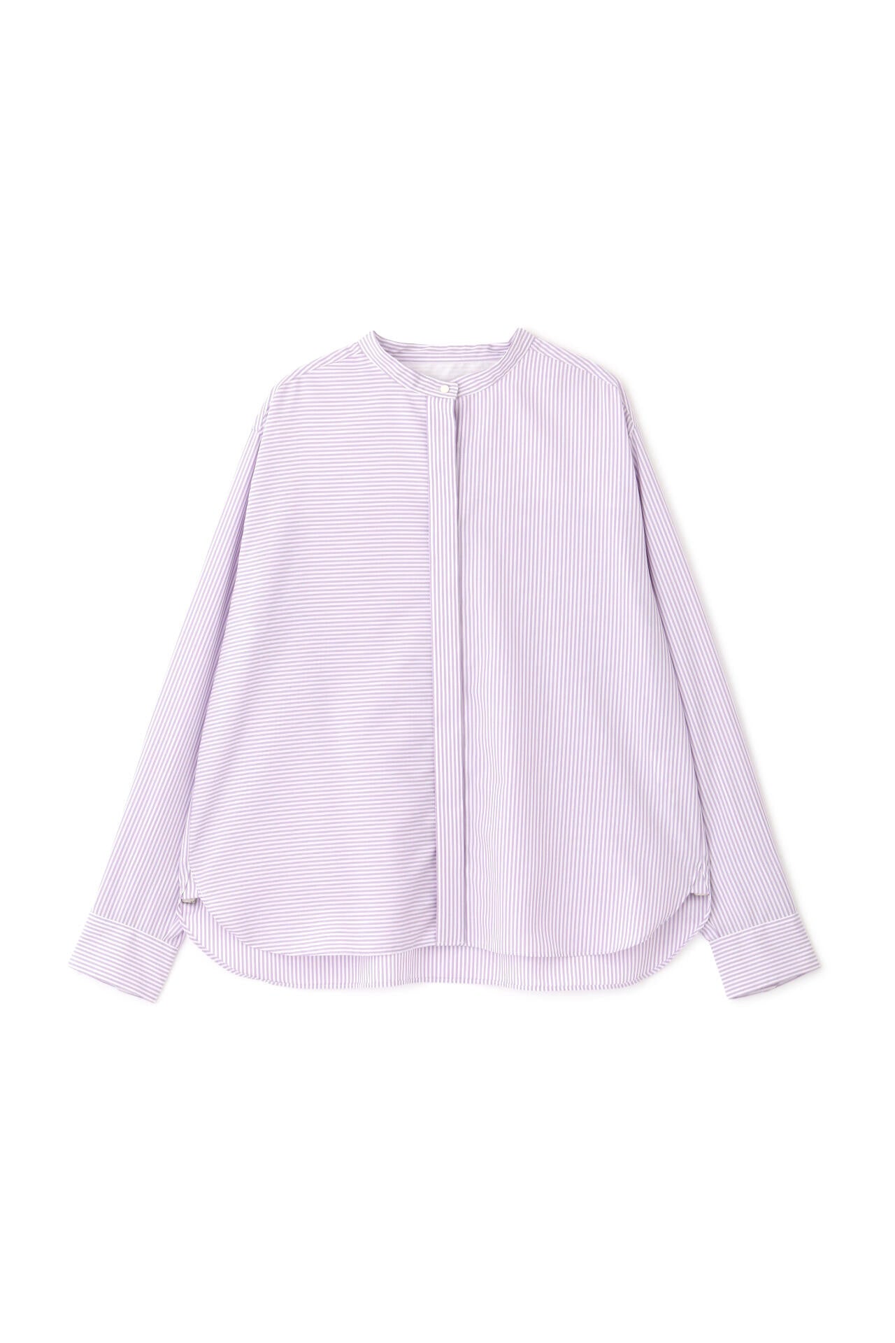 シンプルながらも、ストライプの地の目を変えて前身頃をアシンメトリーに見せたバンドカラーシャツです。