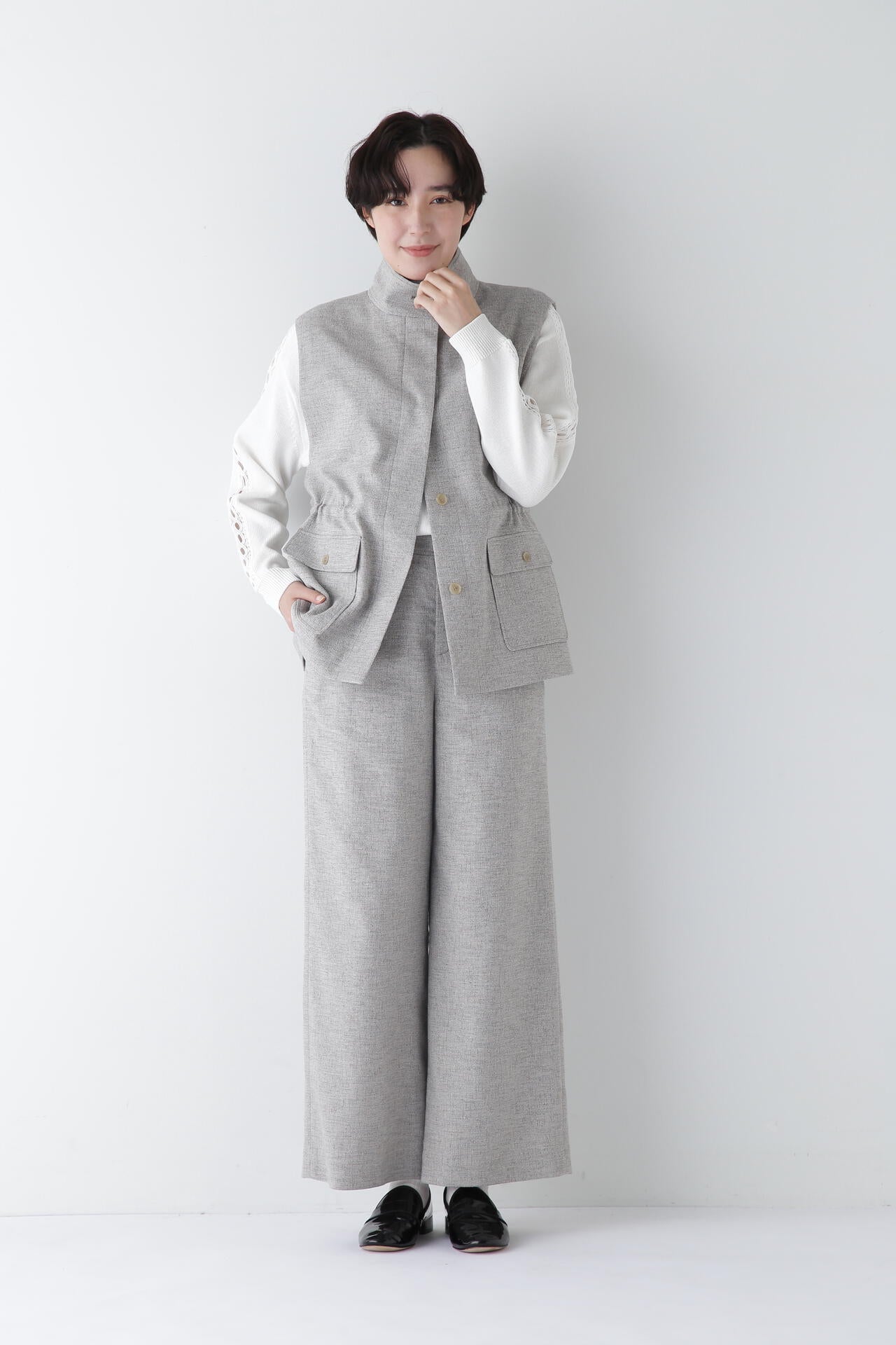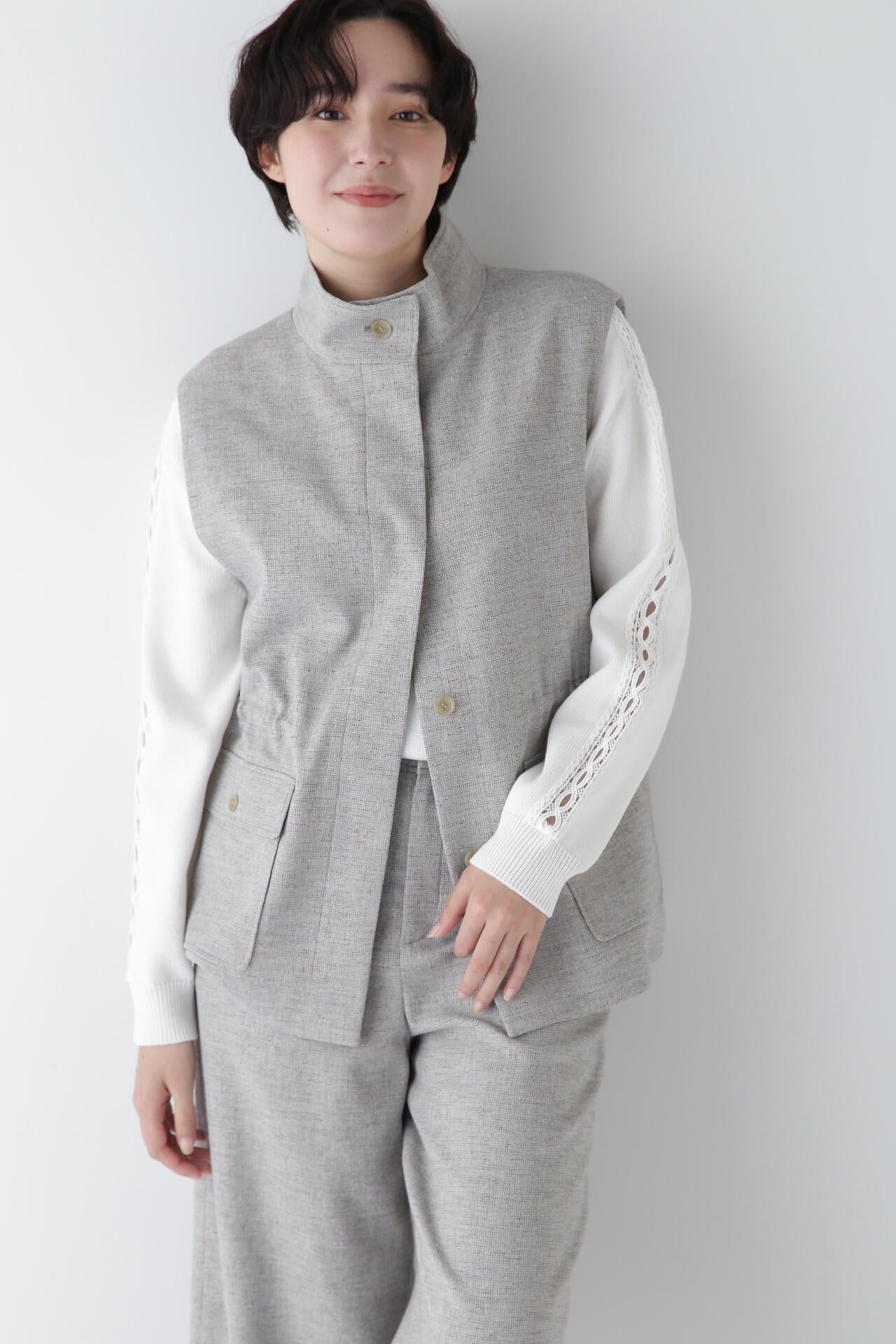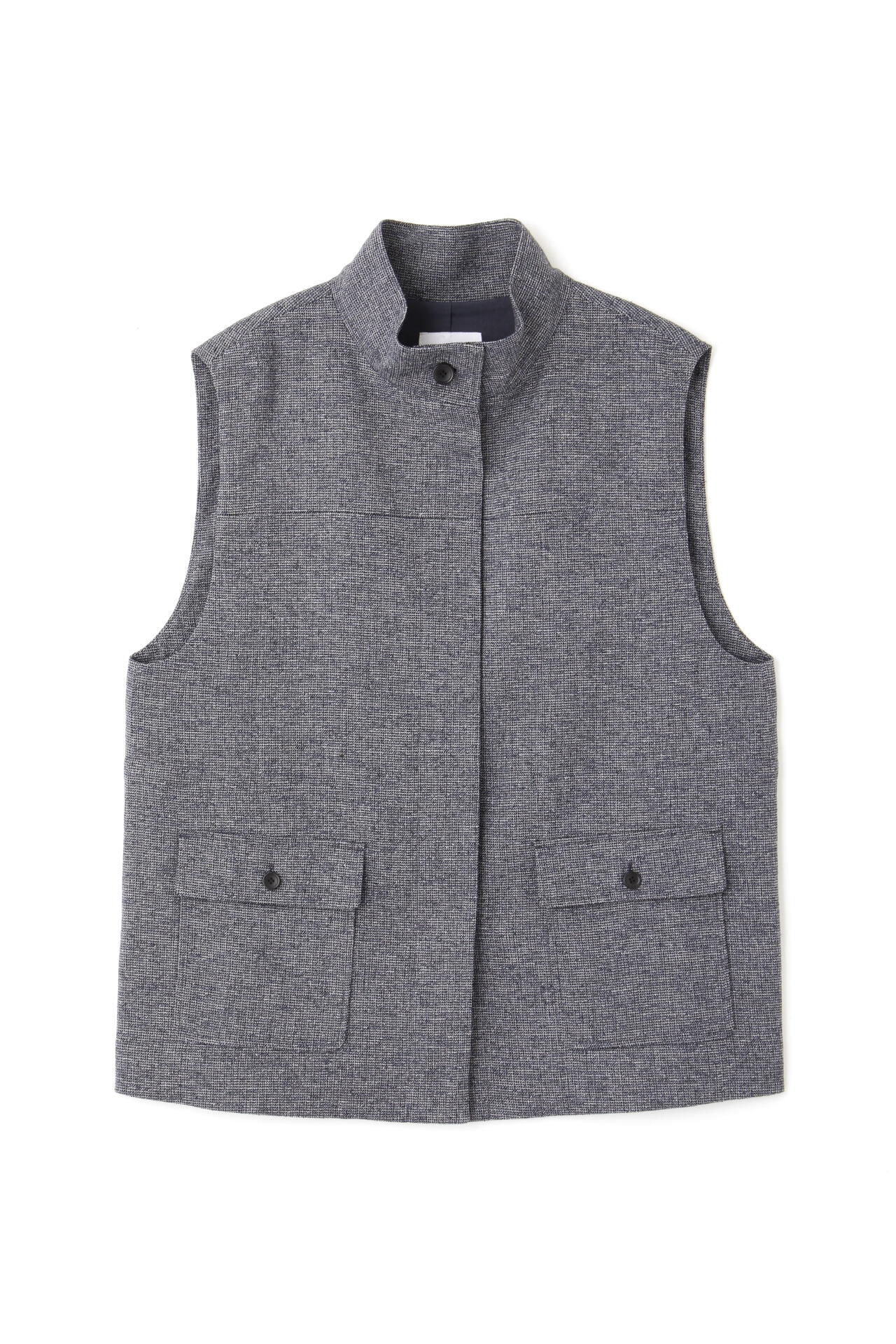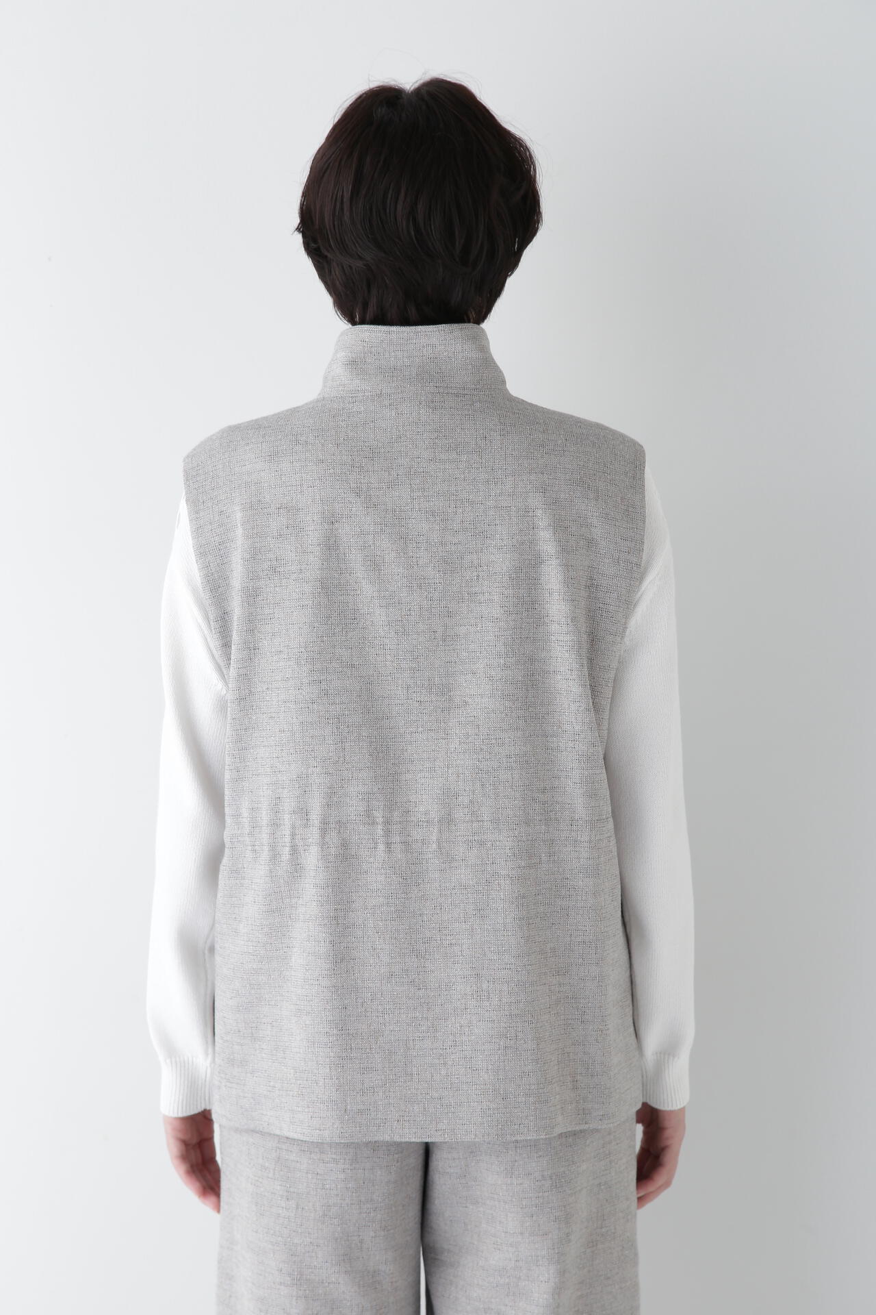 スポーティーなアノラックディテールのツィードジレです。身頃ウエスト裏の杉綾テープをドロストすることで、シルエット変化も楽しめます。