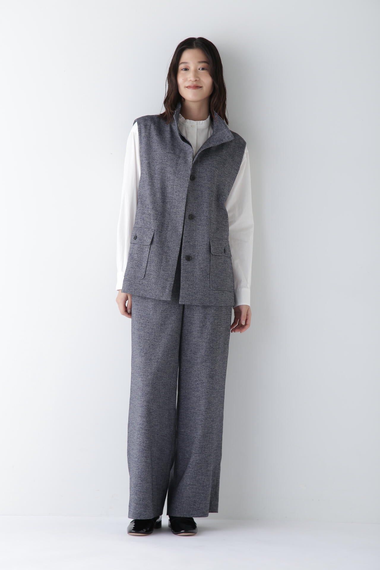 リング糸の程よい凹凸感とメランジ見えのカラーバランスが上品なTRツィードを使用しています。ツィード見えながらもドライタッチでさらっとした清涼感のあるタッチに仕上げています。