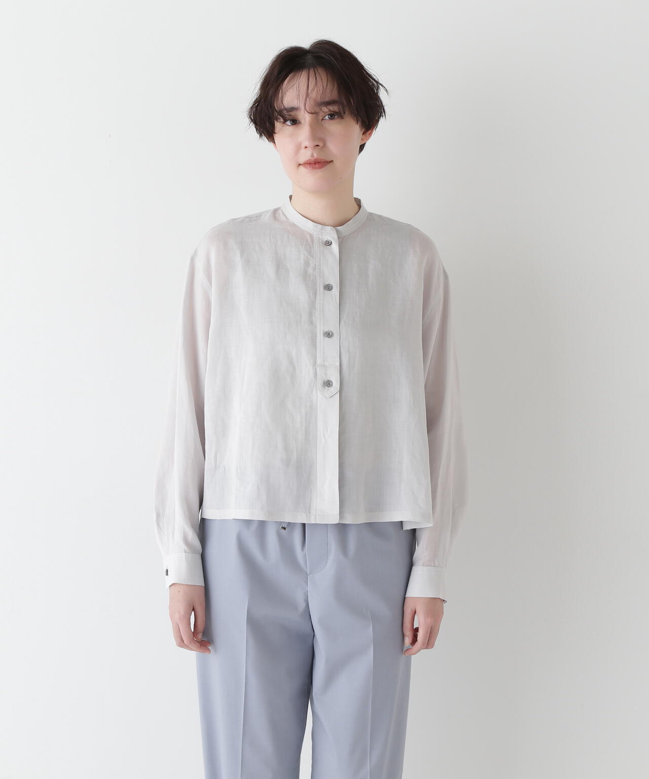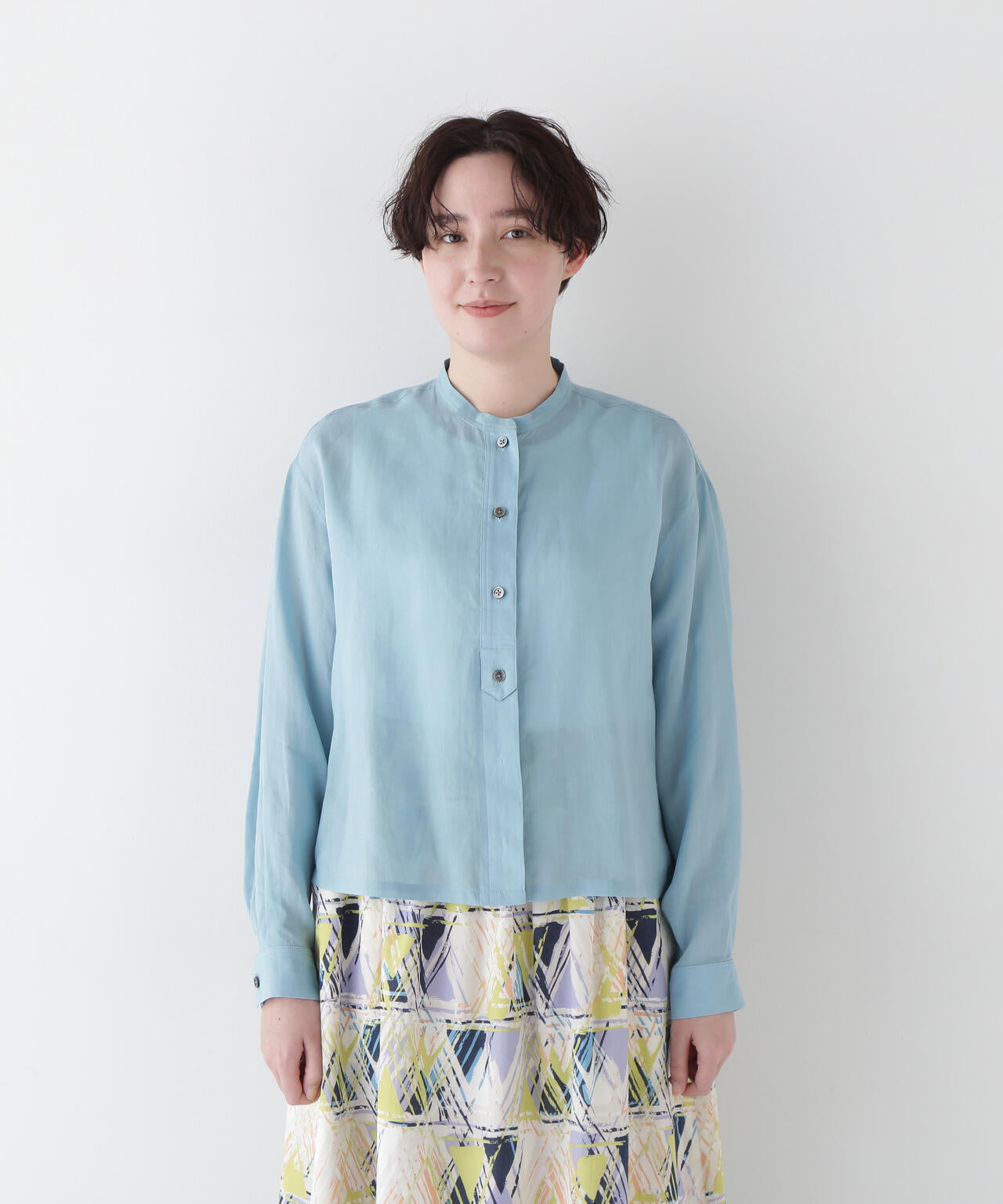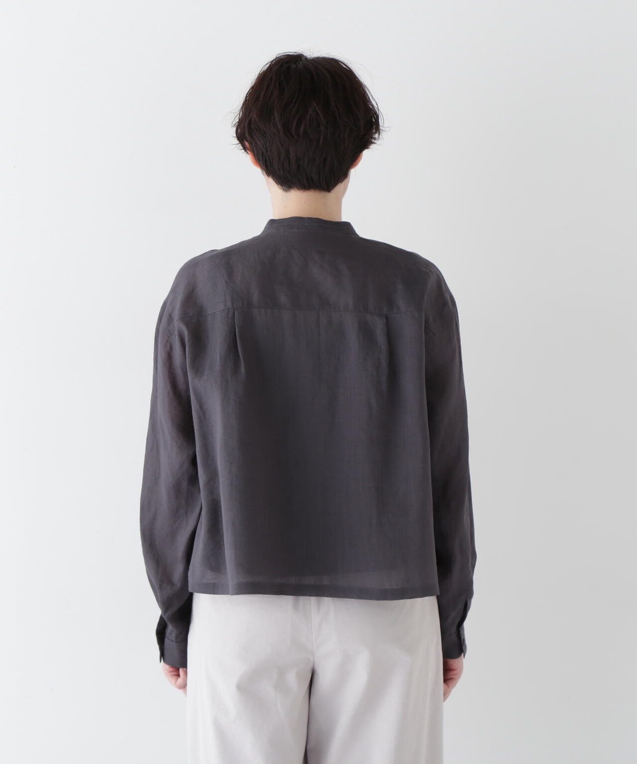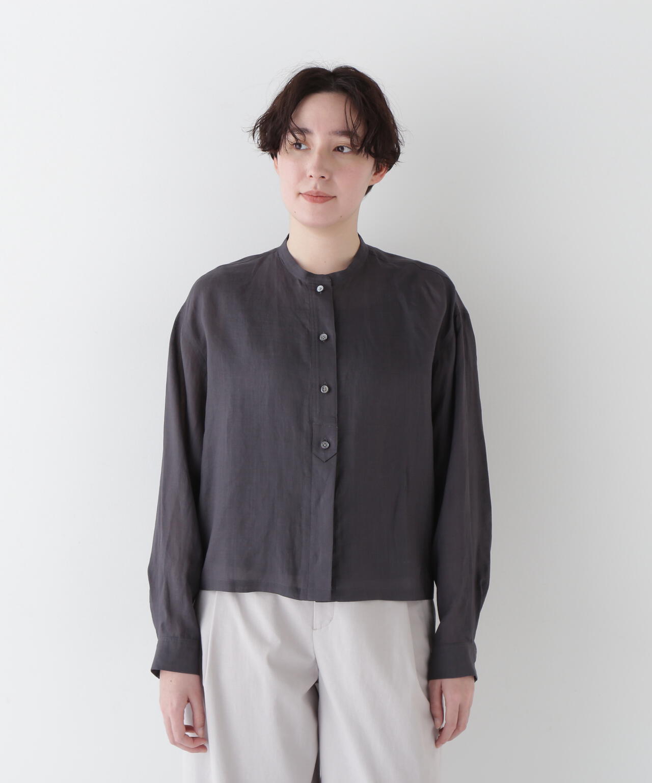 human woman定番のラミー素材を使用しショート丈のバンドカラーブラウスです。肌離れするボックスシルエットと、フロントに見えてくる太めの前立てがポイントです。