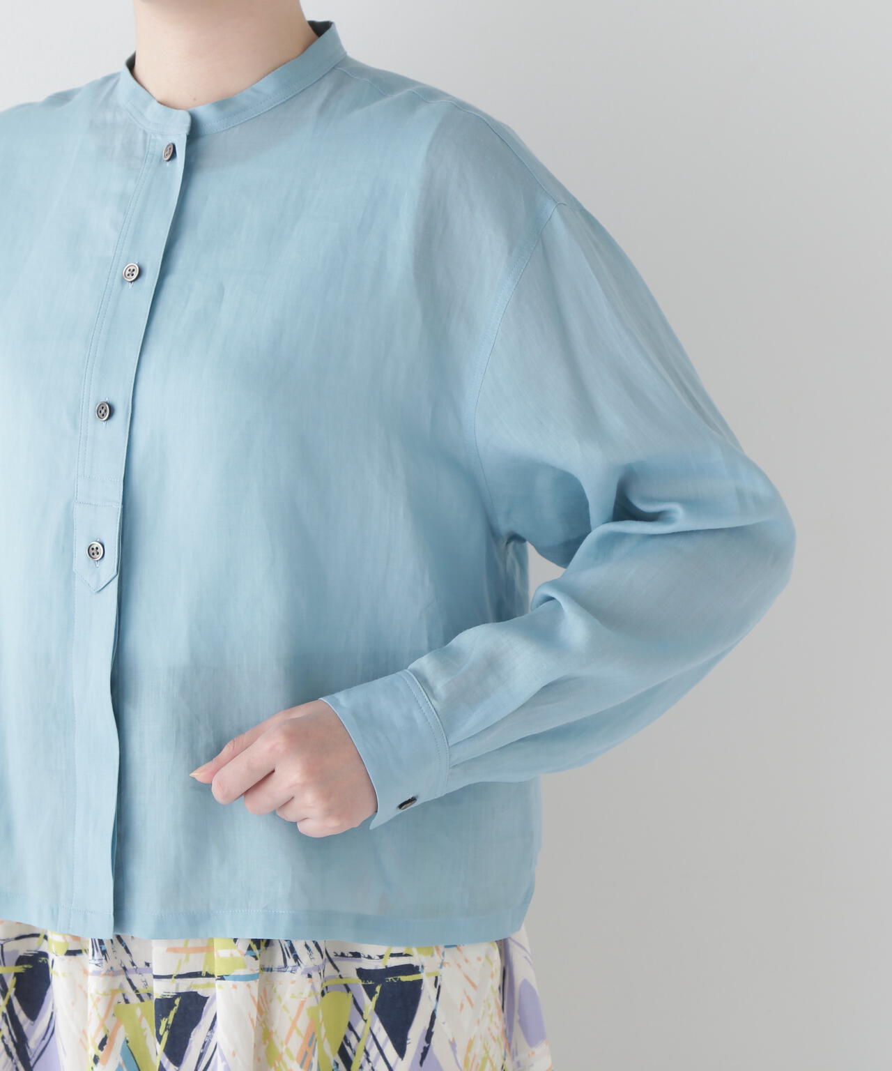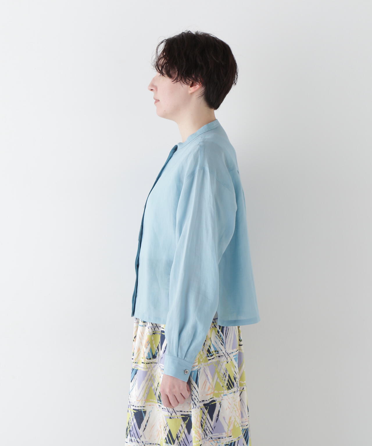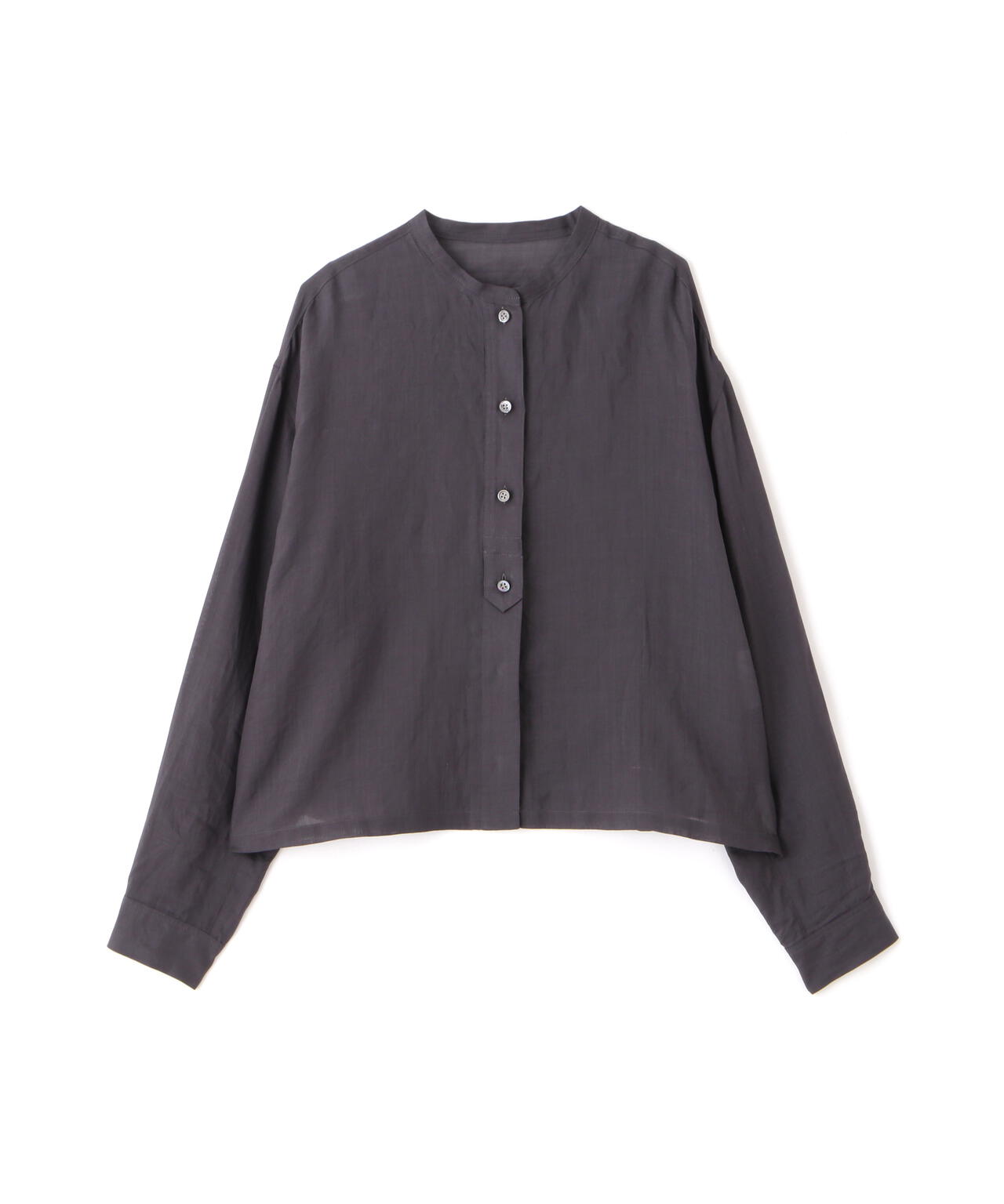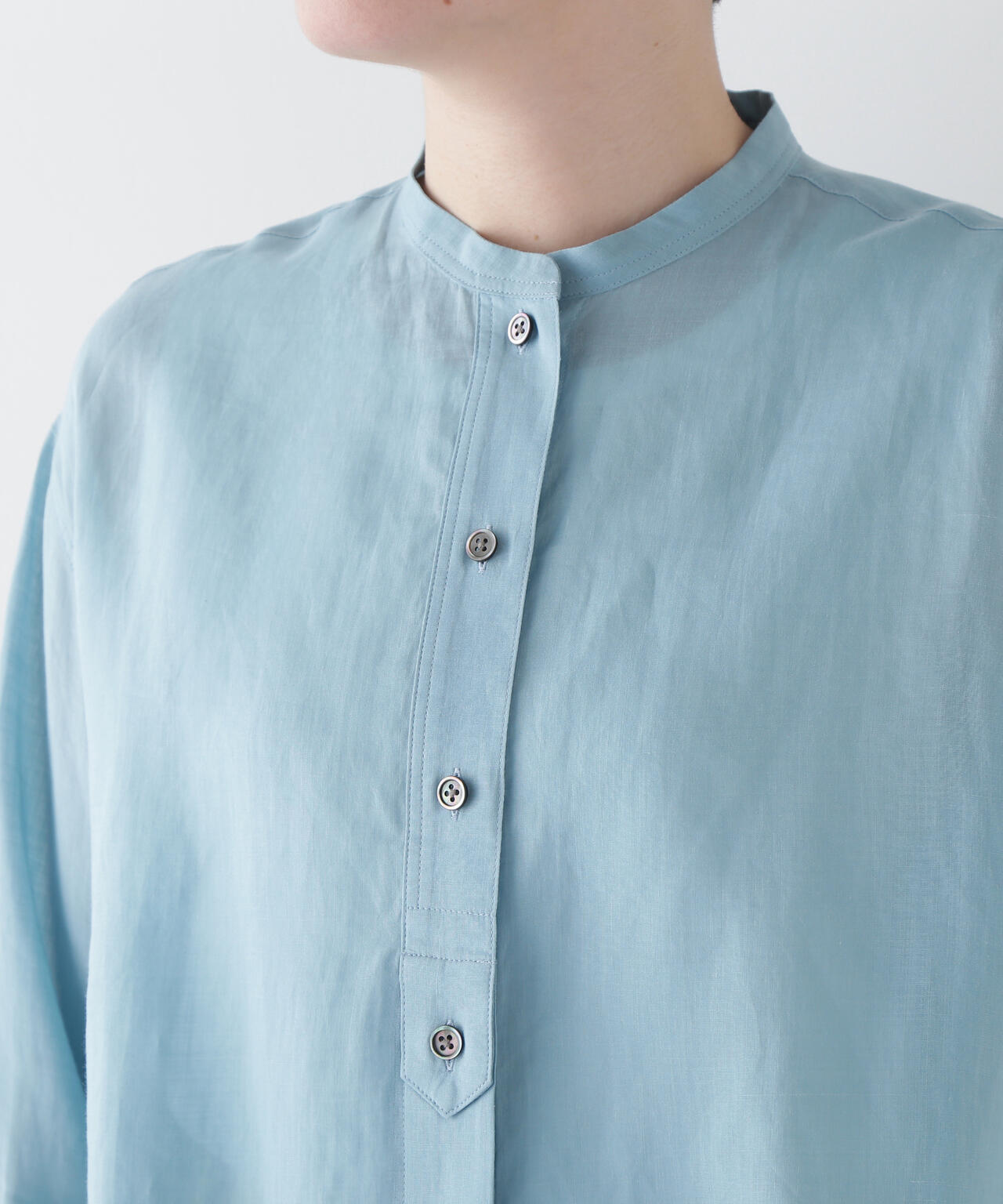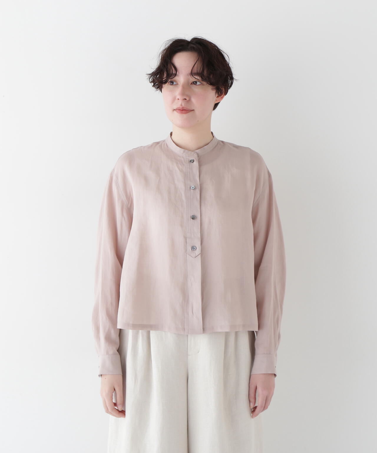 human woman定番のラミー素材を使用しショート丈のバンドカラーブラウスです。肌離れするボックスシルエットと、フロントに見えてくる太めの前立てがポイントです。
