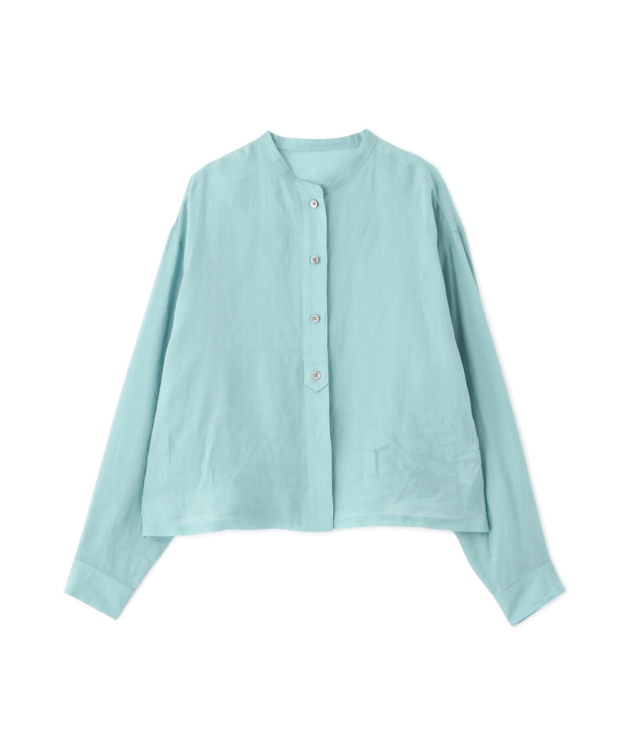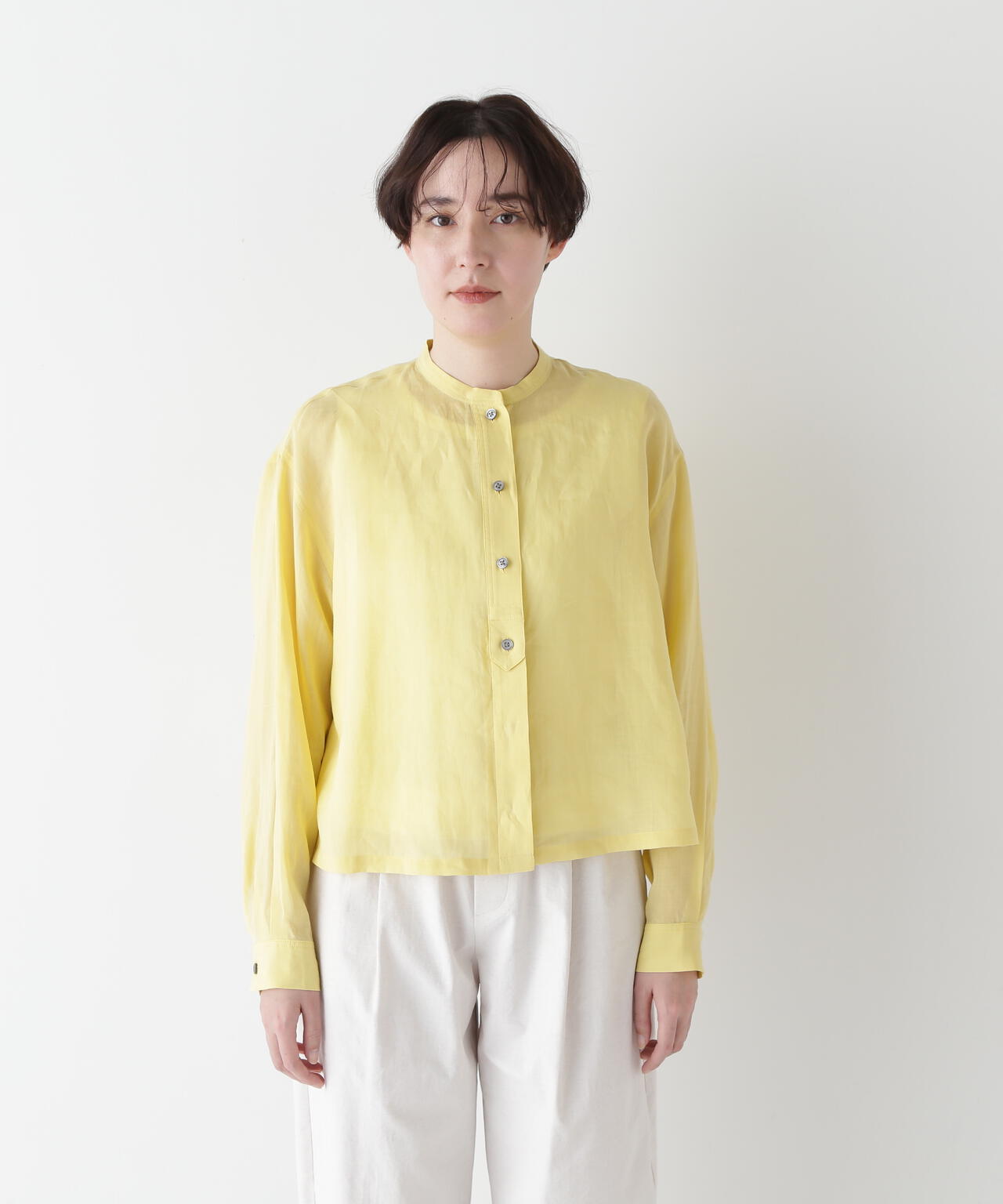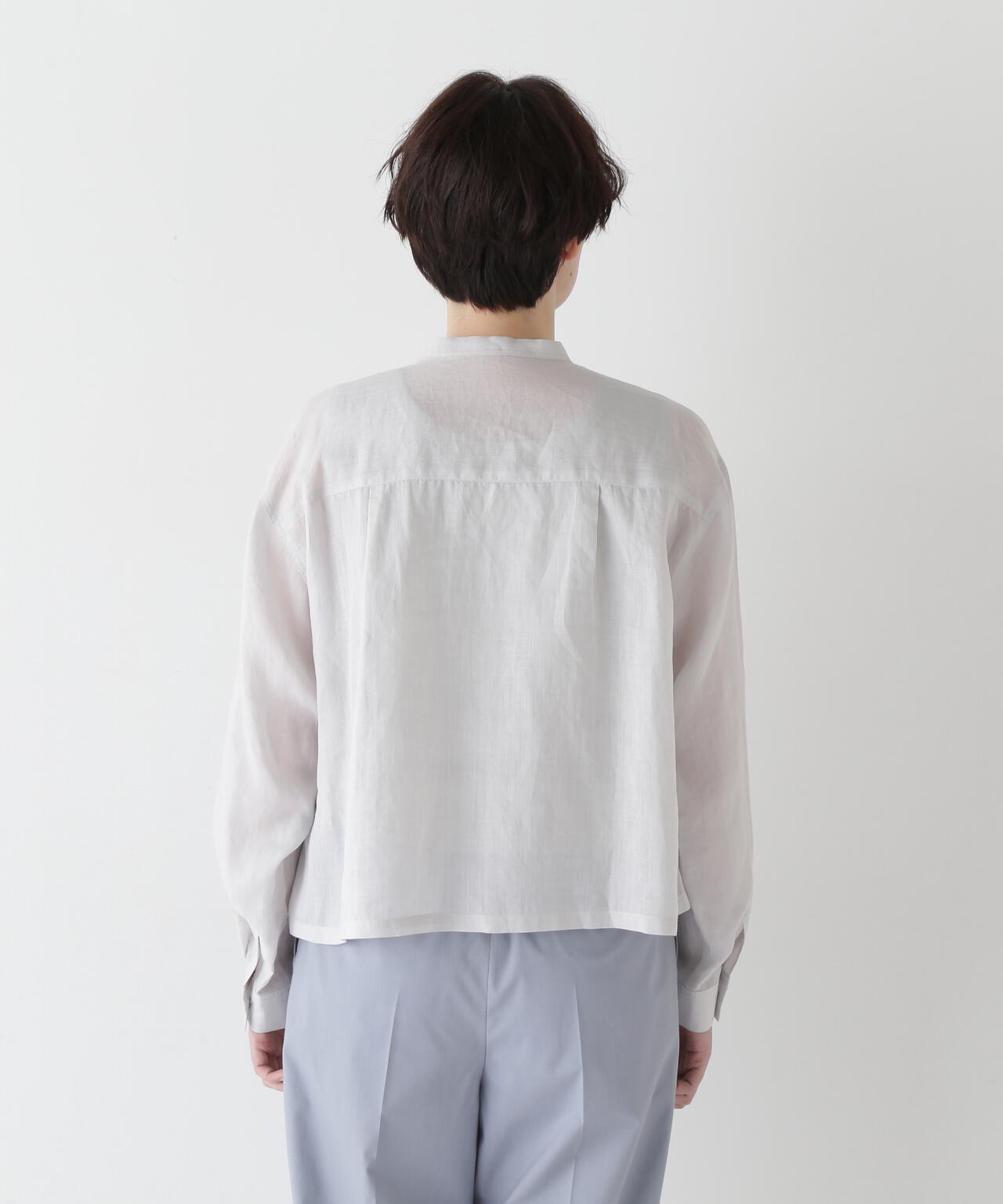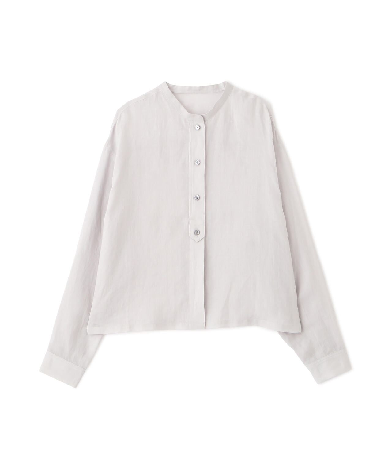 human woman定番のラミー素材を使用しショート丈のバンドカラーブラウスです。肌離れするボックスシルエットと、フロントに見えてくる太めの前立てがポイントです。