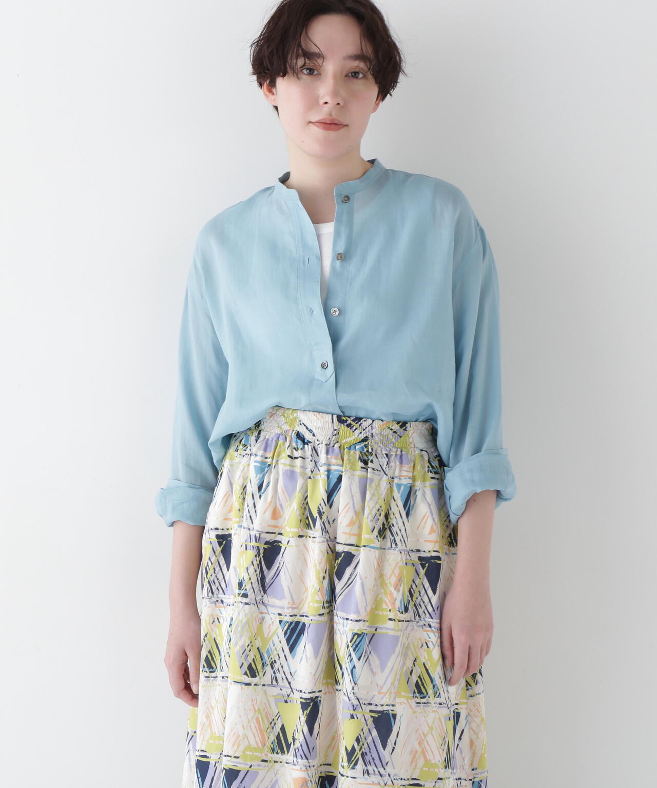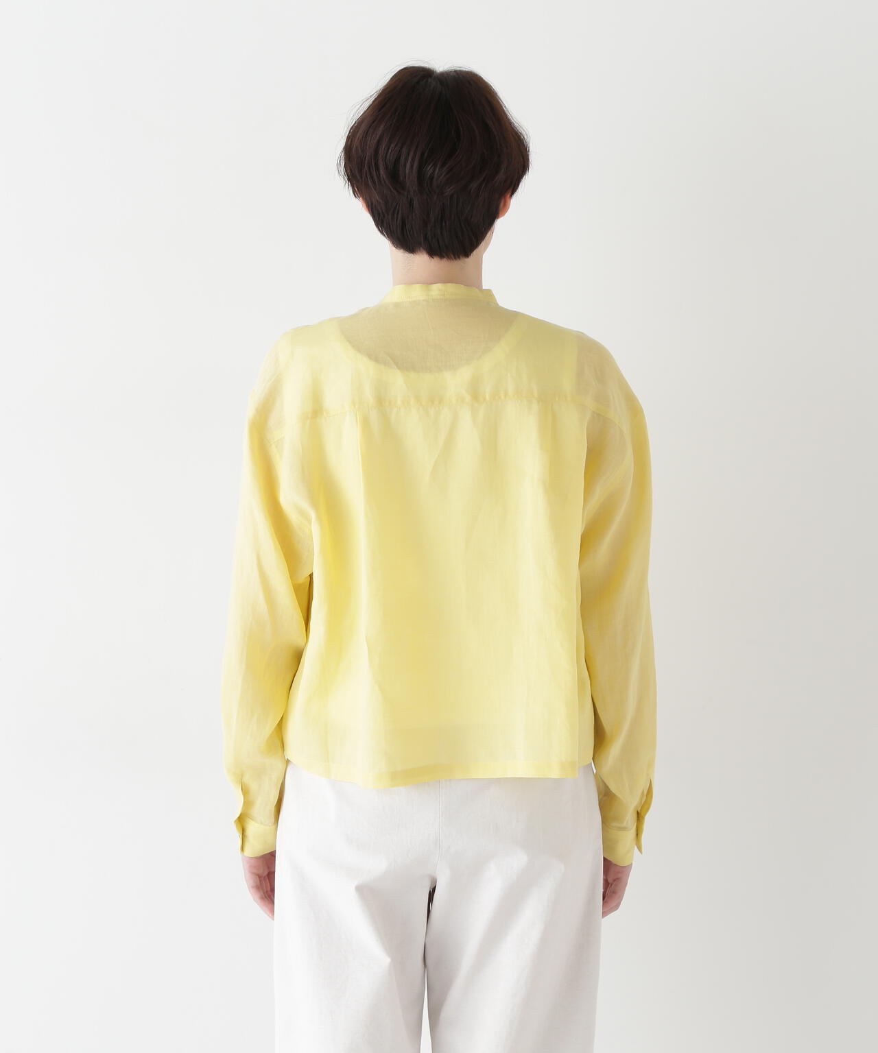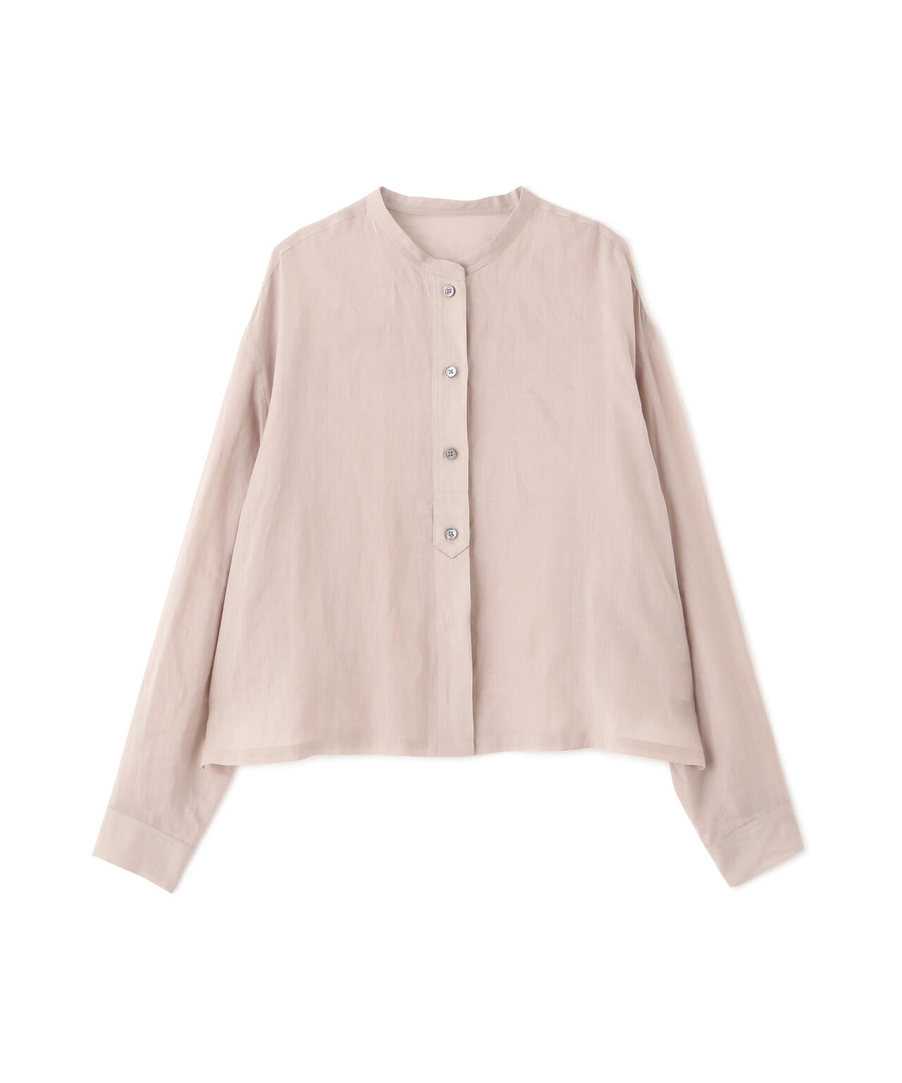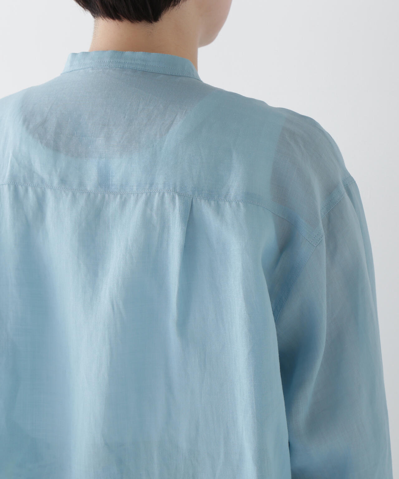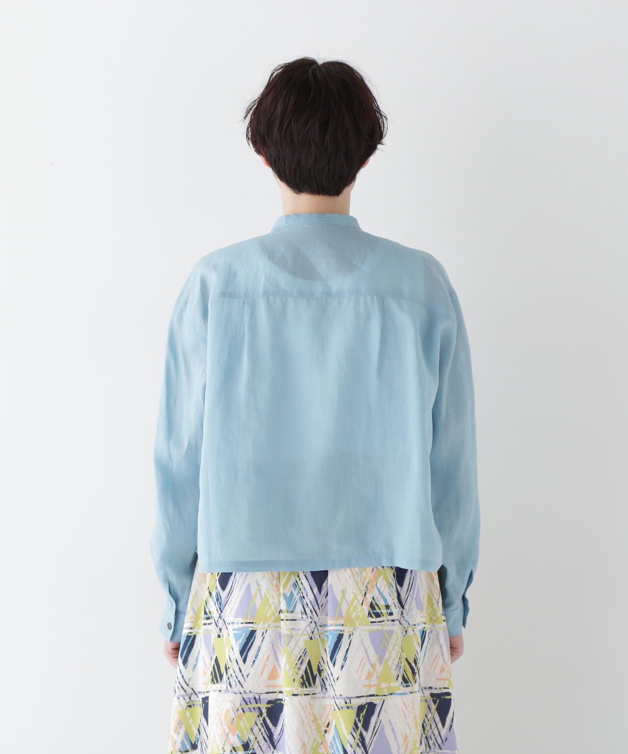 human woman定番のラミー素材を使用しショート丈のバンドカラーブラウスです。肌離れするボックスシルエットと、フロントに見えてくる太めの前立てがポイントです。