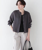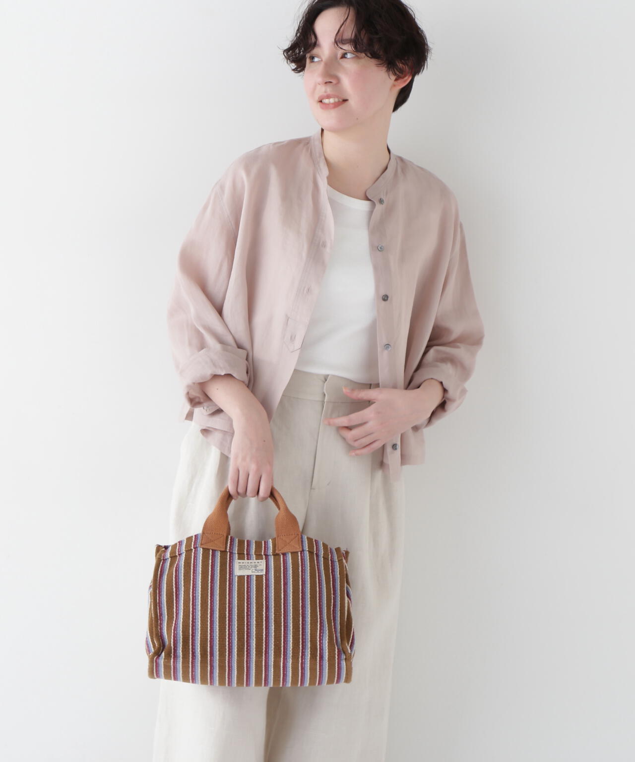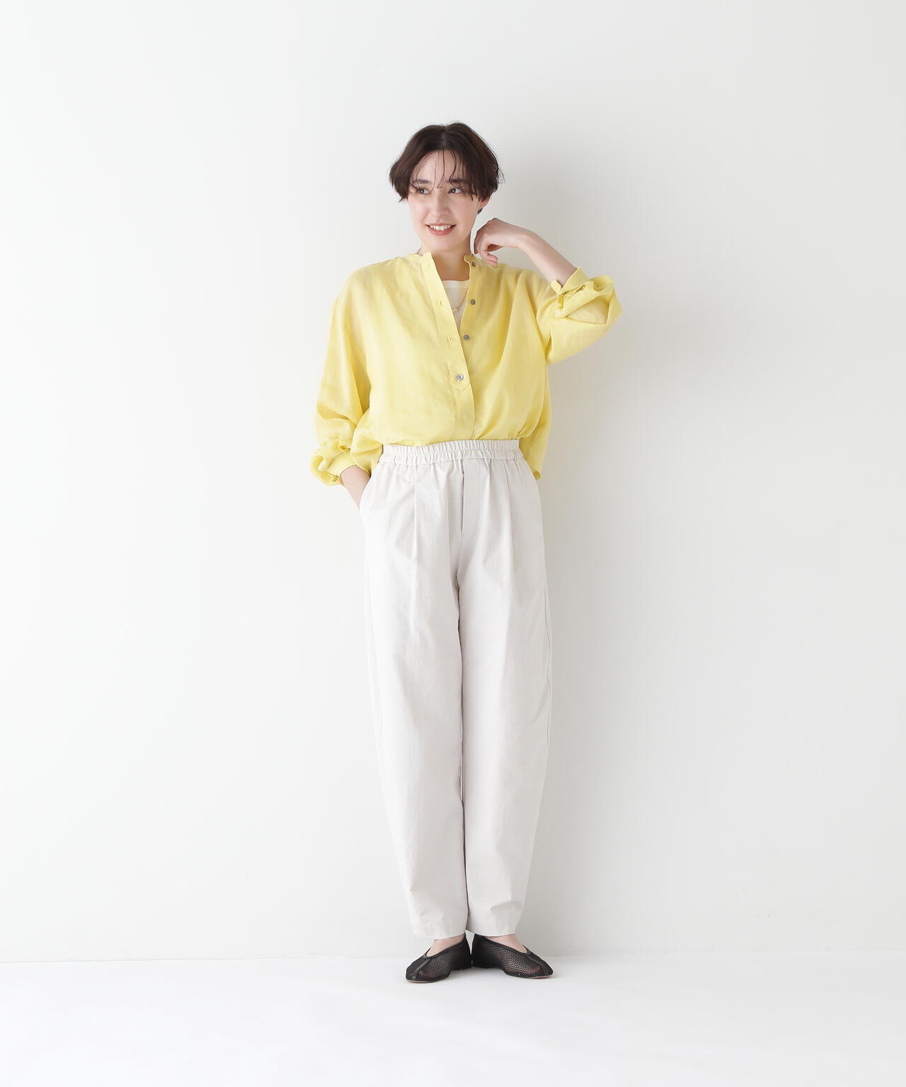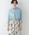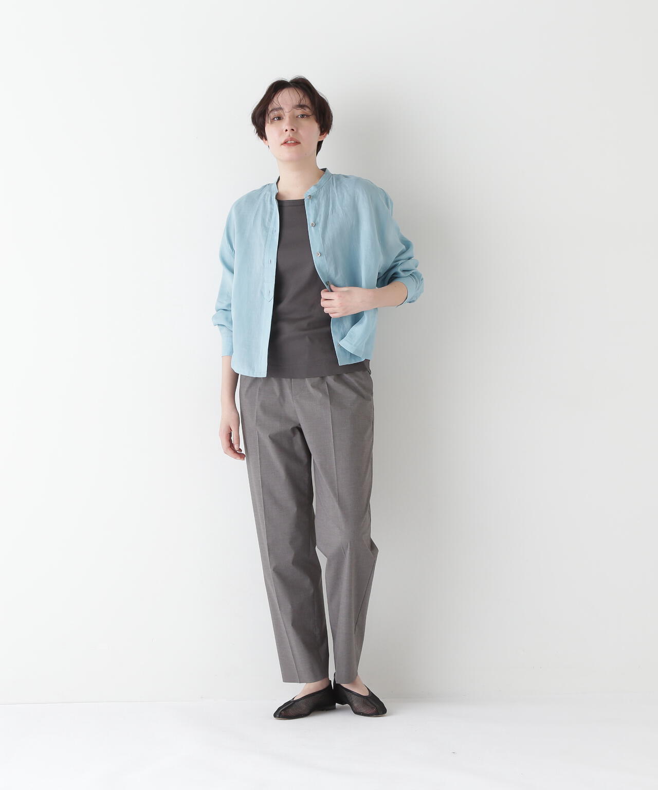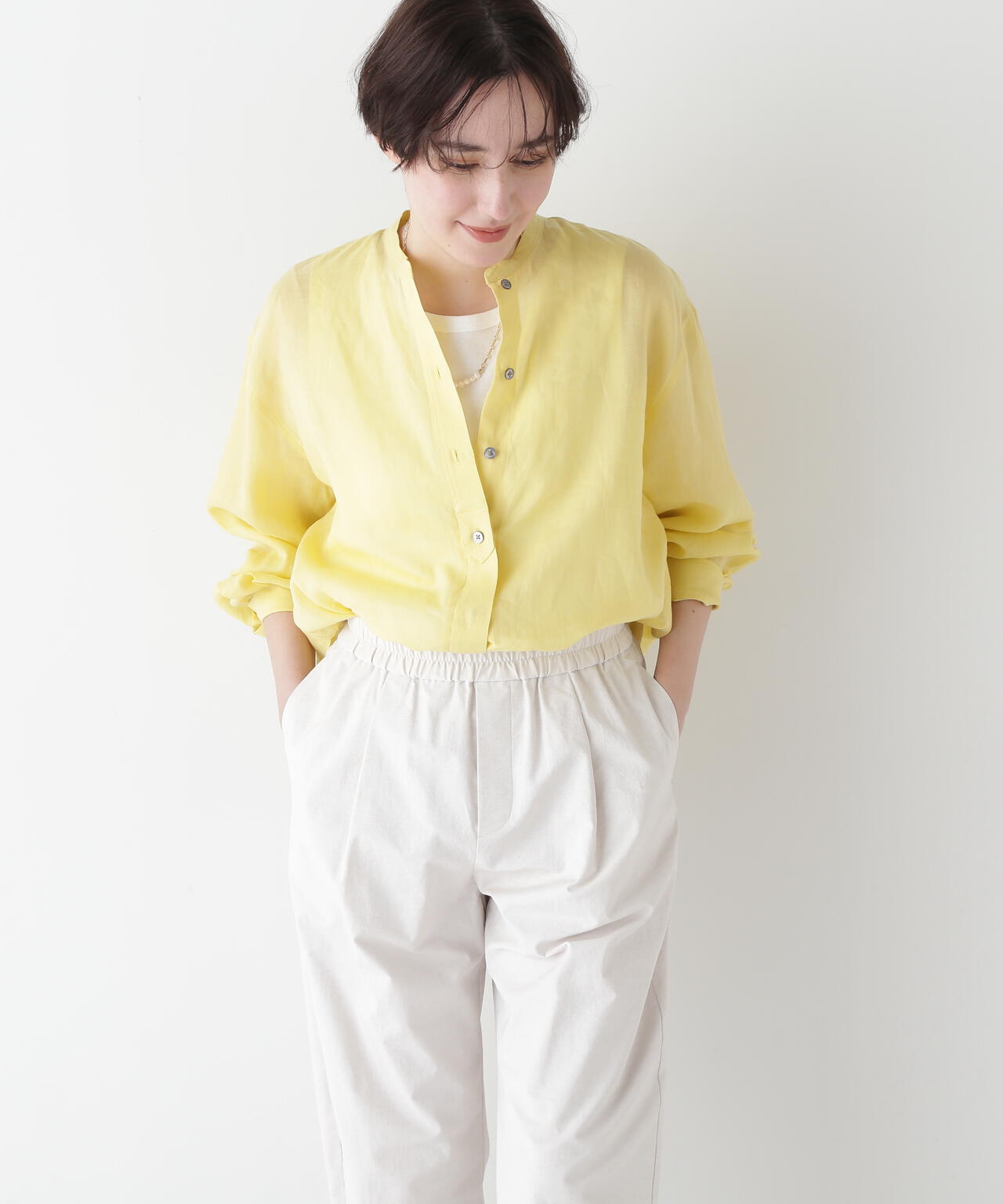 human woman定番のラミー素材を使用しショート丈のバンドカラーブラウスです。肌離れするボックスシルエットと、フロントに見えてくる太めの前立てがポイントです。