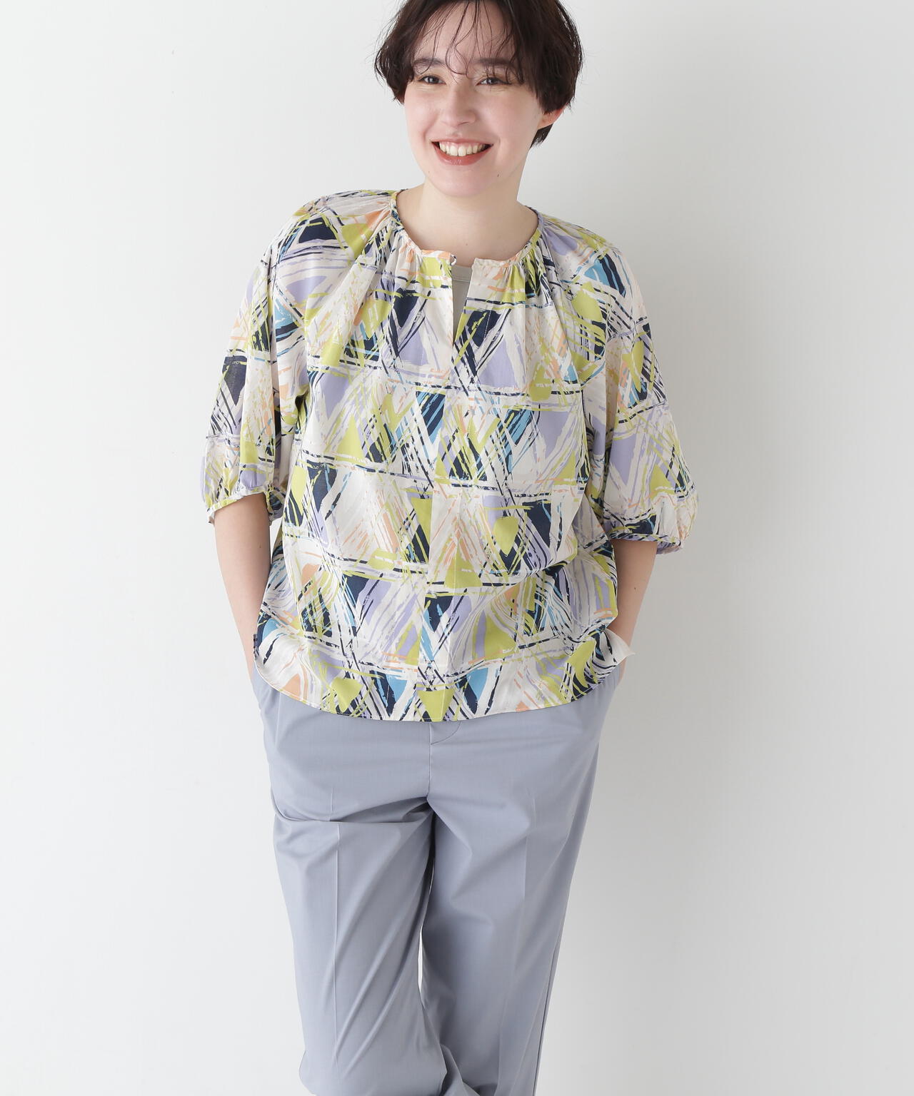 ギャザーディテールをポイントとしたオープンフロントネックのラグランスリーブブラウスです。