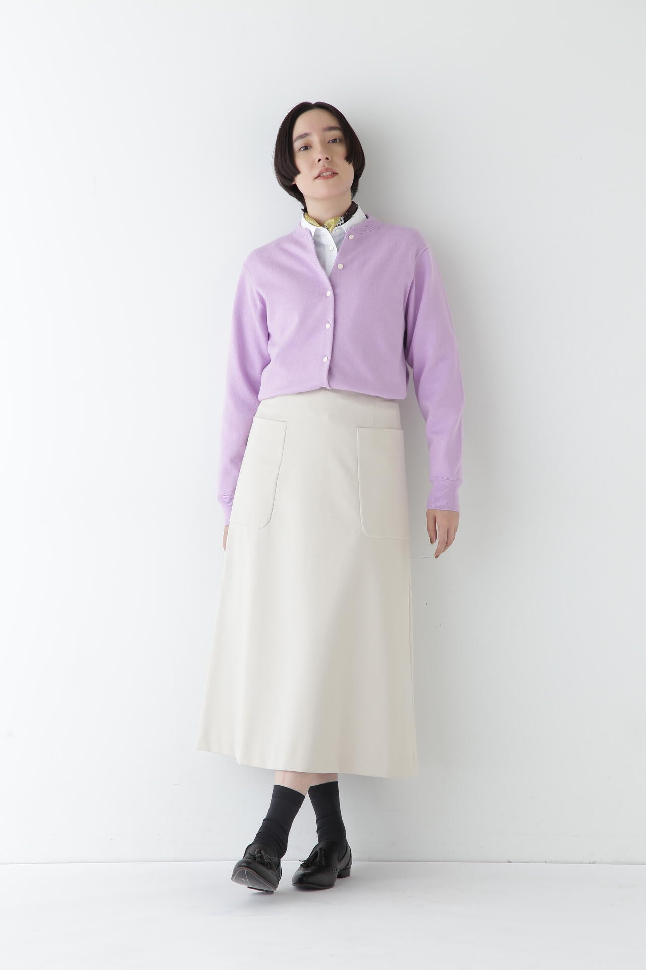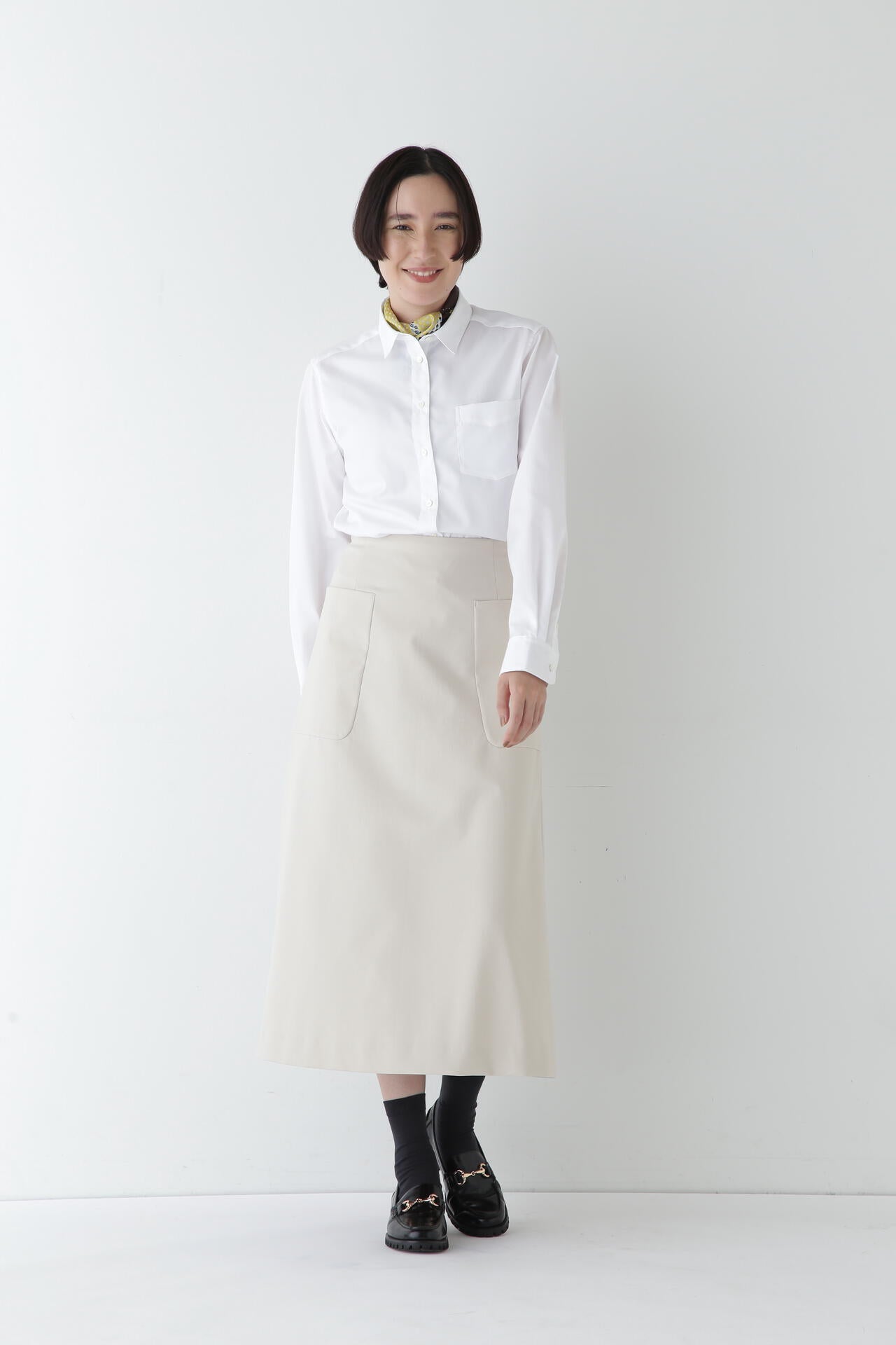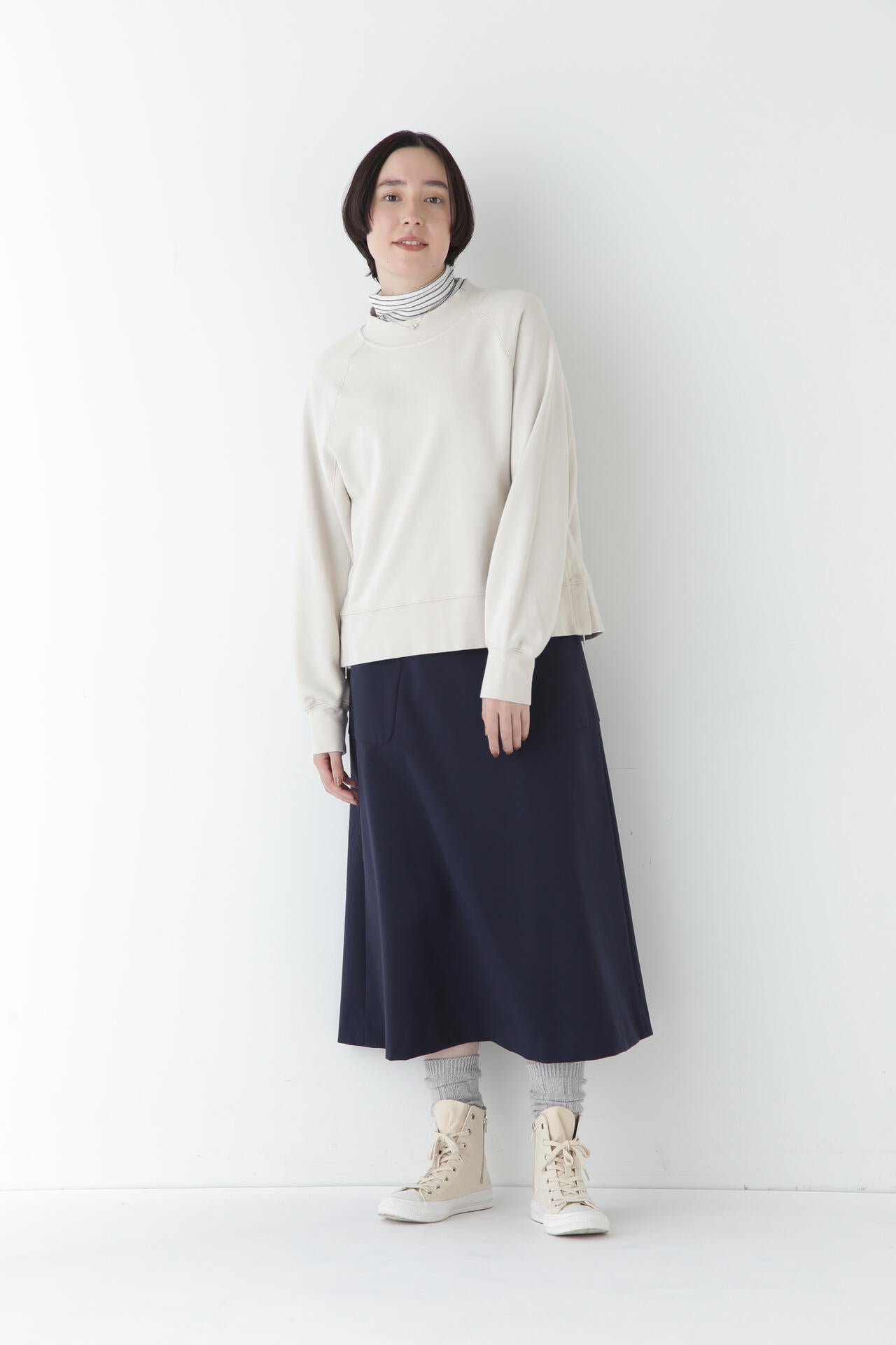 シャツなどきれいめなトップスと合わせて通勤やオケージョンにもおすすめです。またスウエットやTシャツなどカジュアルなアイテムとも相性がよくオンオフ問わず活躍するスカートです。