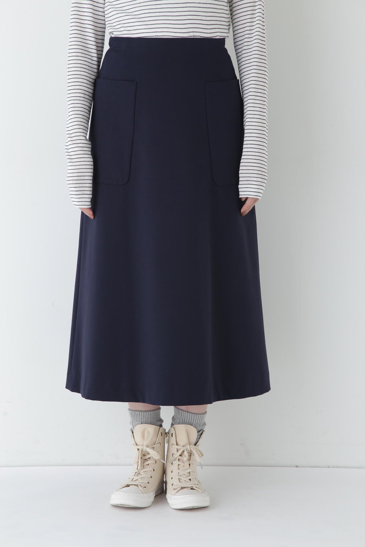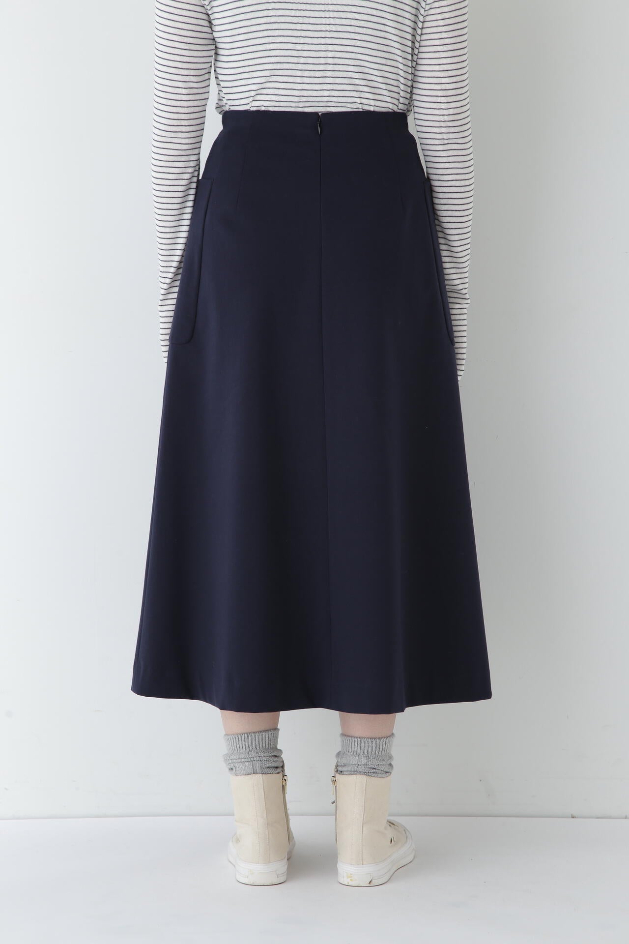 大好評のストレッチポンチ素材を使用した、大きなポケットが特徴のすっきりとしたAラインスカートです。気になる腰回りをカバーしてくれるのが嬉しいポイントです。