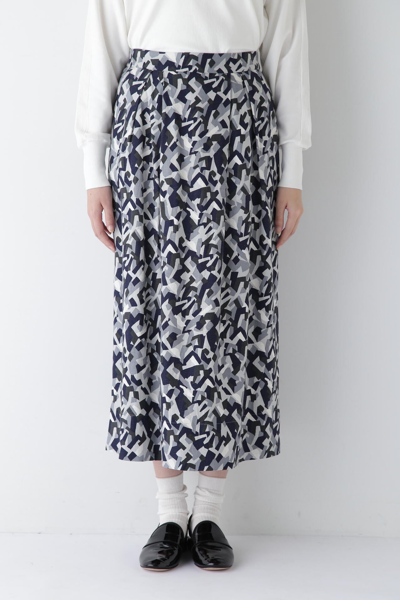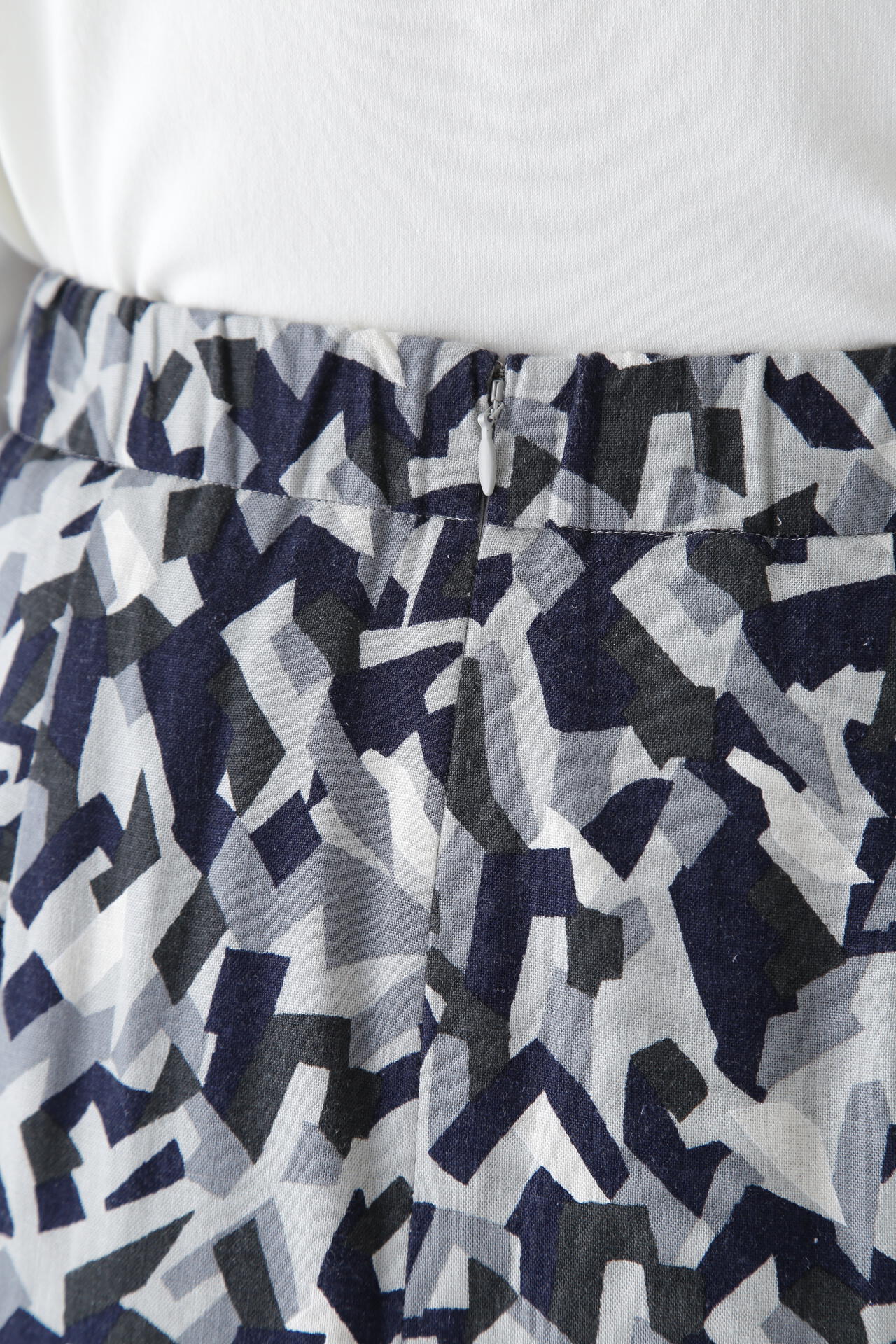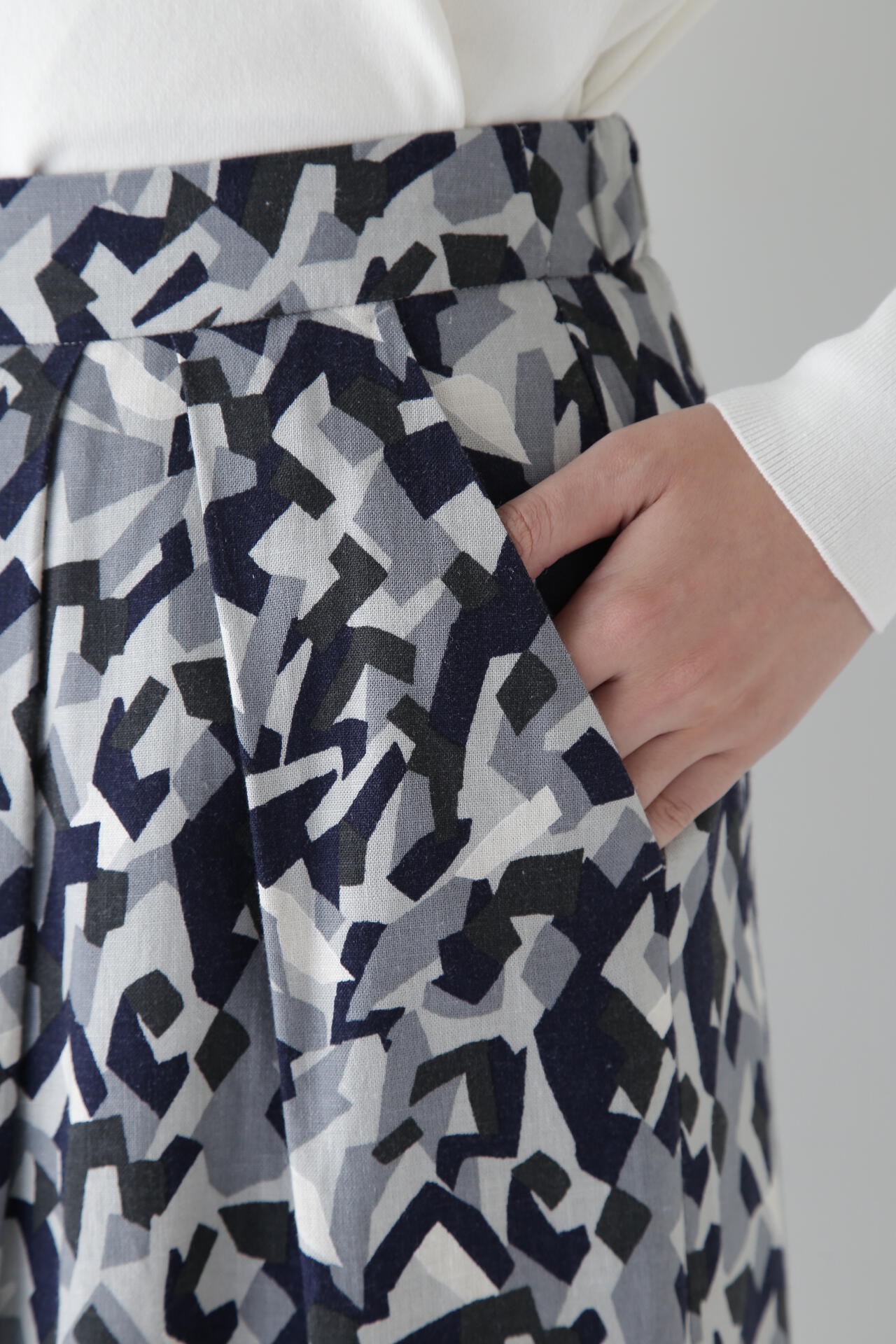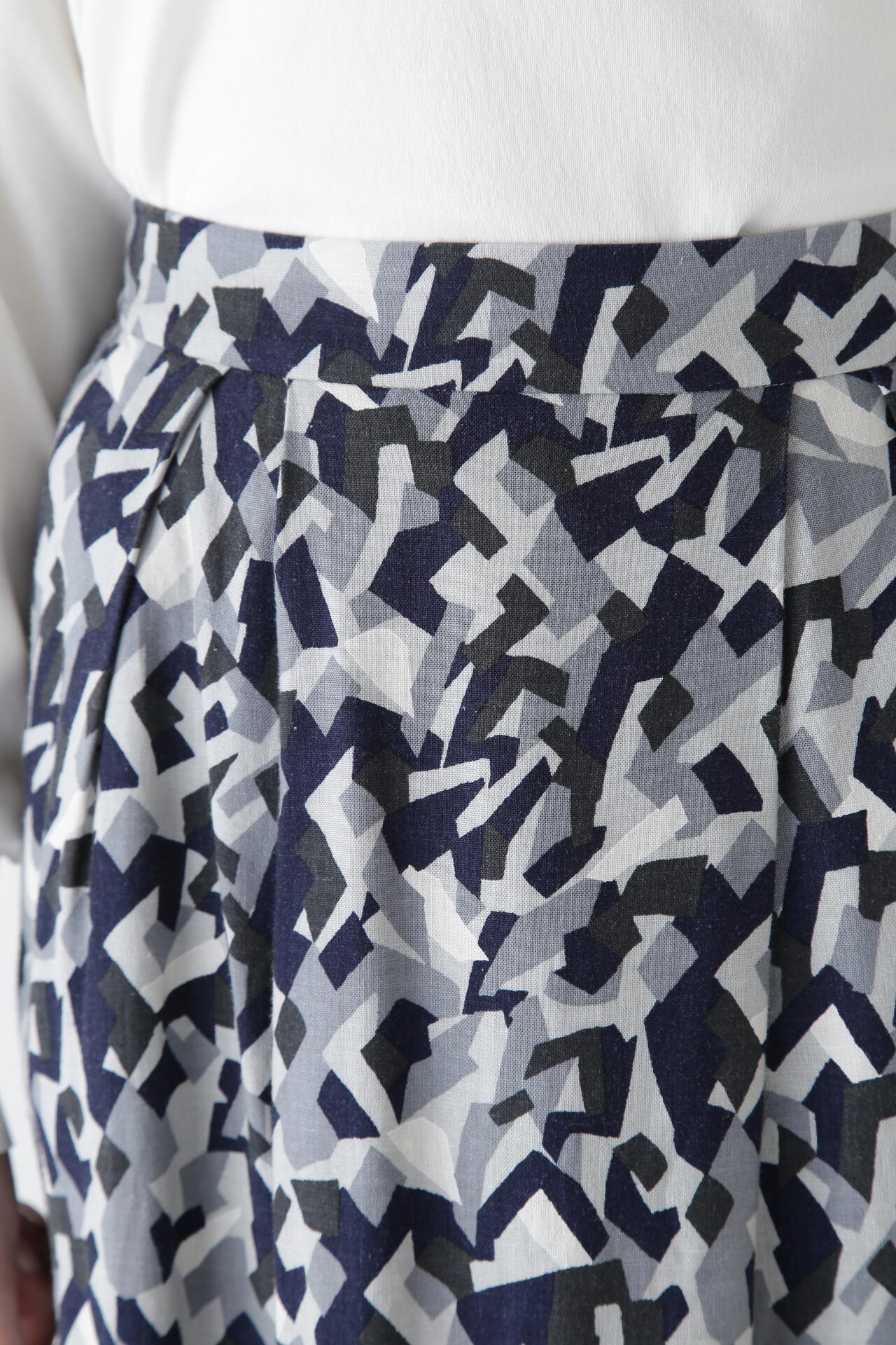 レーヨン麻キャンバスカモジオメトリックPTタックコクーンスカート