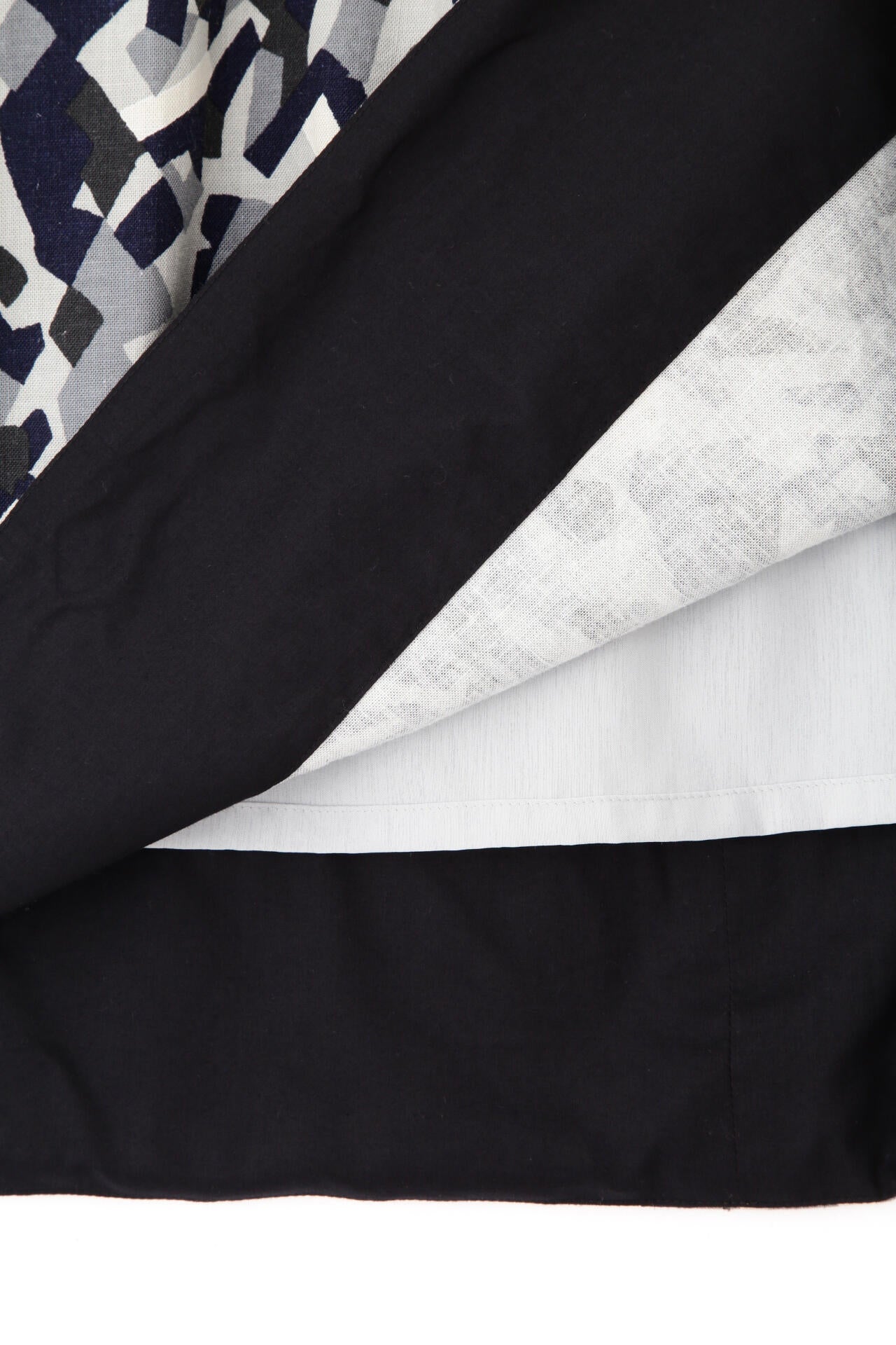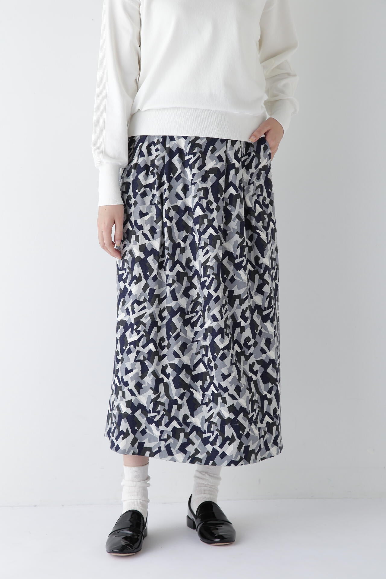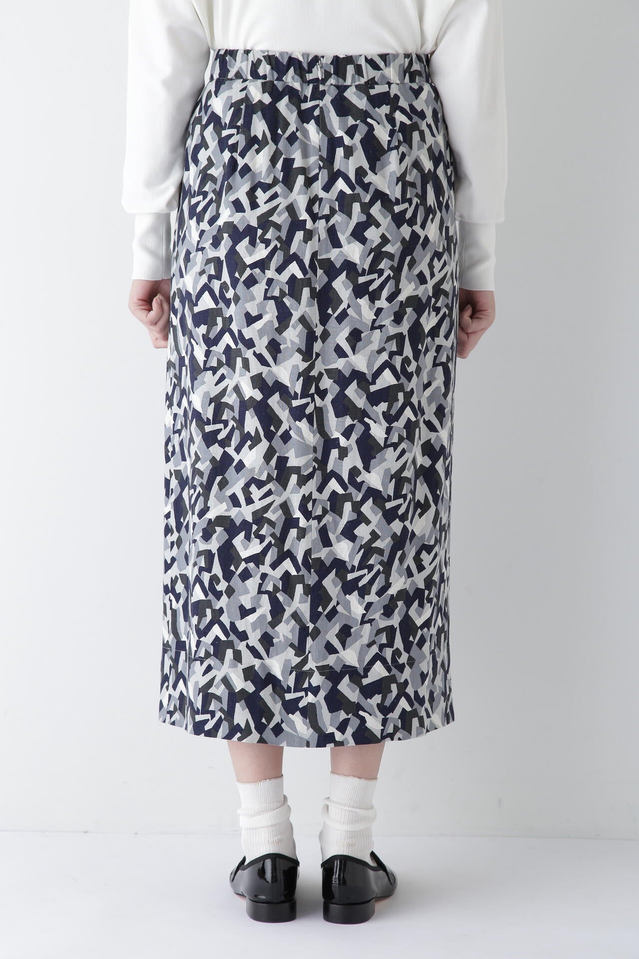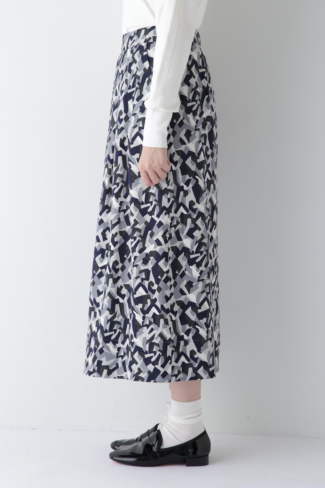 レーヨン麻キャンバスカモジオメトリックPTタックコクーンスカート