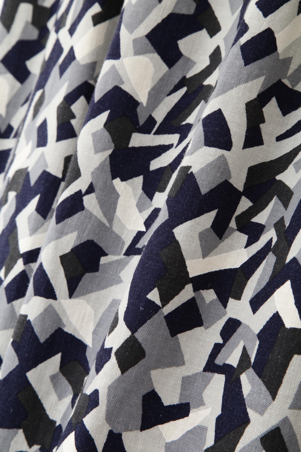 落ち感がありながらも清涼感、カジュアル感を併せ持った麻混のレーヨンキャンパスをプリント下に幾何柄をカモフラ風に表現したオリジナルプリントをおつくりしています。モノトーン見えの1色展開です。