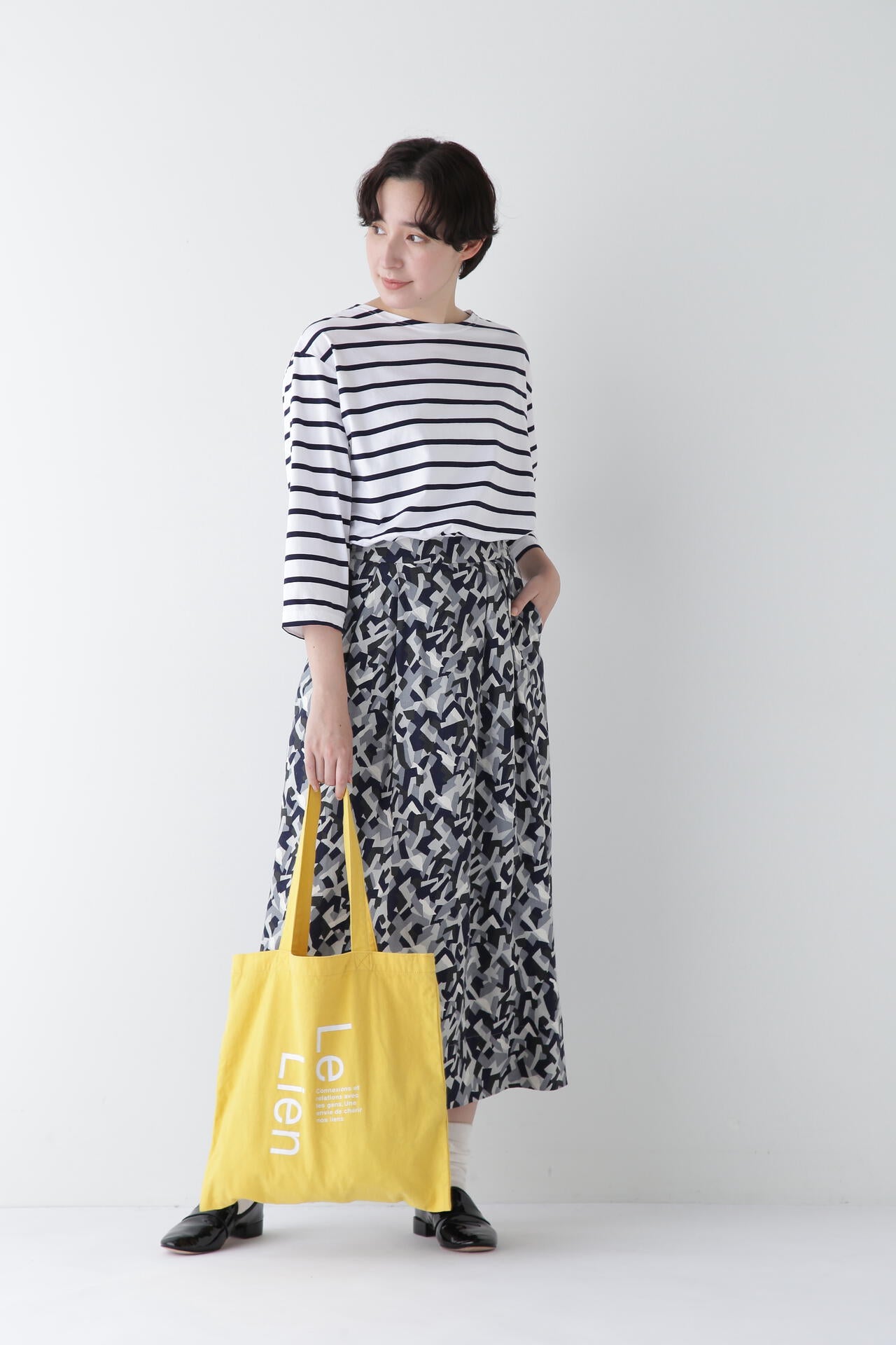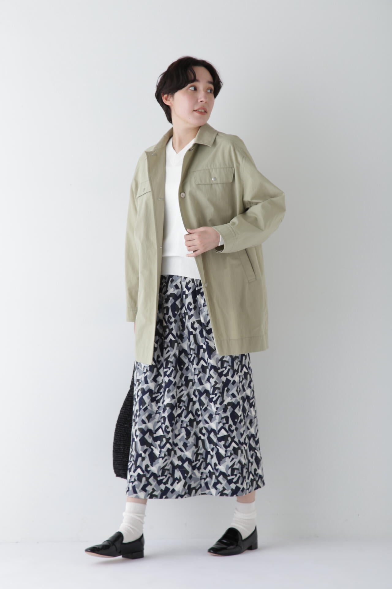 オリジナルのカモフラ風の柄が一枚で存在感のあるスカート。シックなカラー表現なので、トップスにボーダーなど柄on柄のスタイリングにもチャレンジしやすい一枚です。