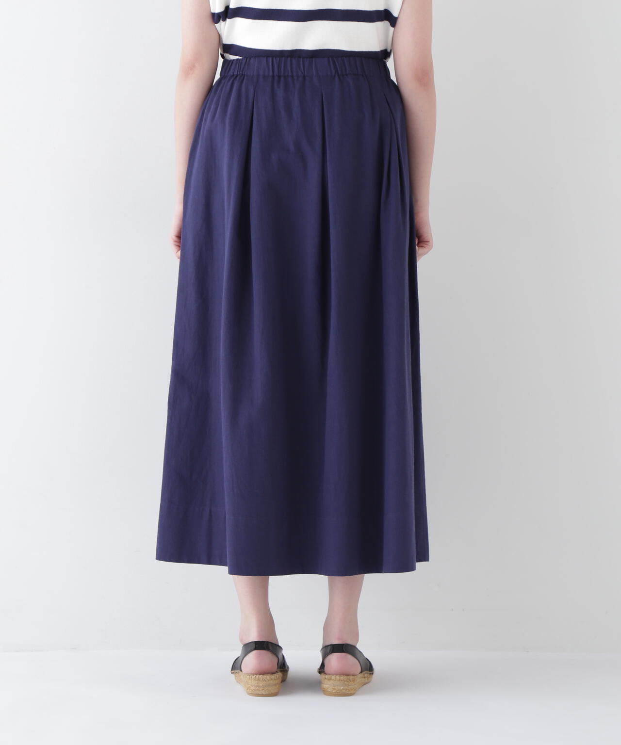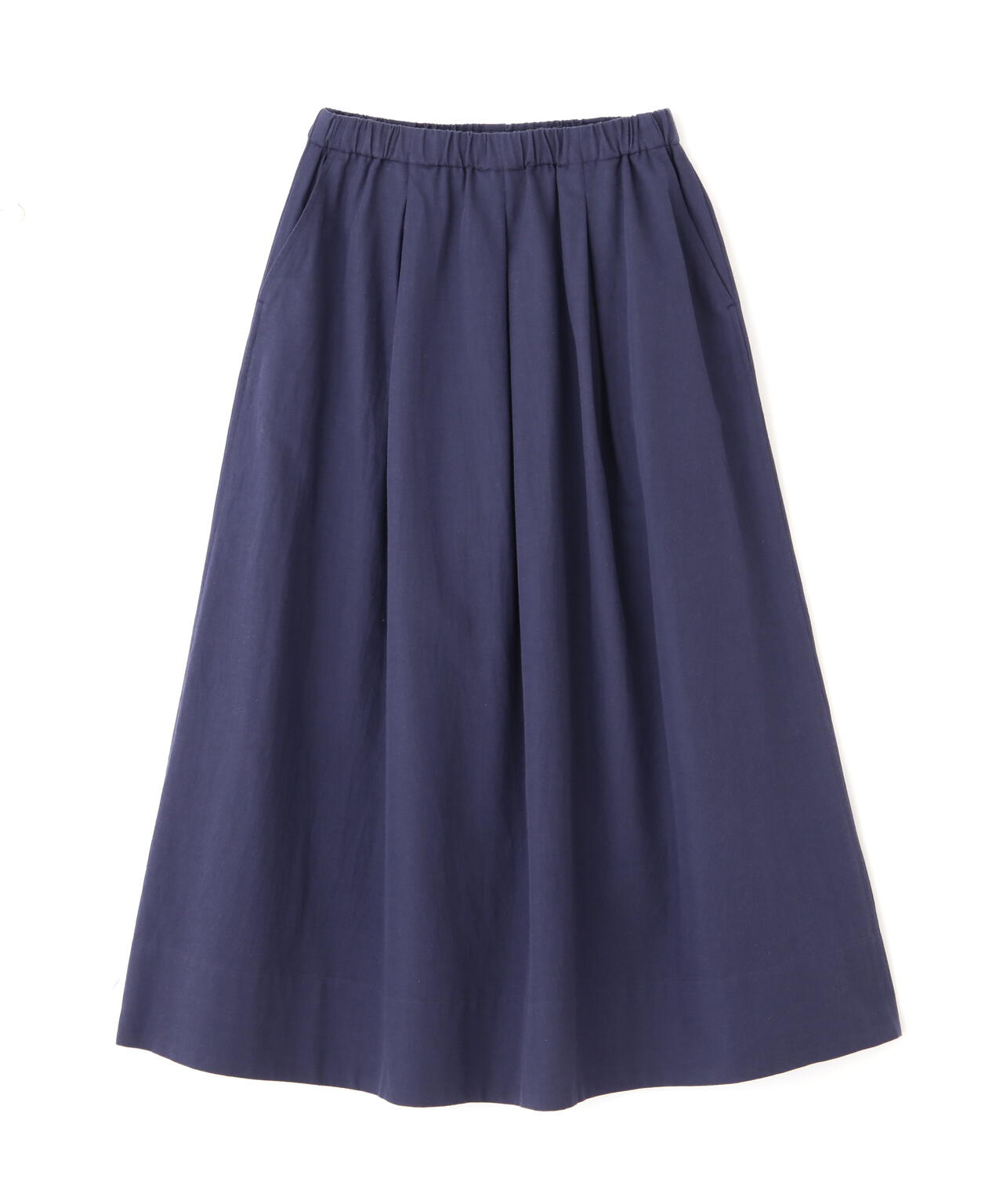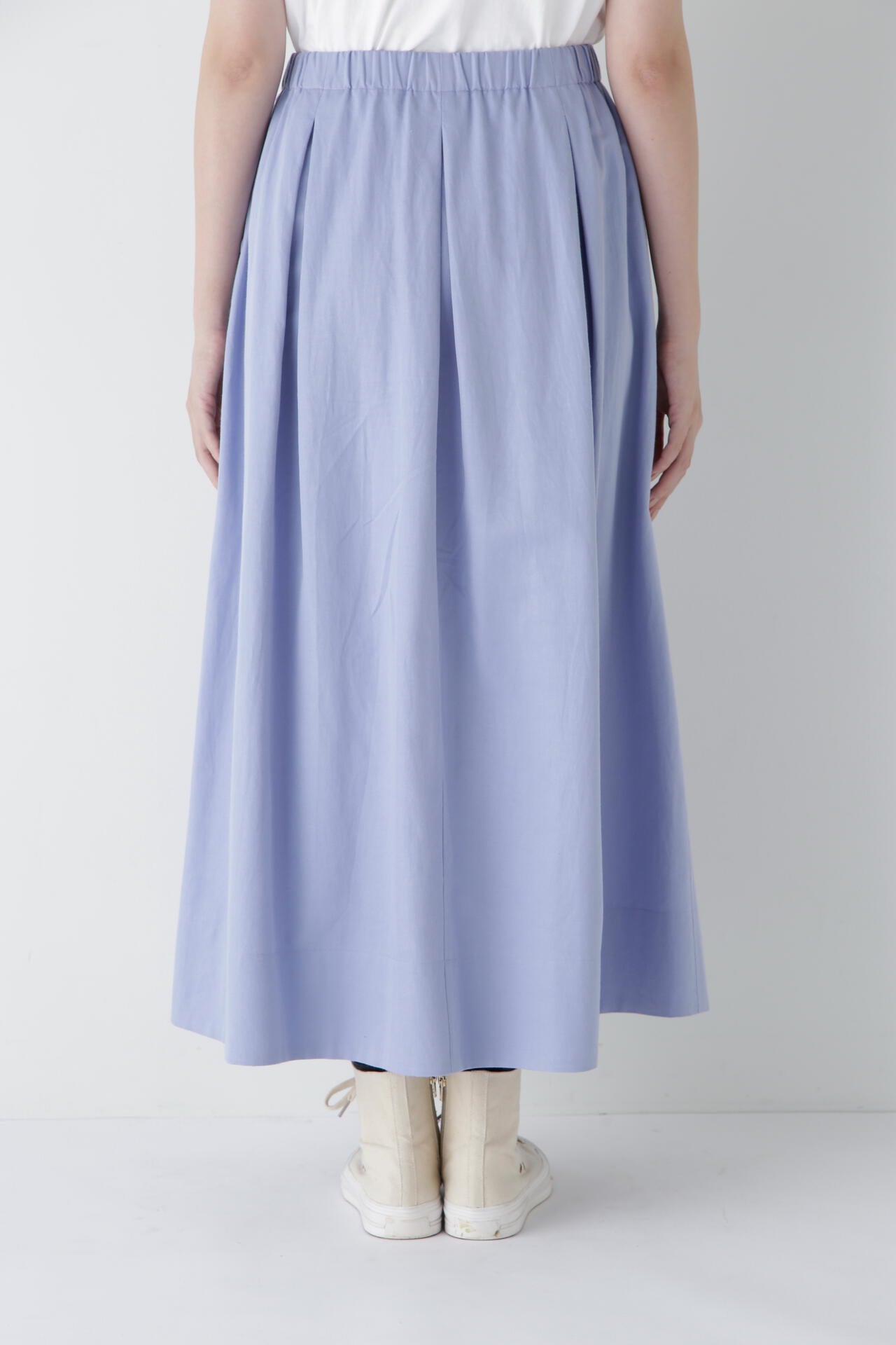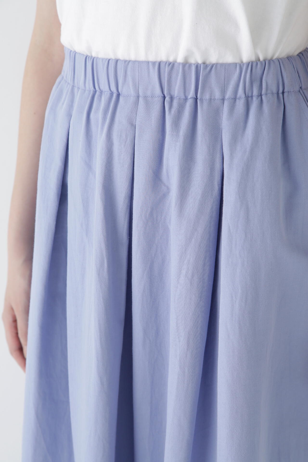 程よいボリューム感のある続きベルトのボックスタックスカートです。ウエストゴム紐仕様のリラックス感がありながら、タックはベルト下まで中縫いを入れてありウエスト周りがすっきりと着用できます。