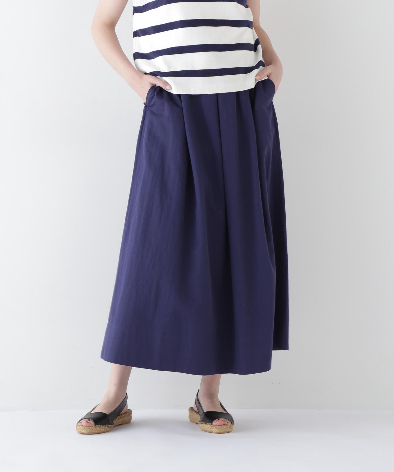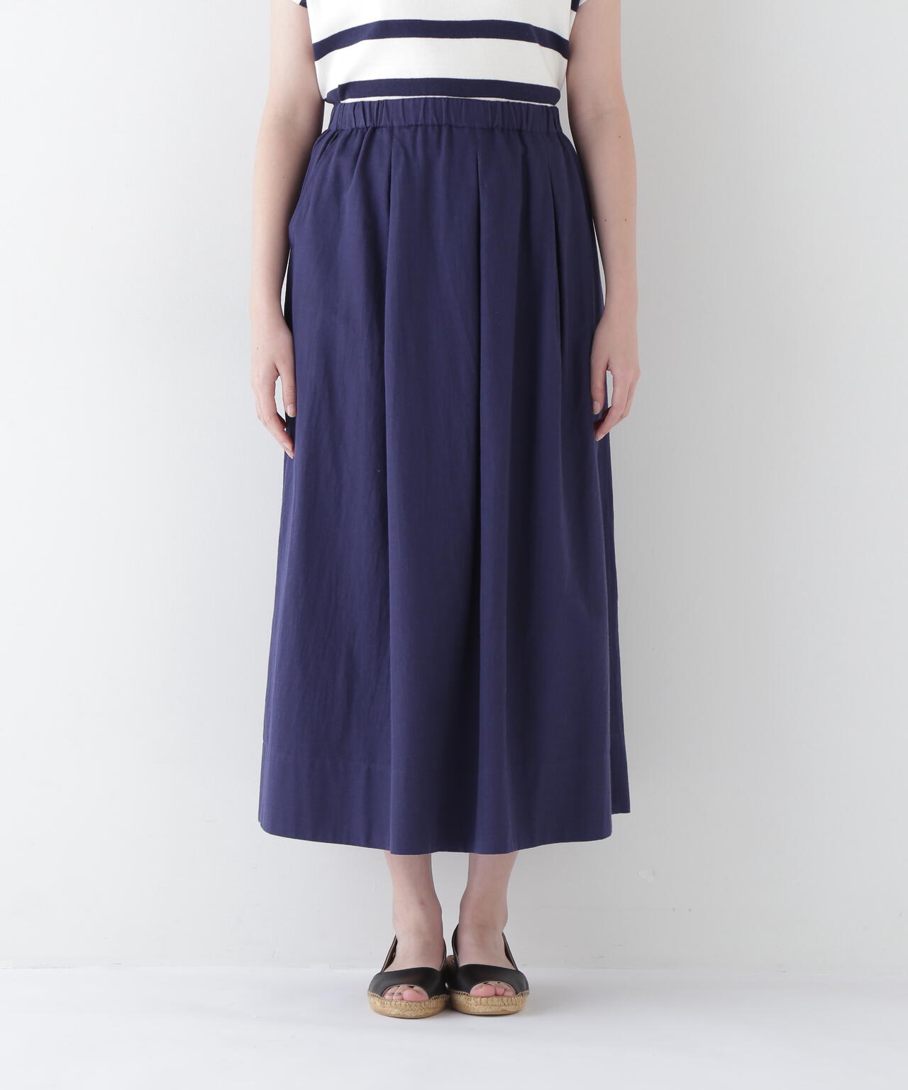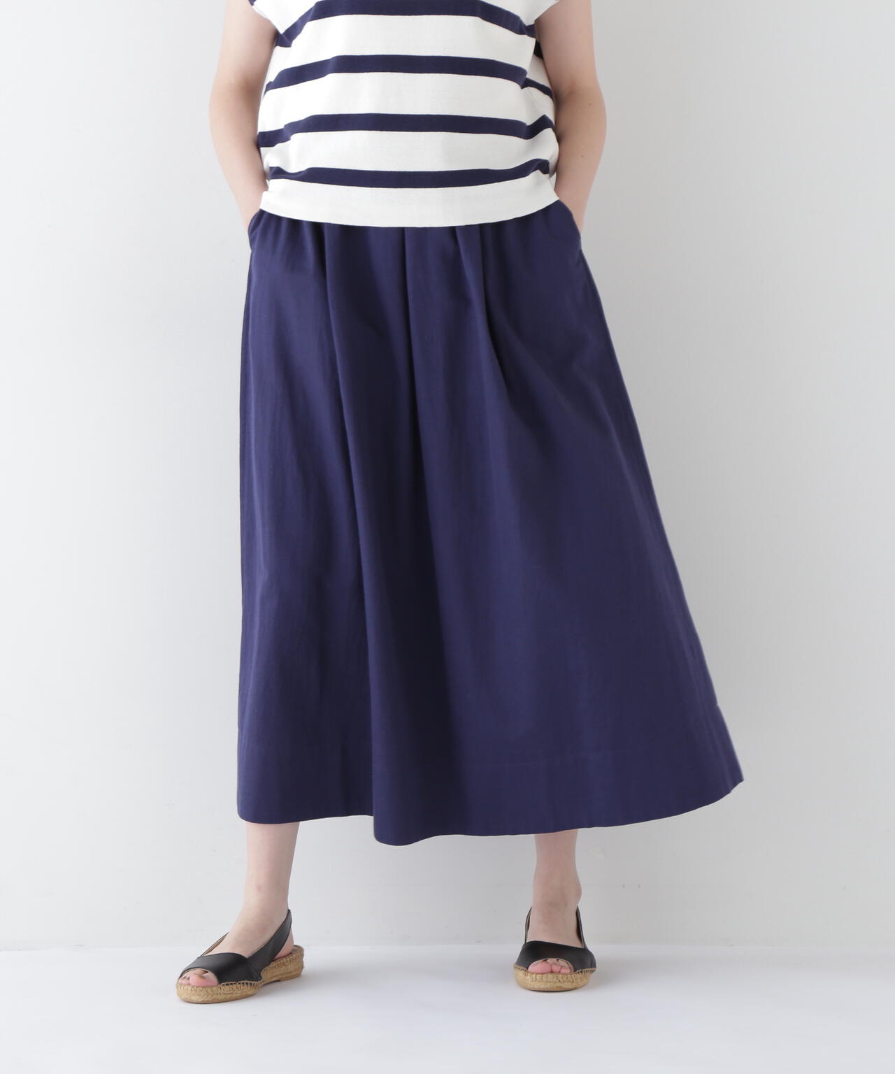 程よいボリューム感のある続きベルトのボックスタックスカートです。ウエストゴム紐仕様のリラックス感がありながら、タックはベルト下まで中縫いを入れてありウエスト周りがすっきりと着用できます。
