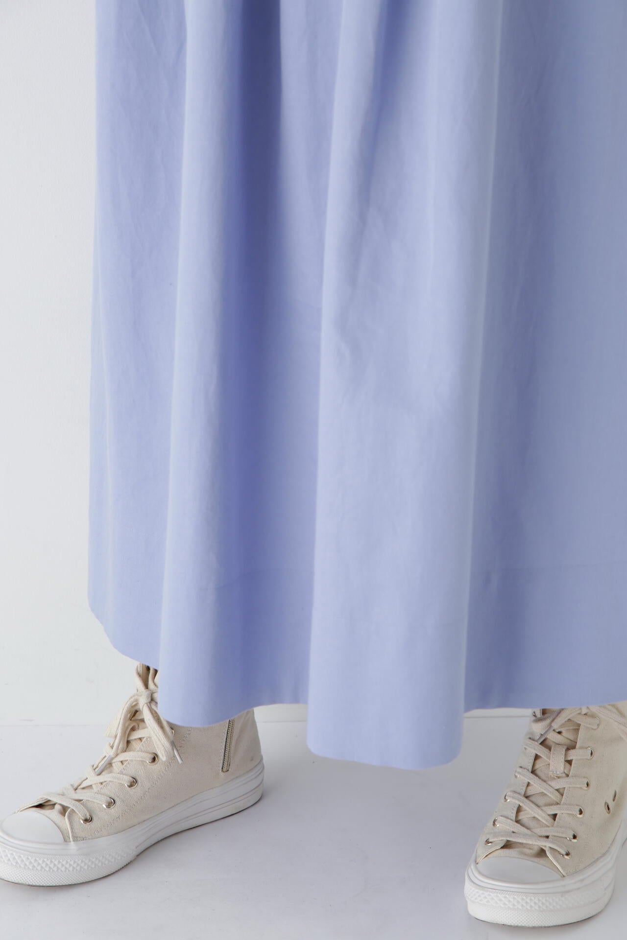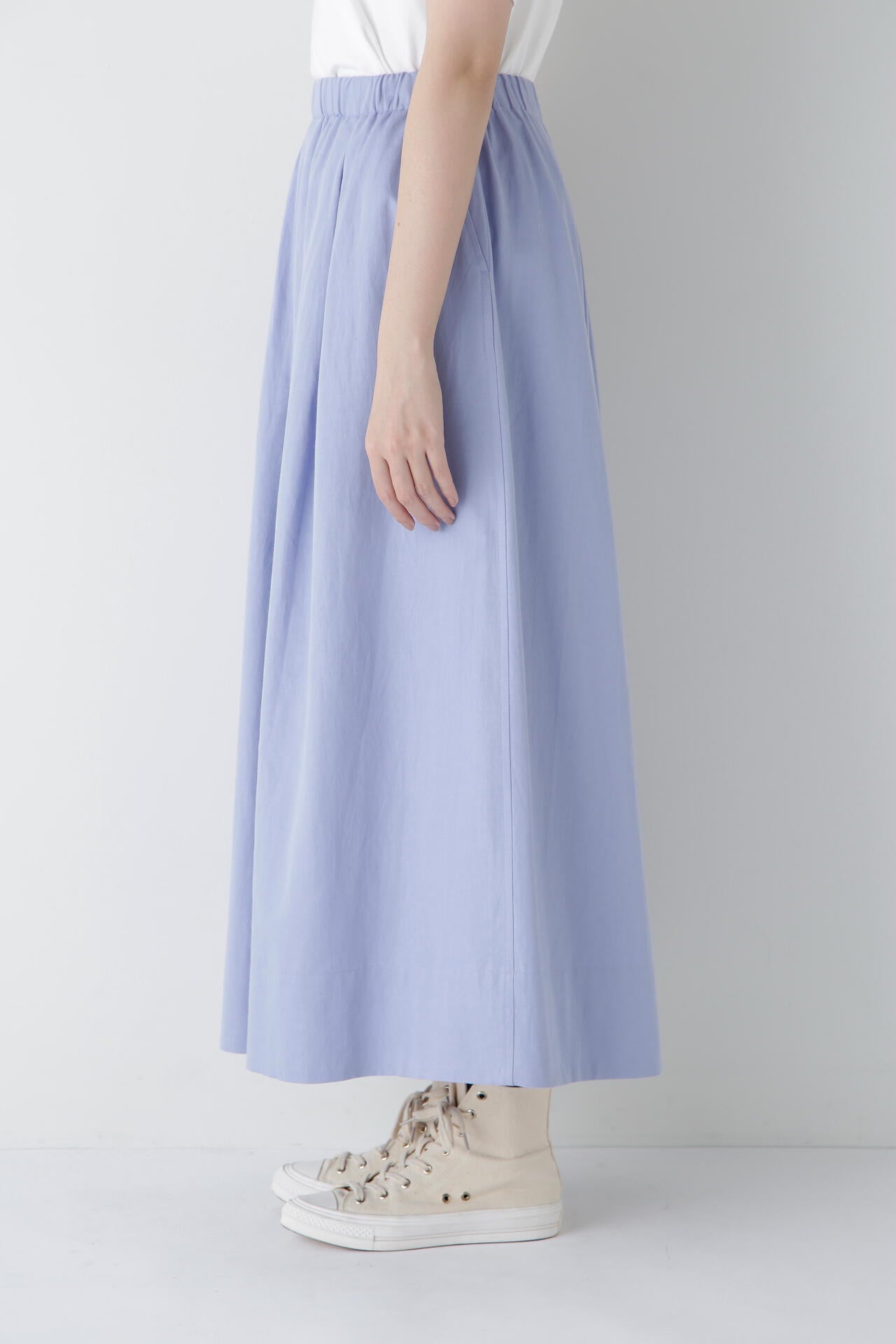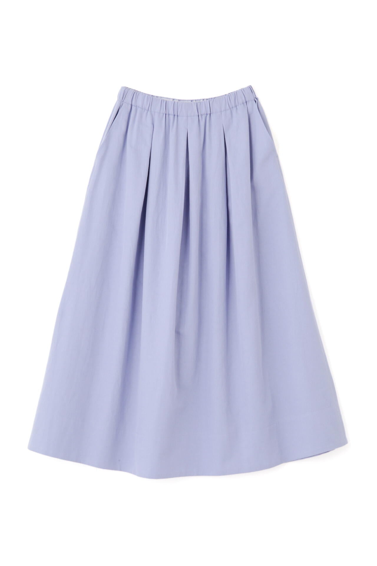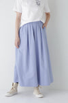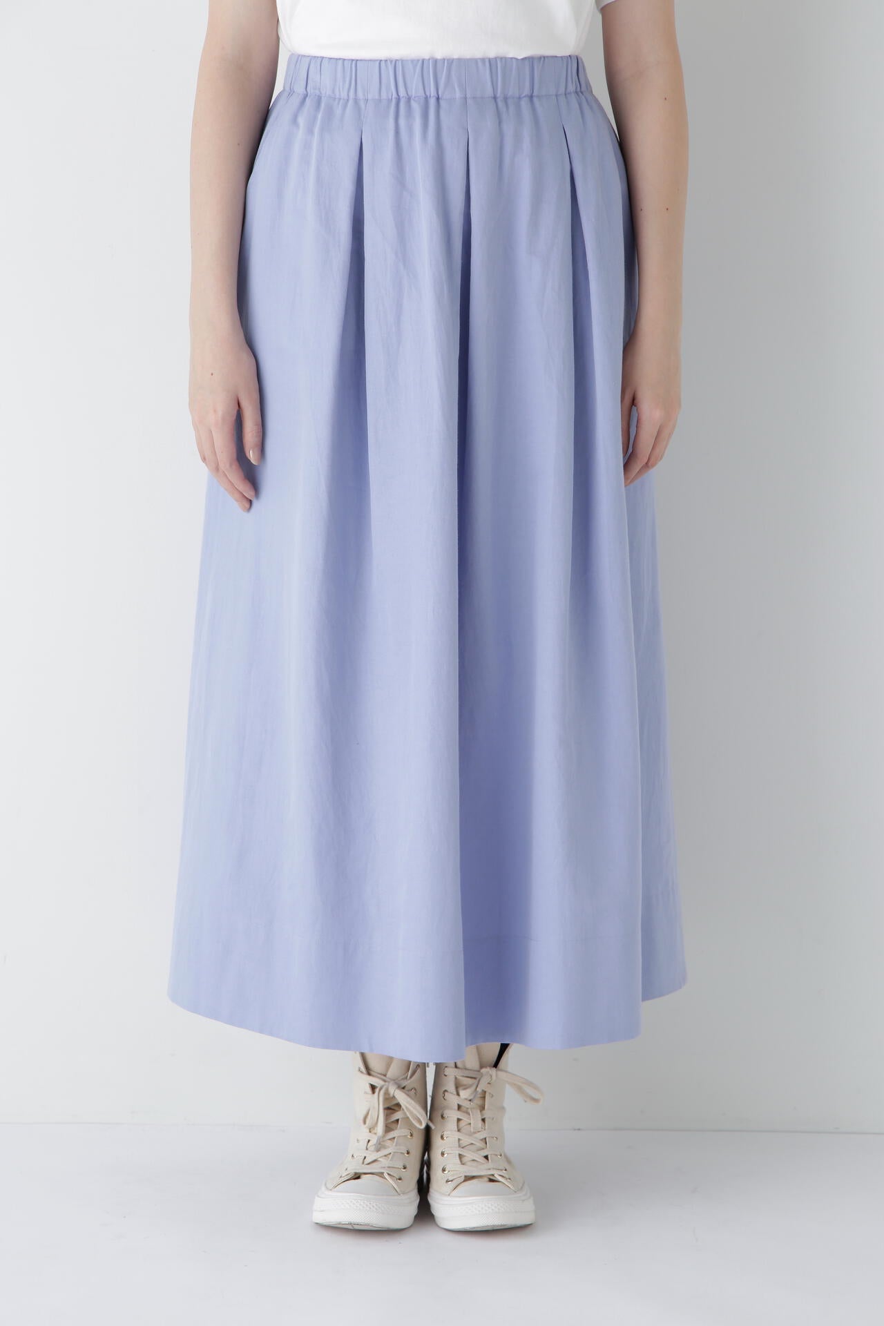 程よいボリューム感のある続きベルトのボックスタックスカートです。ウエストゴム紐仕様のリラックス感がありながら、タックはベルト下まで中縫いを入れてありウエスト周りがすっきりと着用できます。