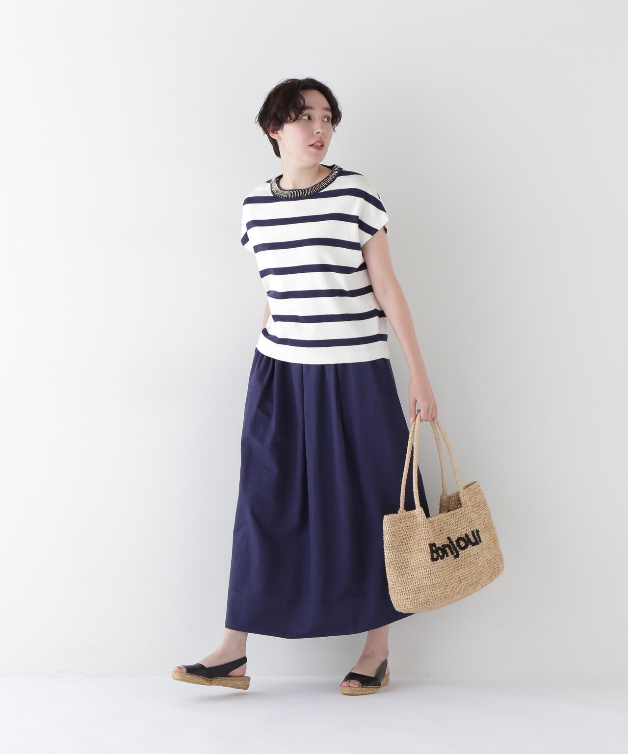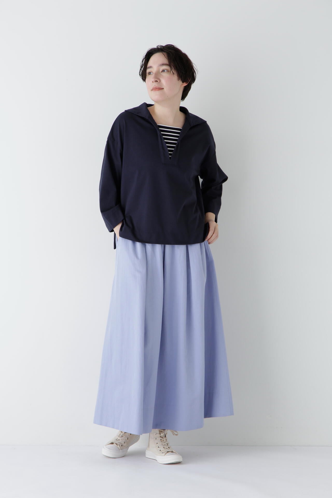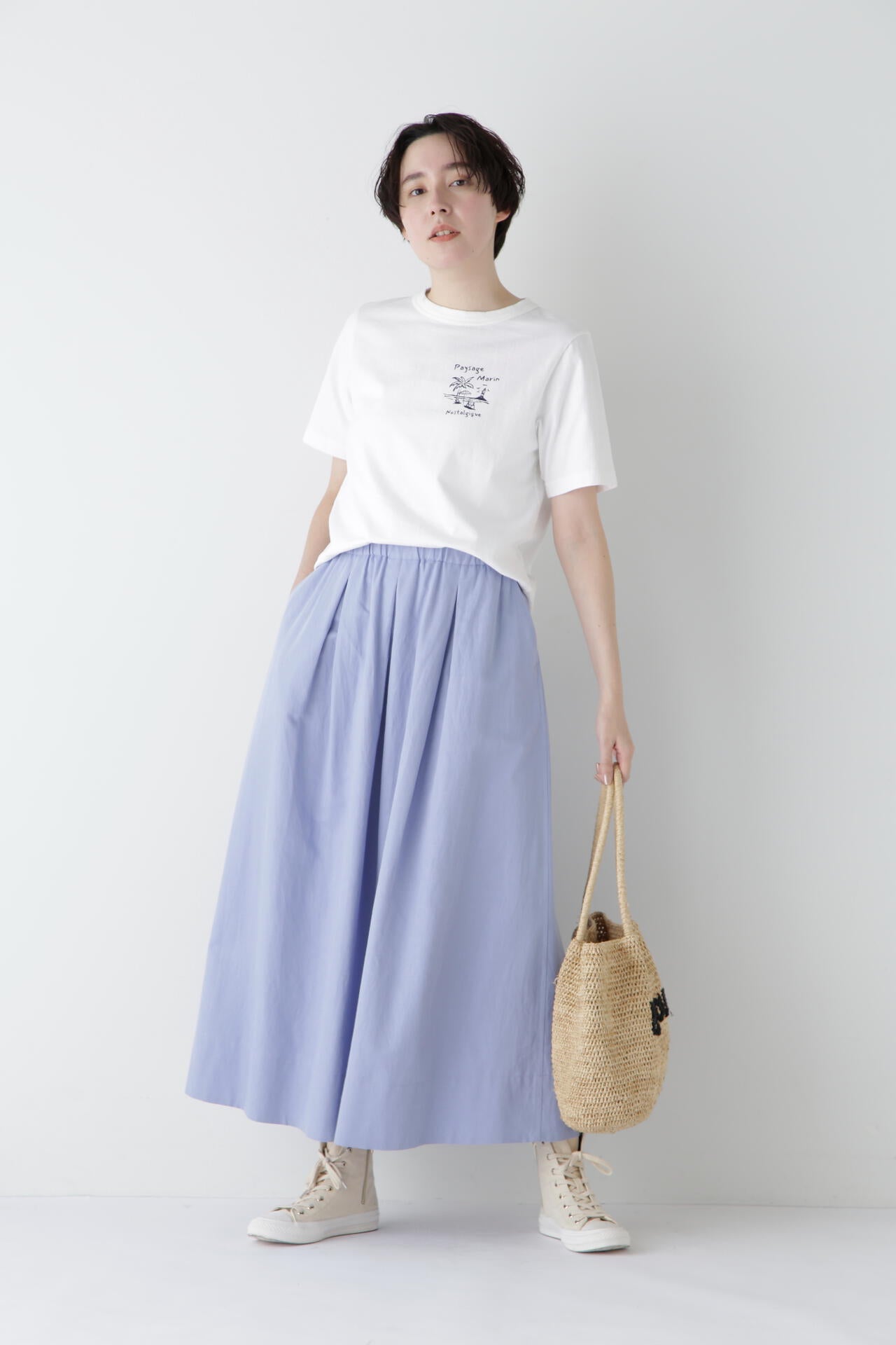 膨らみあるシルエットなのでトップスインのスタイルがおすすめ。カジュアルにもきれい目にも着回せるボリュームスカートです。