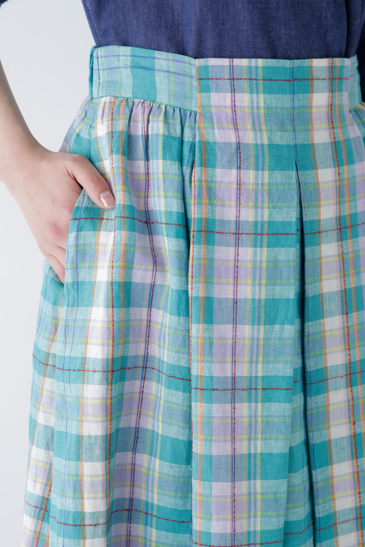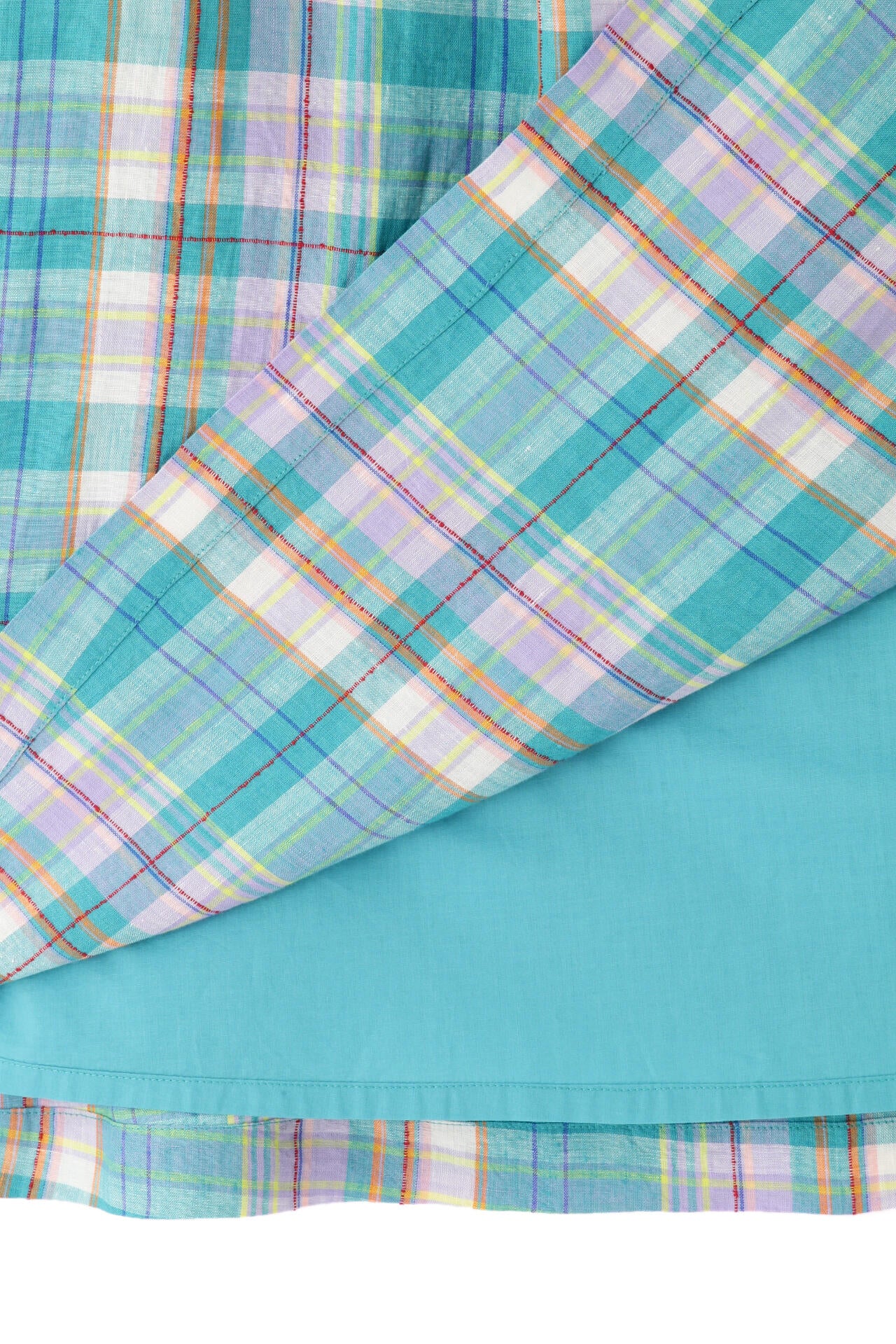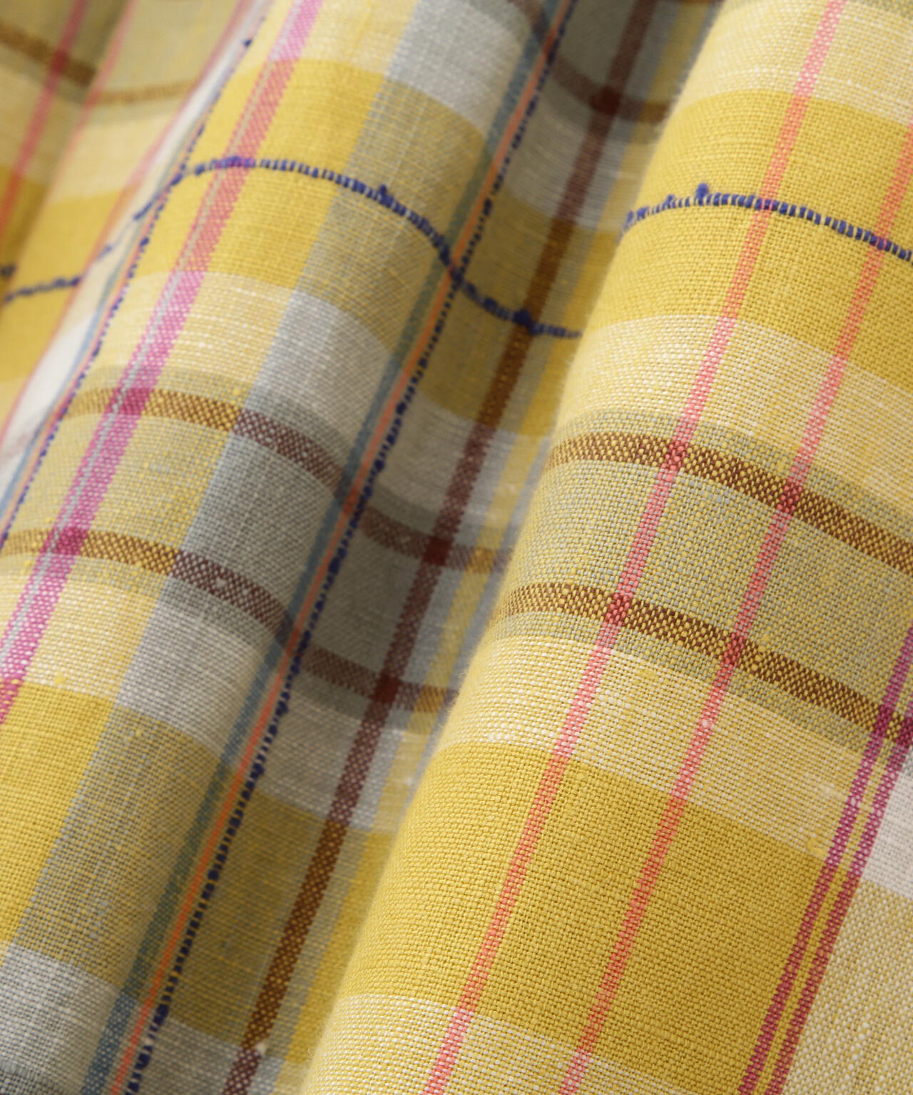 オリジナルチェックの麻の先染めポプリン素材を使用。グリーンブルーとイエローベースの色合いにそれぞれ配色で遊びのある色合いに仕上げてあります。