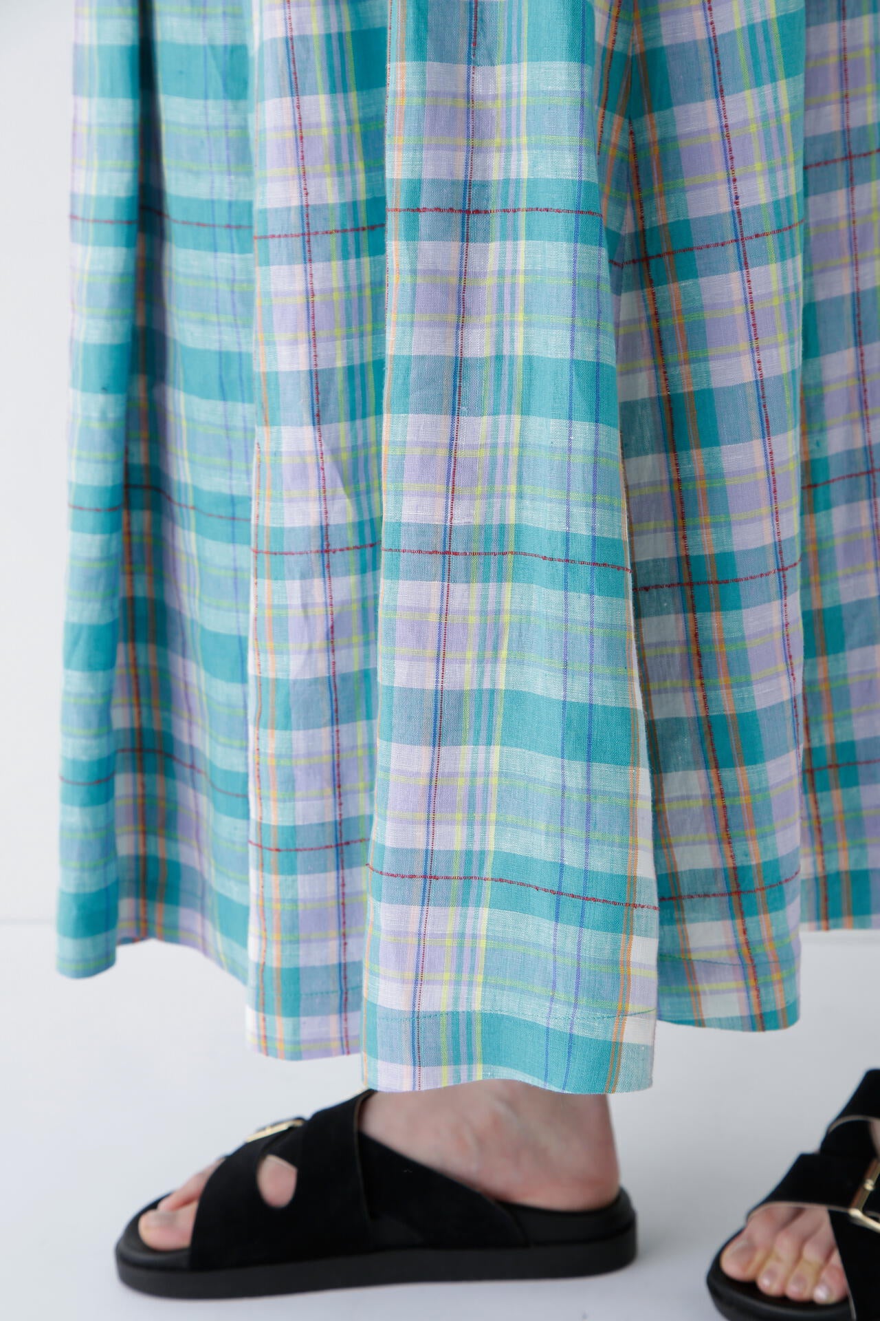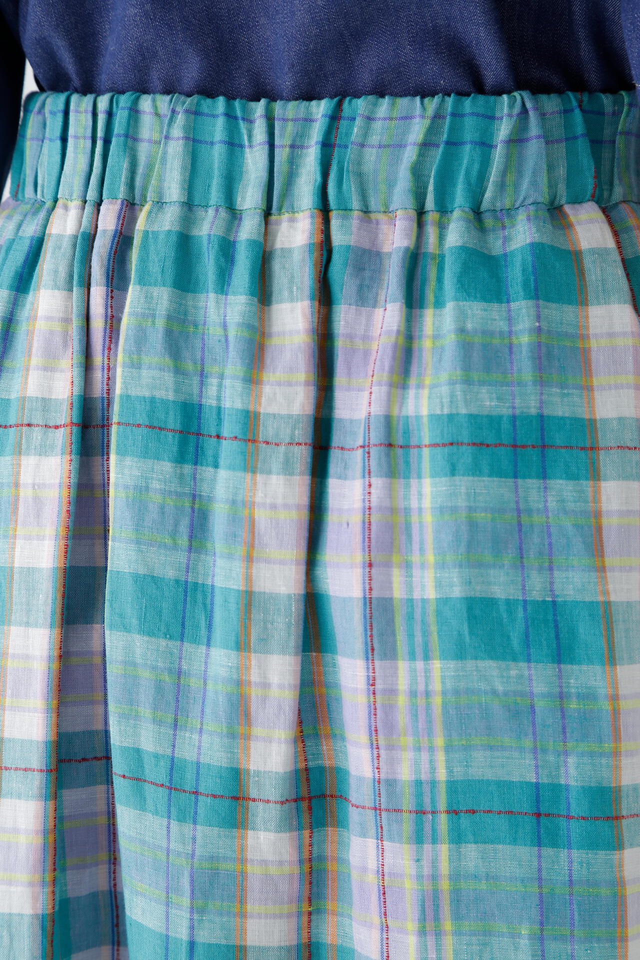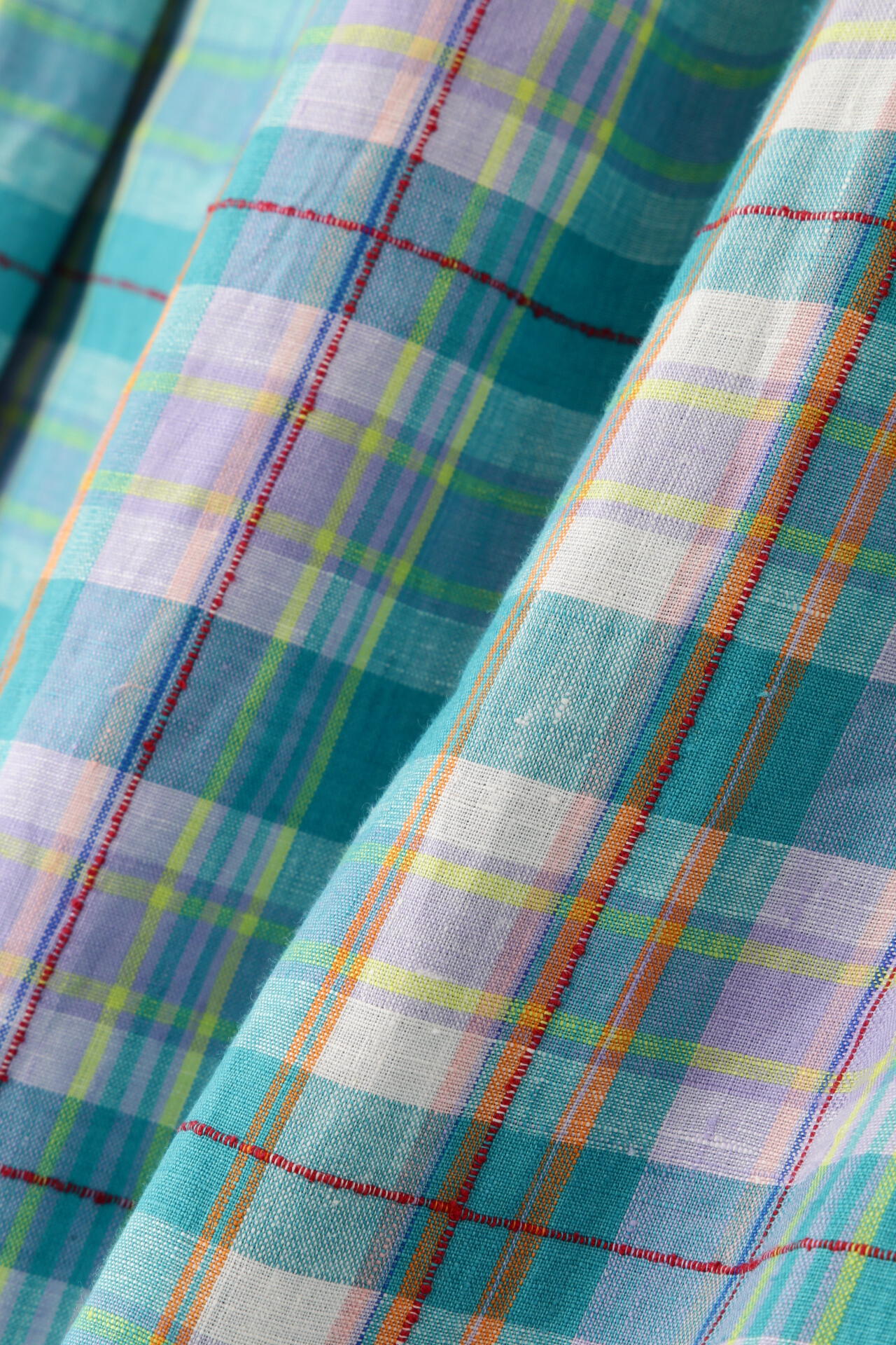 オリジナルチェックの麻の先染めポプリン素材を使用。グリーンブルーとイエローベースの色合いにそれぞれ配色で遊びのある色合いに仕上げてあります。