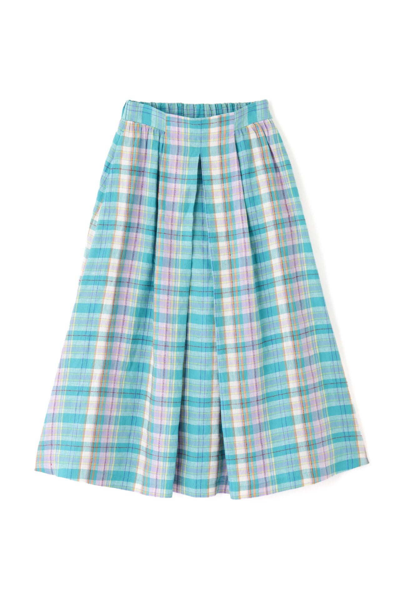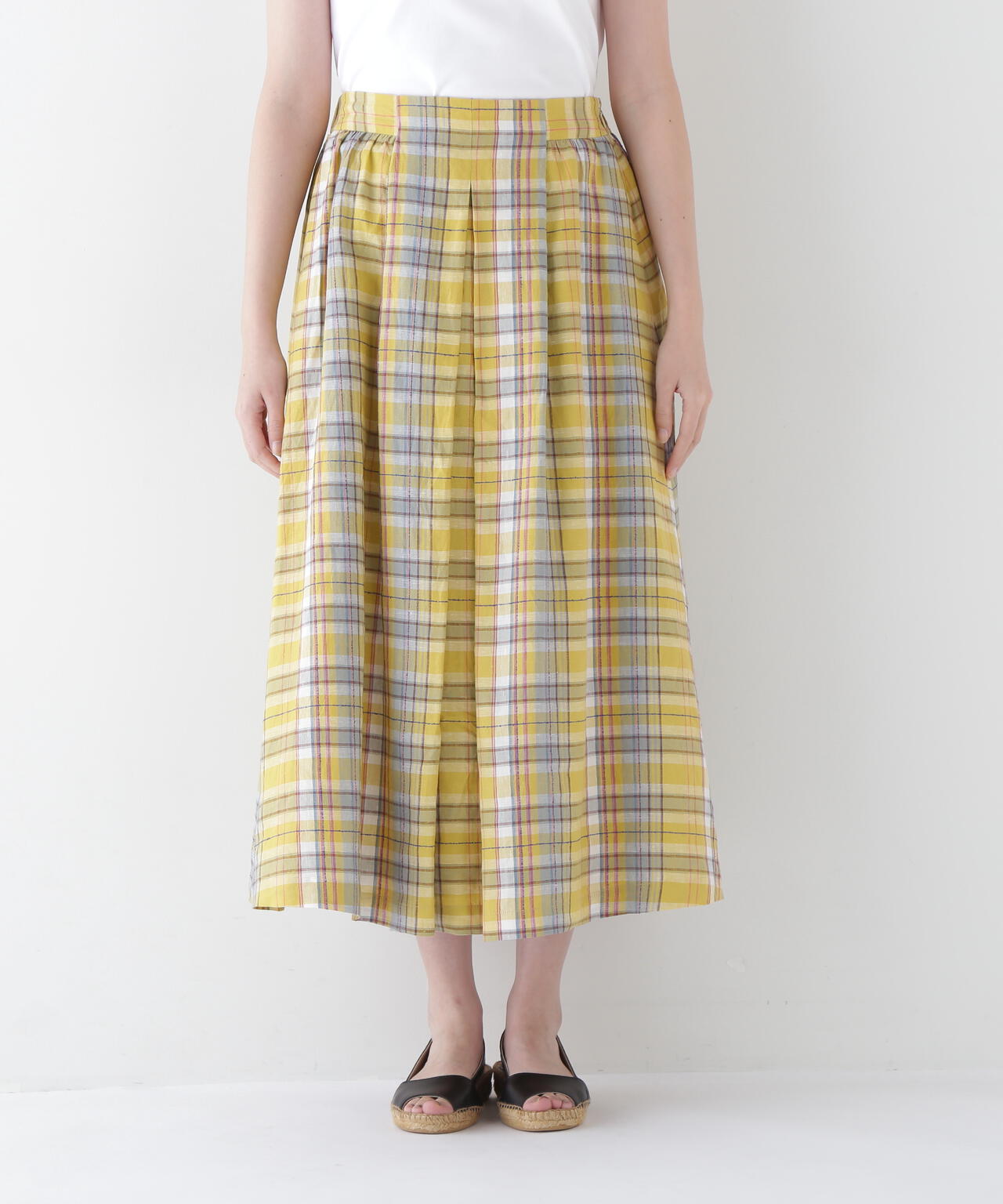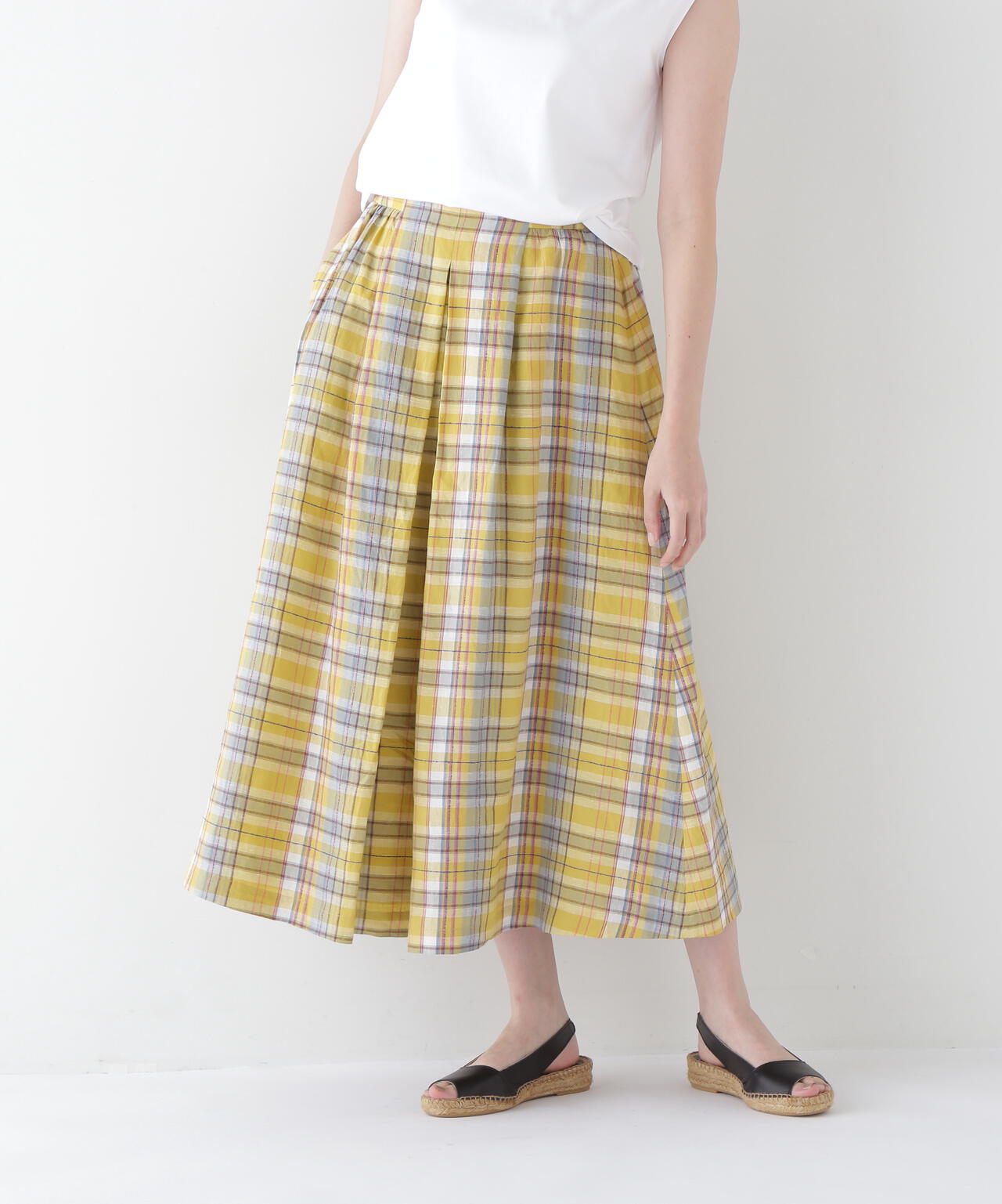 色味の見えてくるマドラスチェックのシンプルなタックスカートです。後ウエストをゴム仕様にしているので着心地に窮屈感はありません。