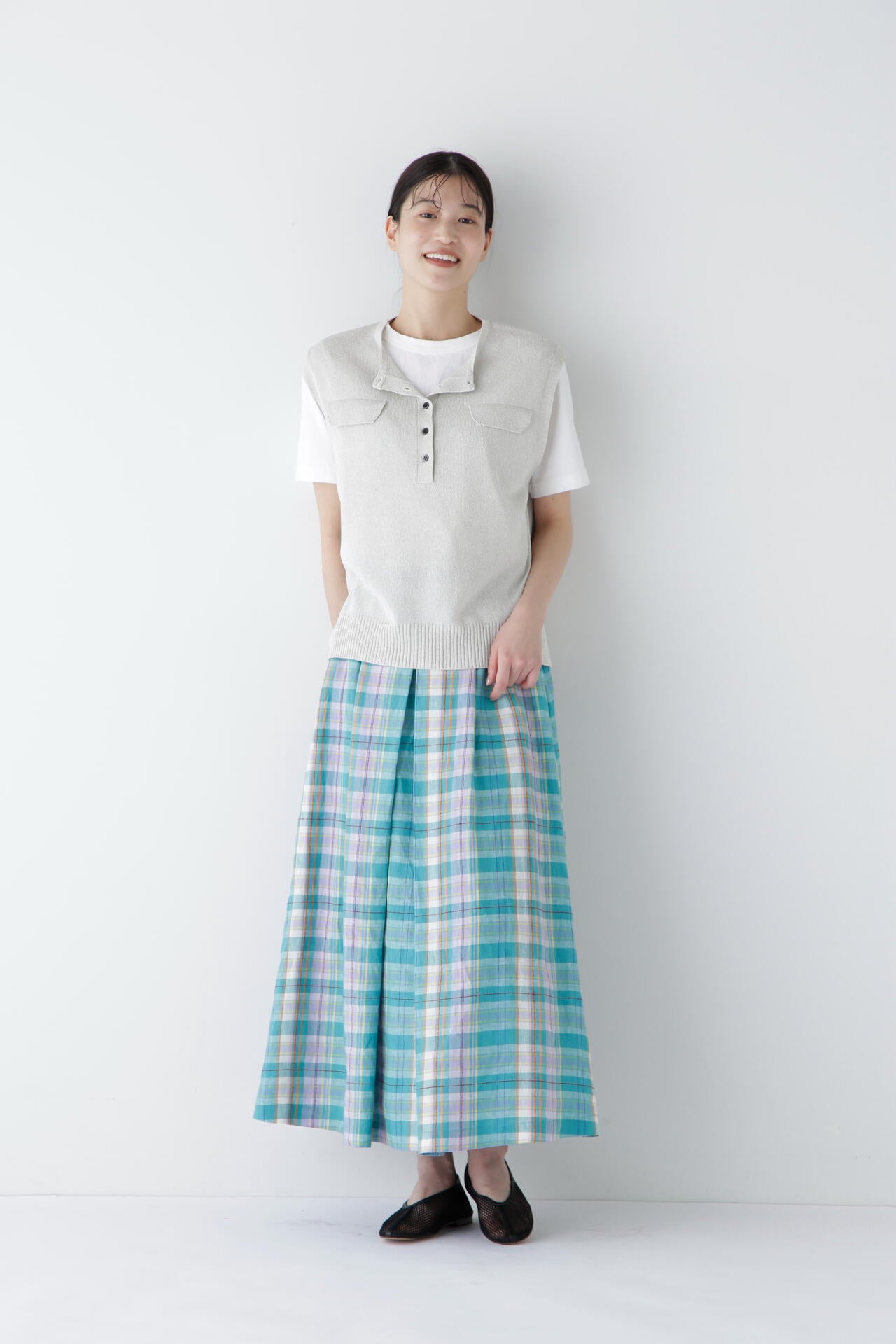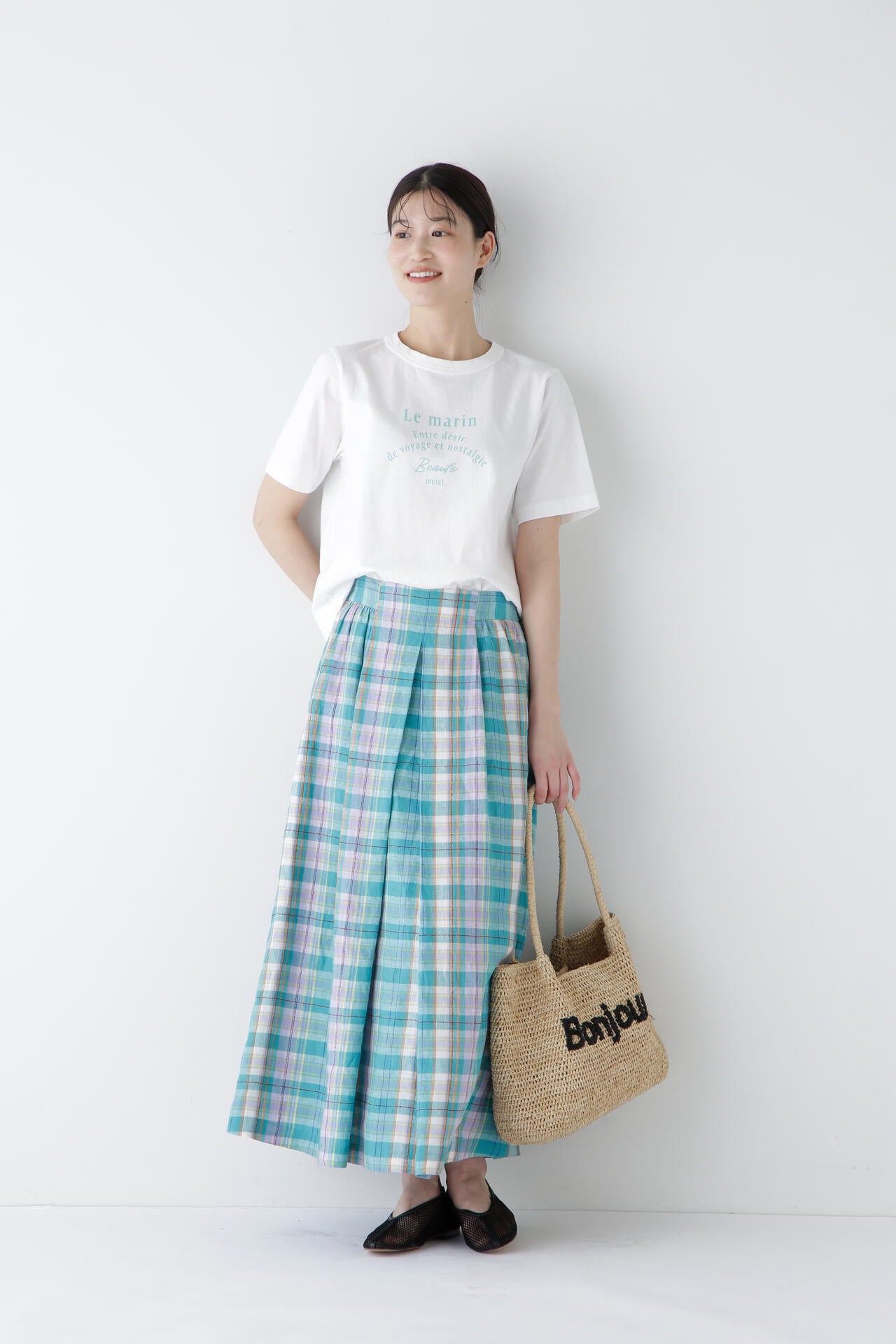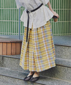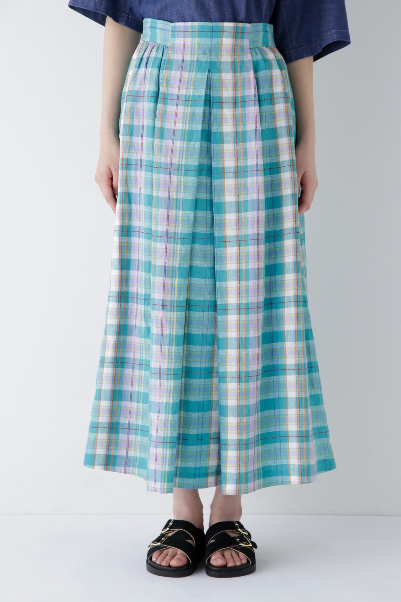 色味の見えてくるマドラスチェックのシンプルなタックスカートです。後ウエストをゴム仕様にしているので着心地に窮屈感はありません。