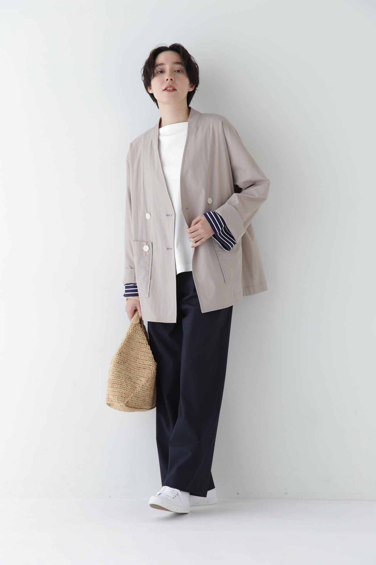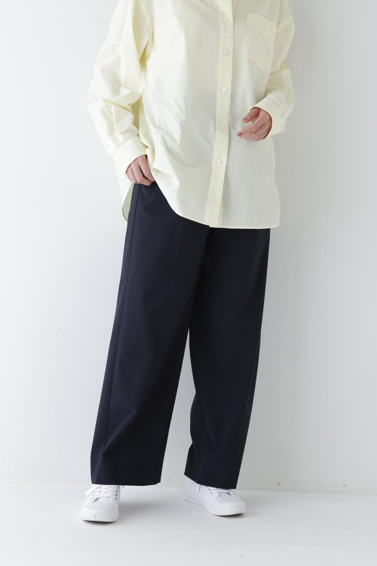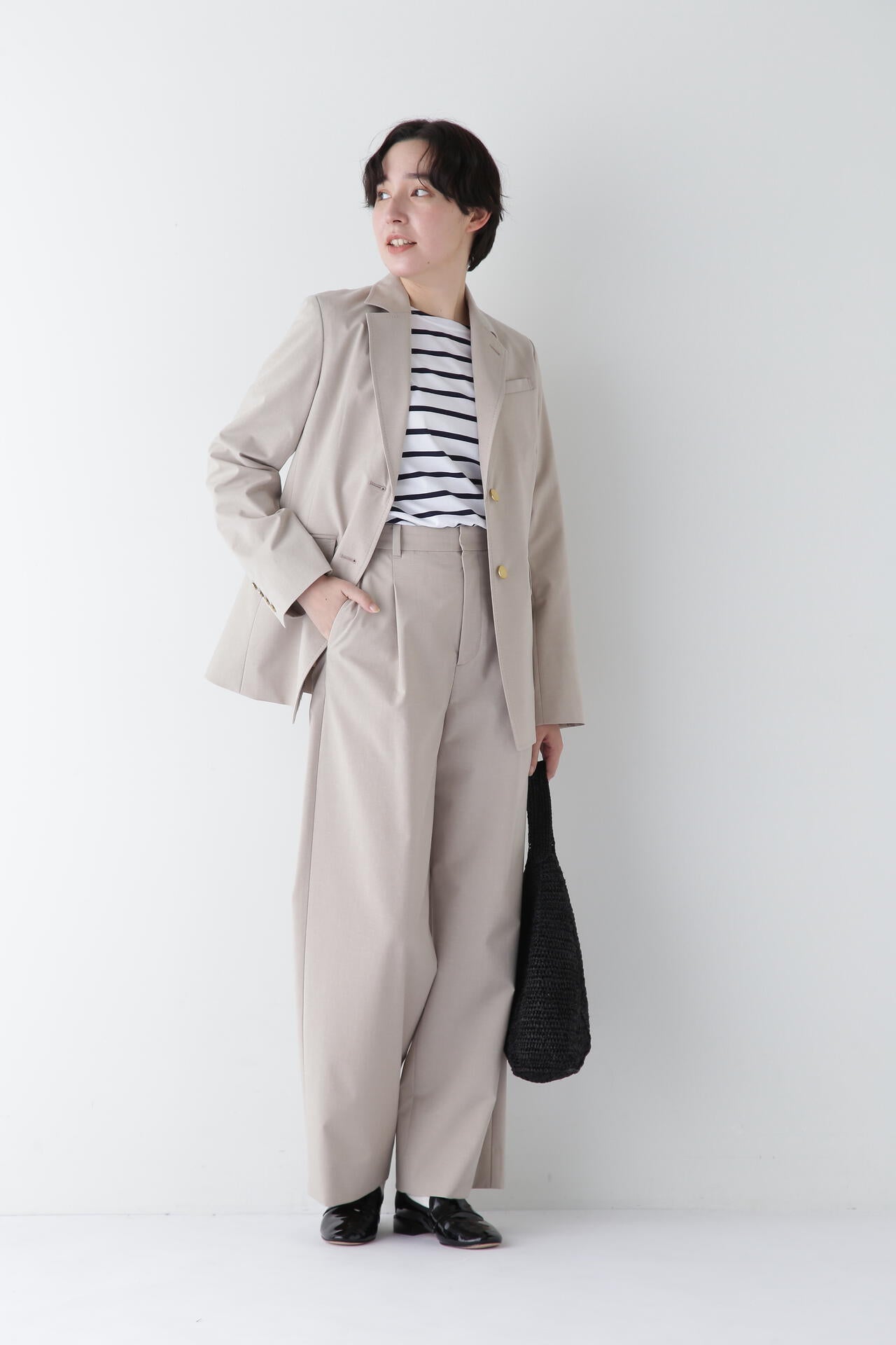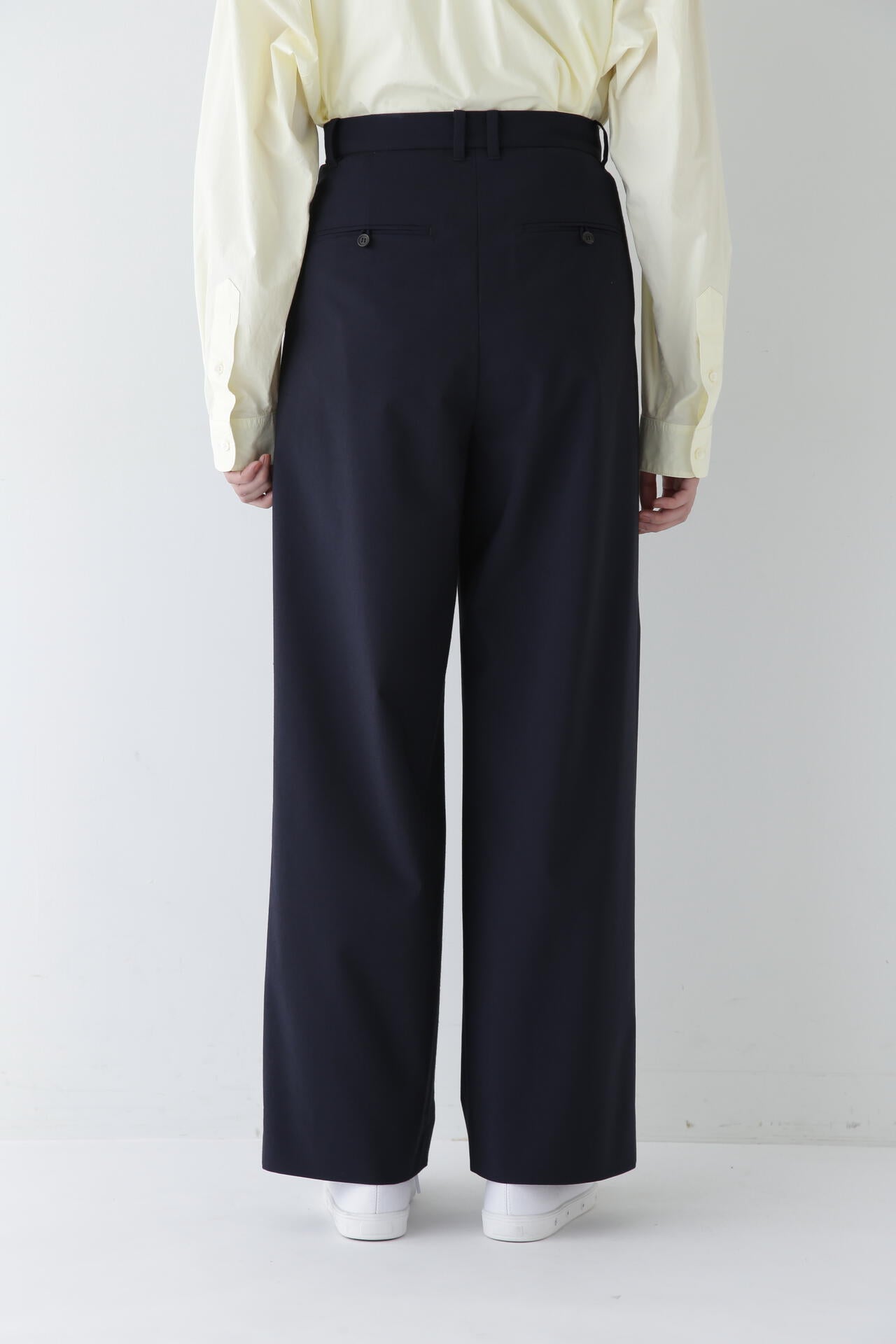 シンプルデザインの万能パンツですが、トップスをインし、ウエストを折り返してマーベルトデザインを見せる着こなしもおすすめです。同素材のジャケットとセットアップでも着用していただけます。