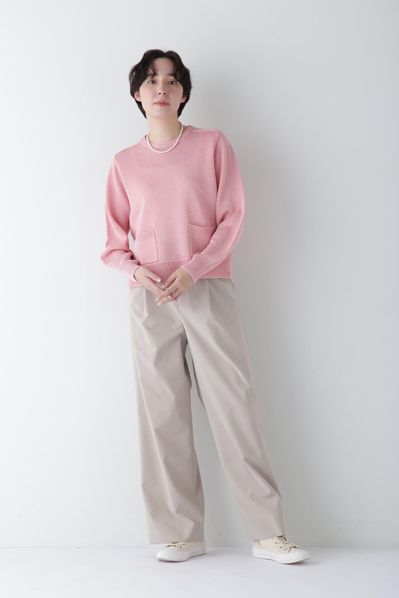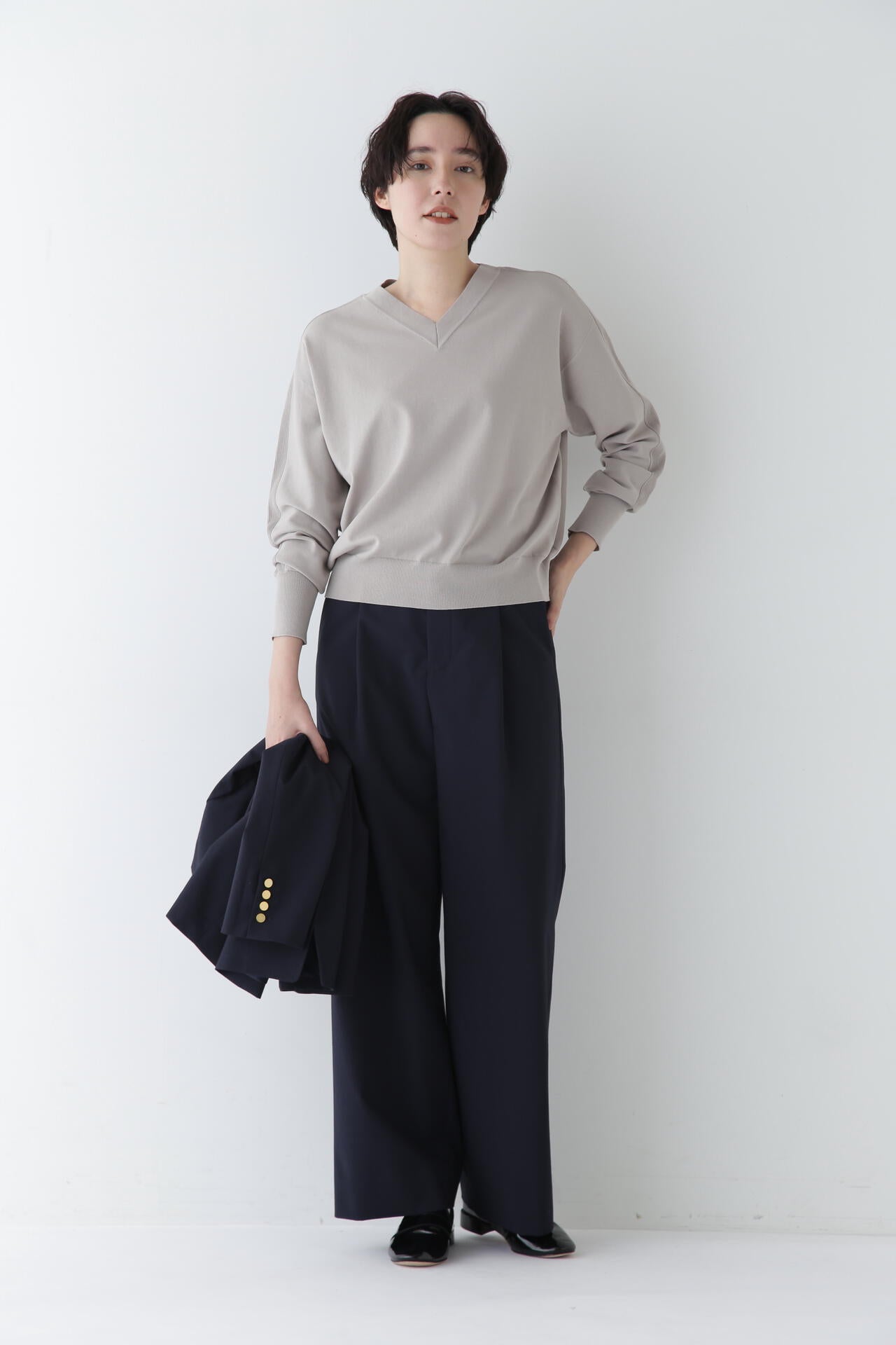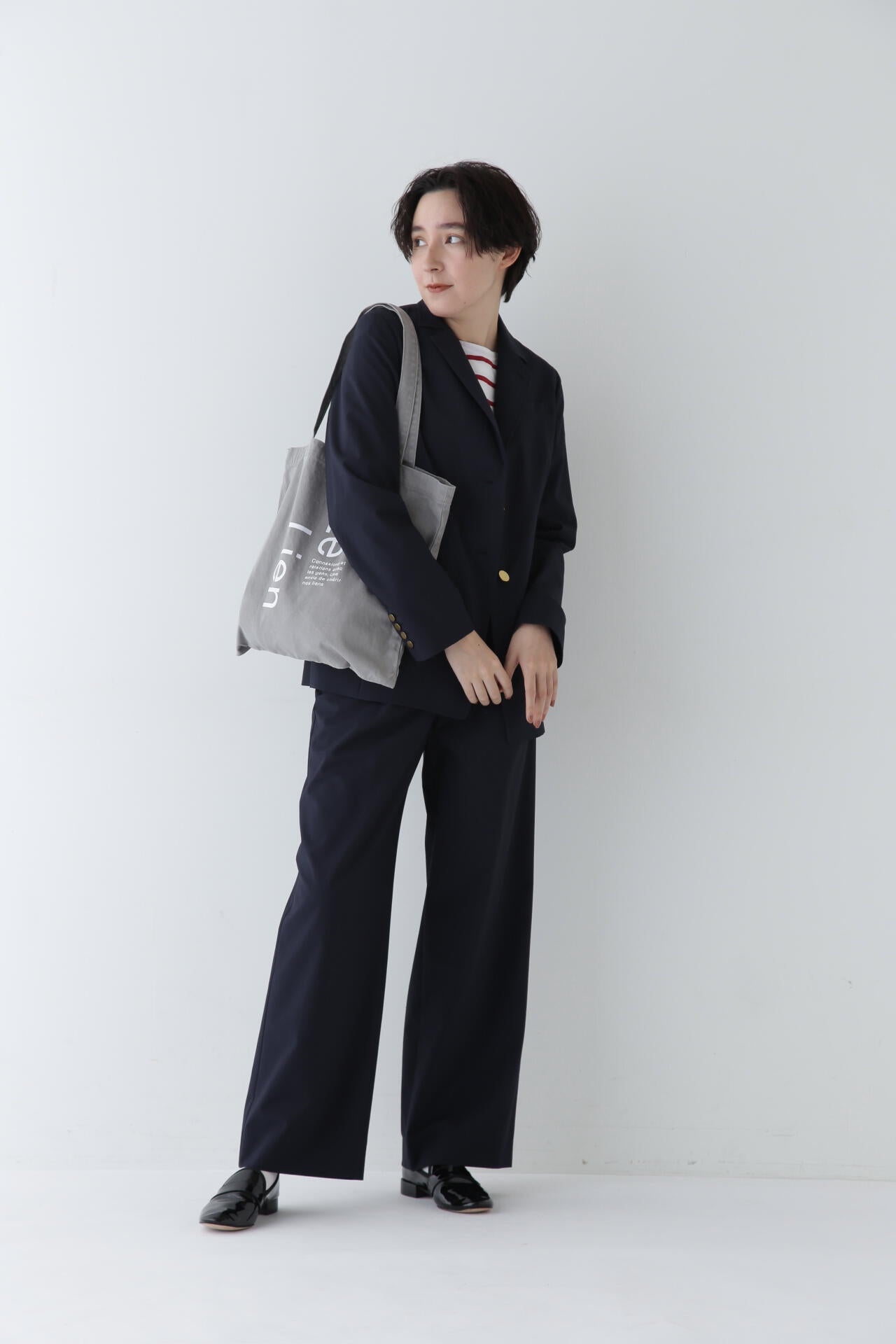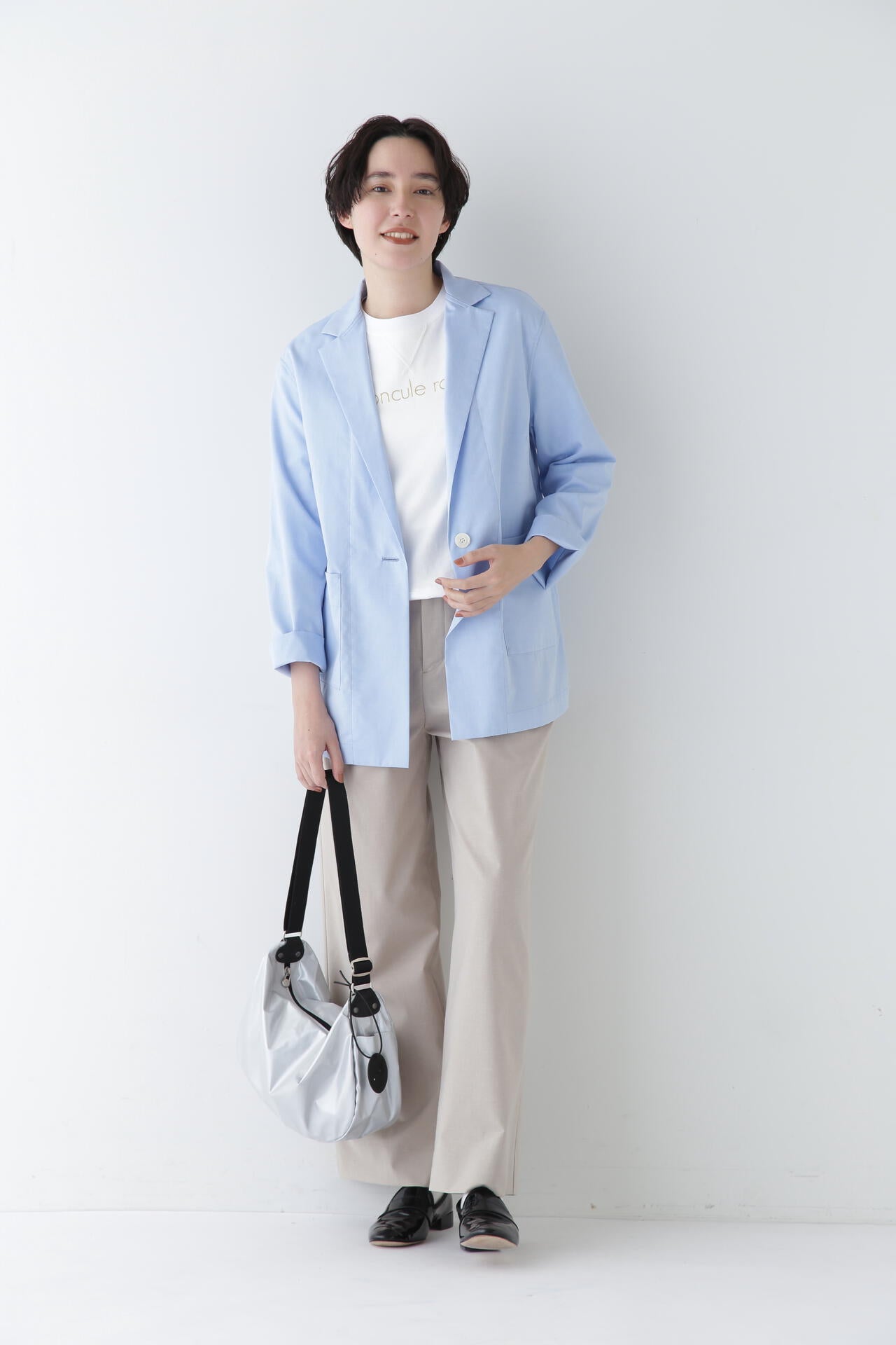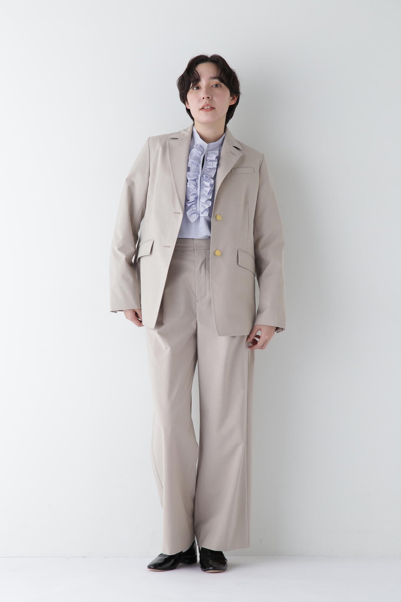 シンプルデザインの万能パンツですが、トップスをインし、ウエストを折り返してマーベルトデザインを見せる着こなしもおすすめです。同素材のジャケットとセットアップでも着用していただけます。
