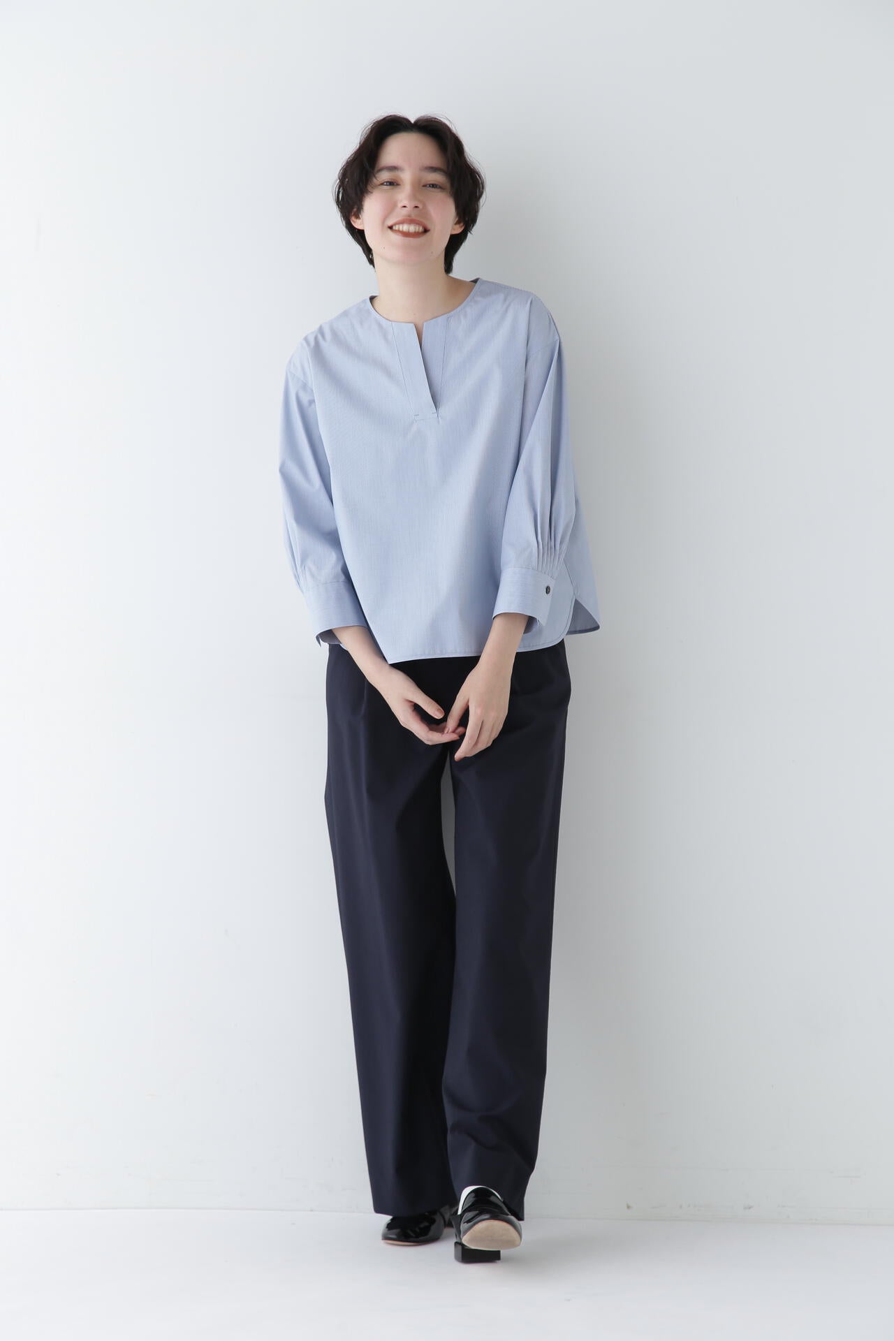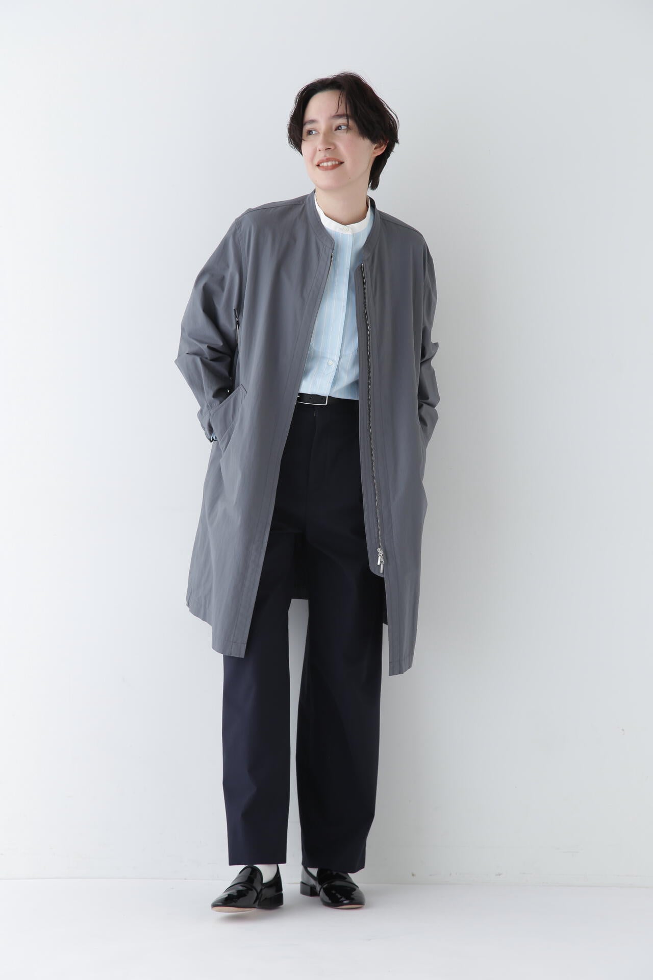 麻混のシャリ感を感じながらもきれいな表面感のTRポプリンを使用しています。程よいナチュラルストレッチも効いていて着用感も心地良い素材です。