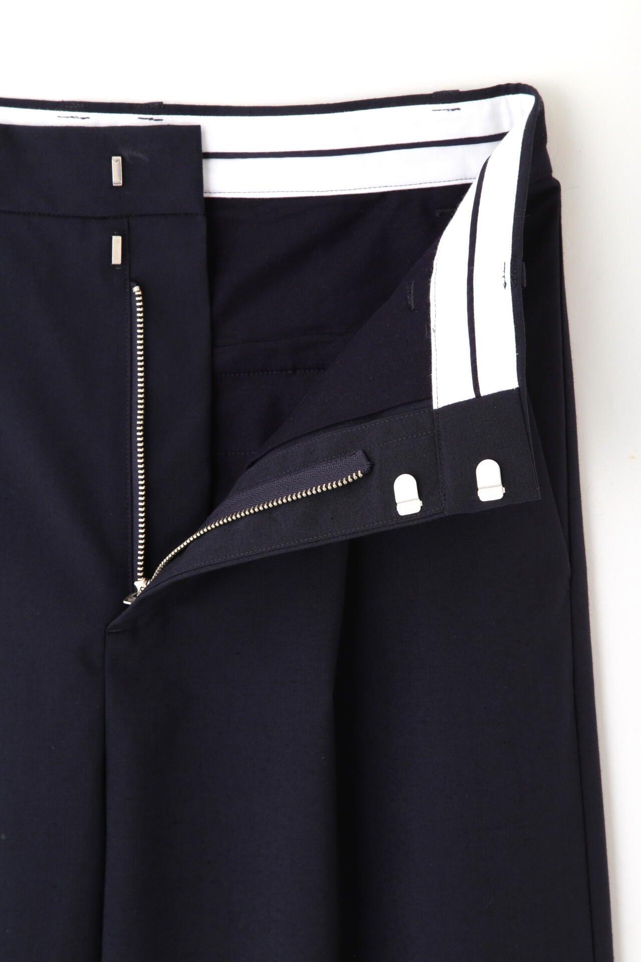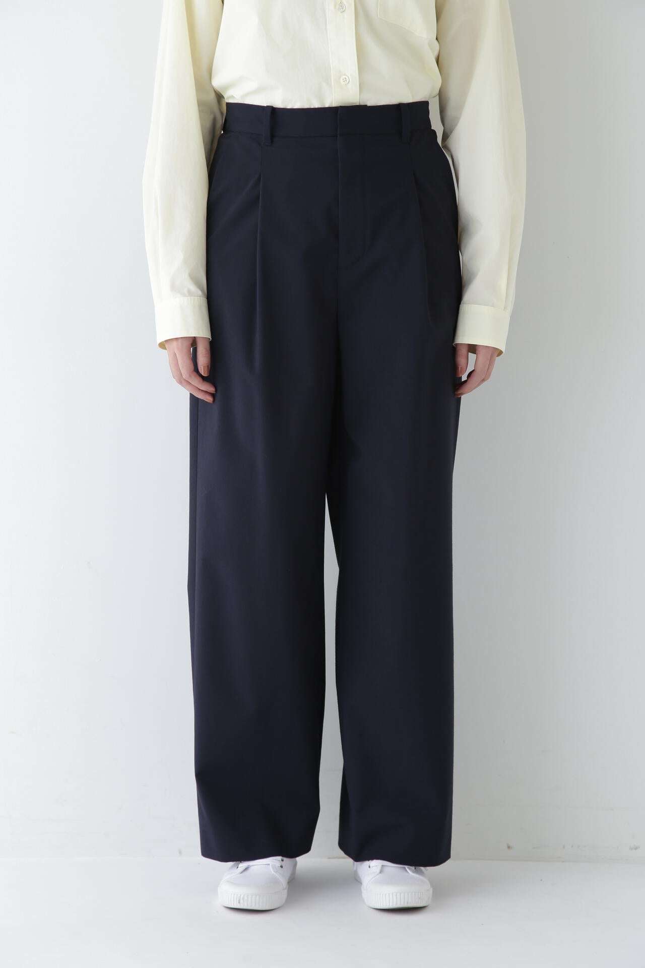 シンプルで大人なシルエット感のワンタックセミワイドパンツです。フロント開きの前カンを外してウエストを折り返し、マーベルト風仕様を表に見せても着用できます。