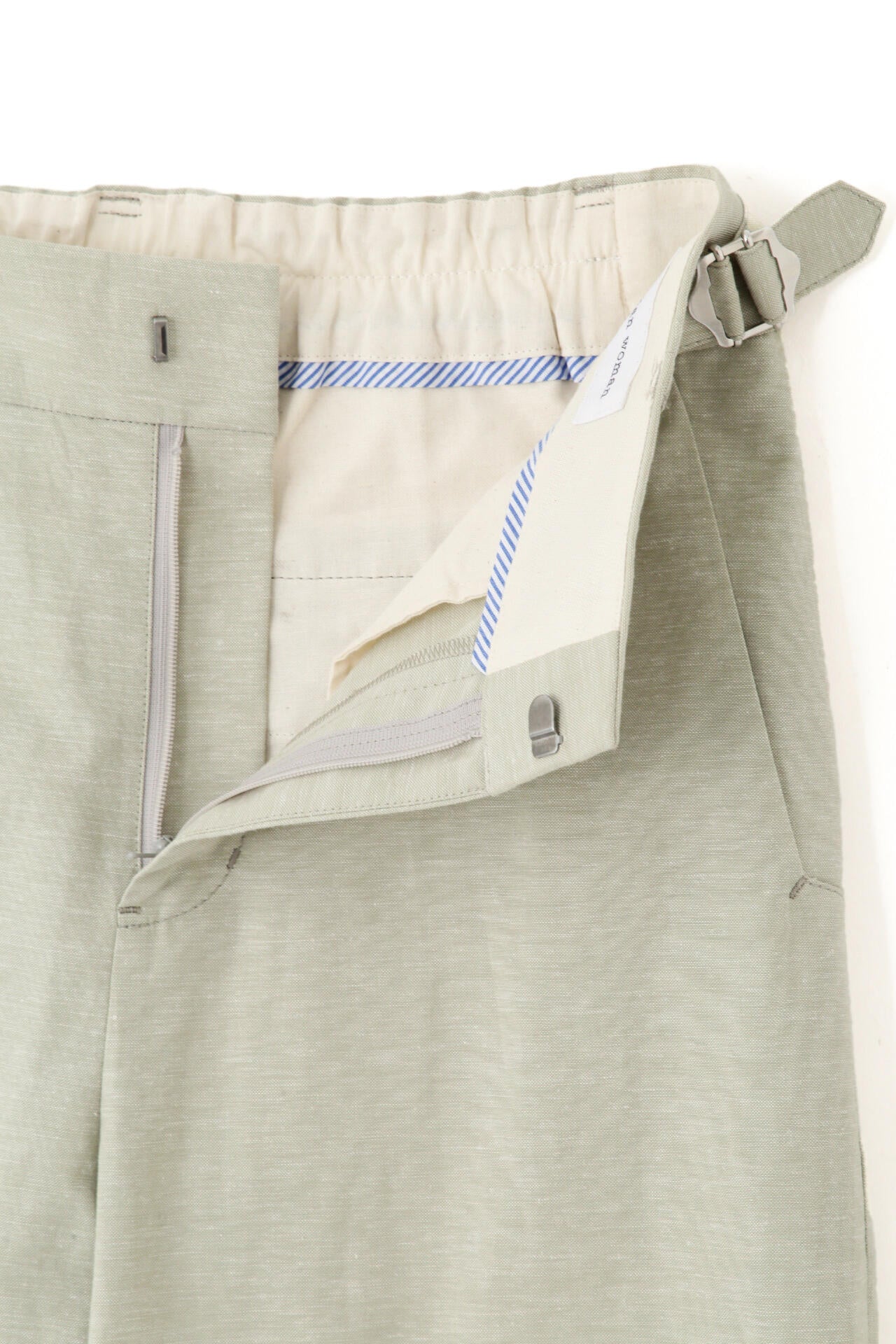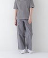 ストレートよりのセミワイドパンツは肌離れするすっきりとしたシルエットです。ウェスト後ろのゴム仕様と、ウエストサイドのミニタブによりフィット感を調節できます。