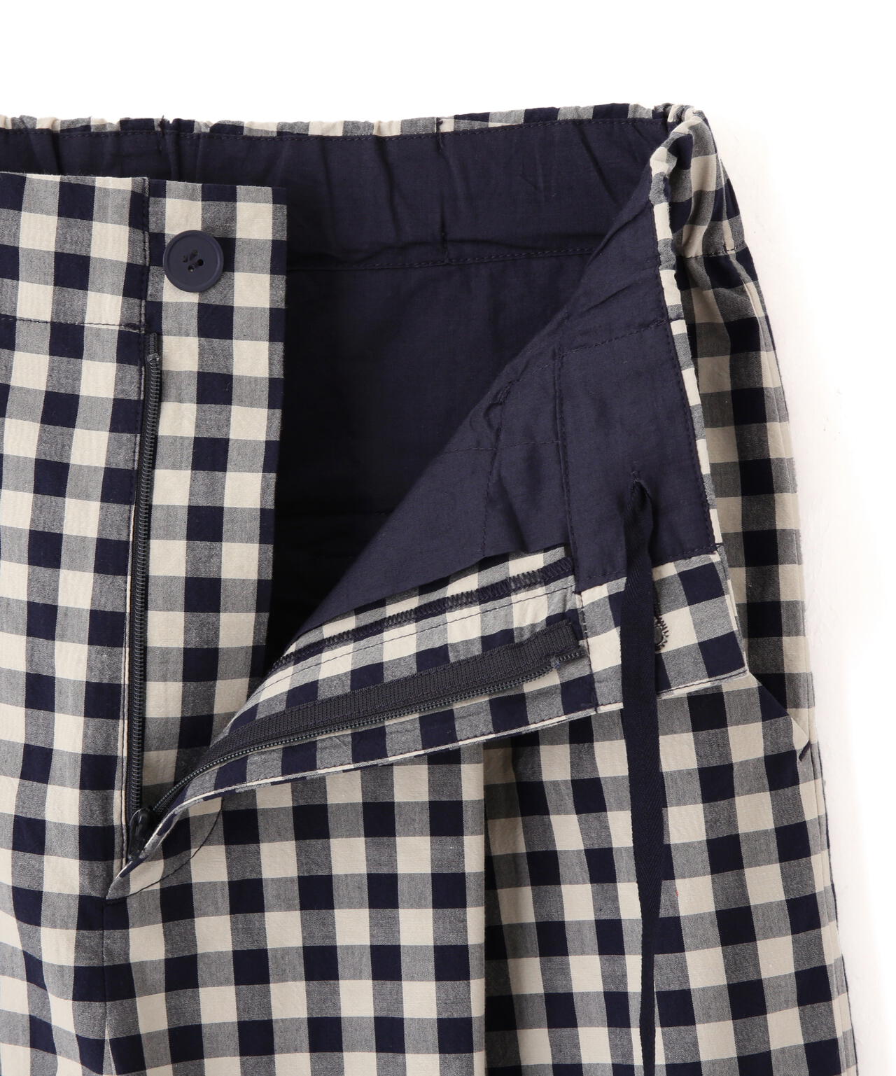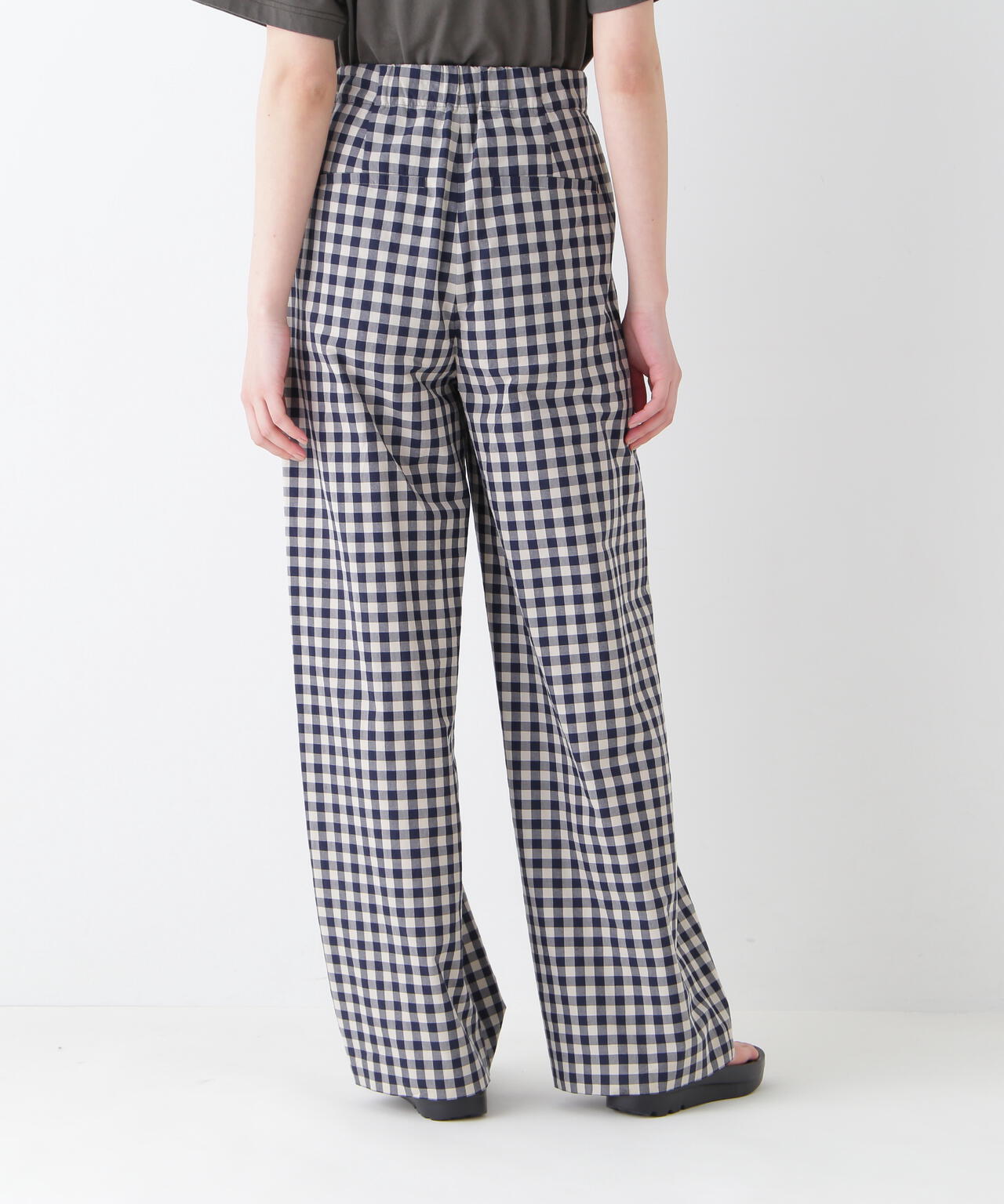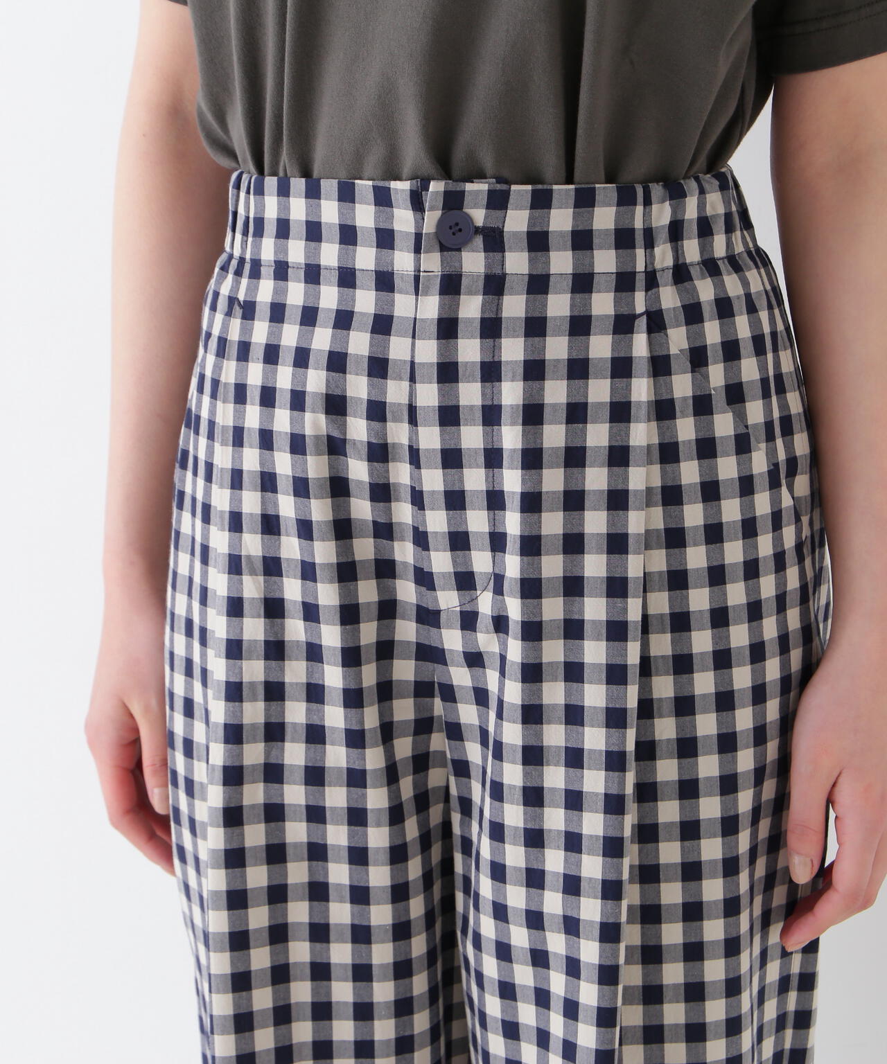 ギンガムチェックの柄を崩さないようすっきりと続きベルトで仕上げたストレート気味のシルエット感のワンタックセミワイドパンツです。リラックス感のあるウエストドロスト仕様なので着用感も良いです。