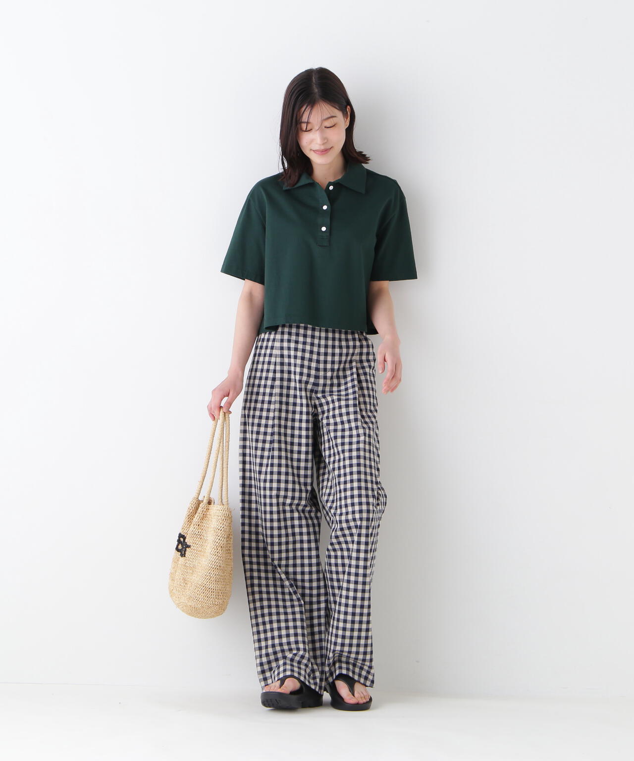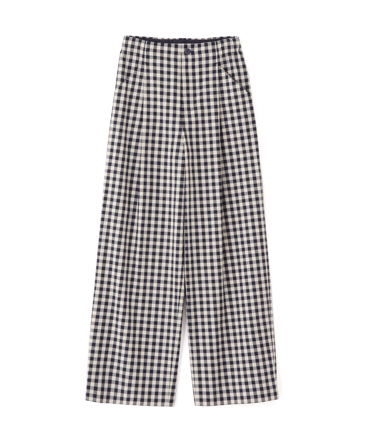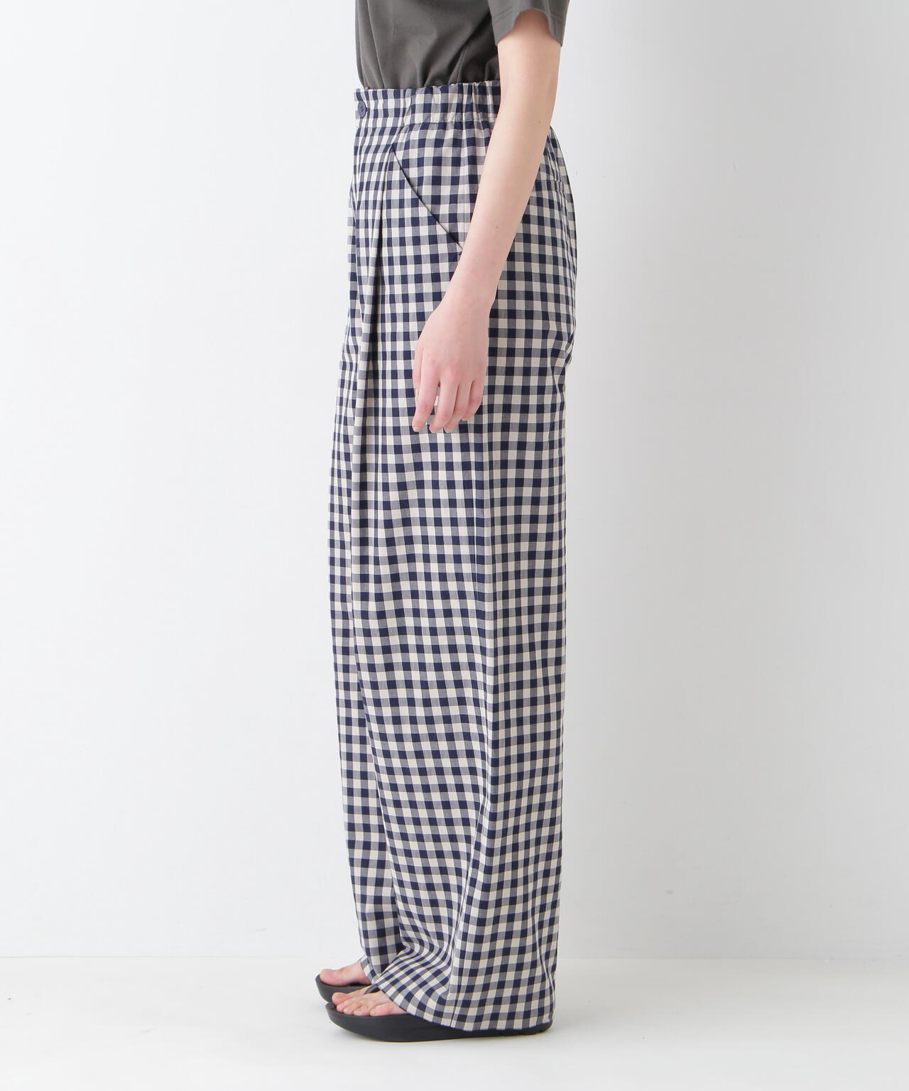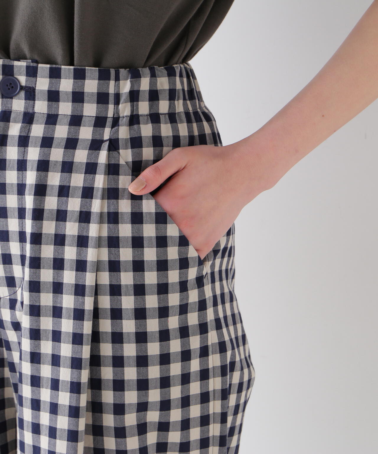 ギンガムチェックの柄を崩さないようすっきりと続きベルトで仕上げたストレート気味のシルエット感のワンタックセミワイドパンツです。リラックス感のあるウエストドロスト仕様なので着用感も良いです。