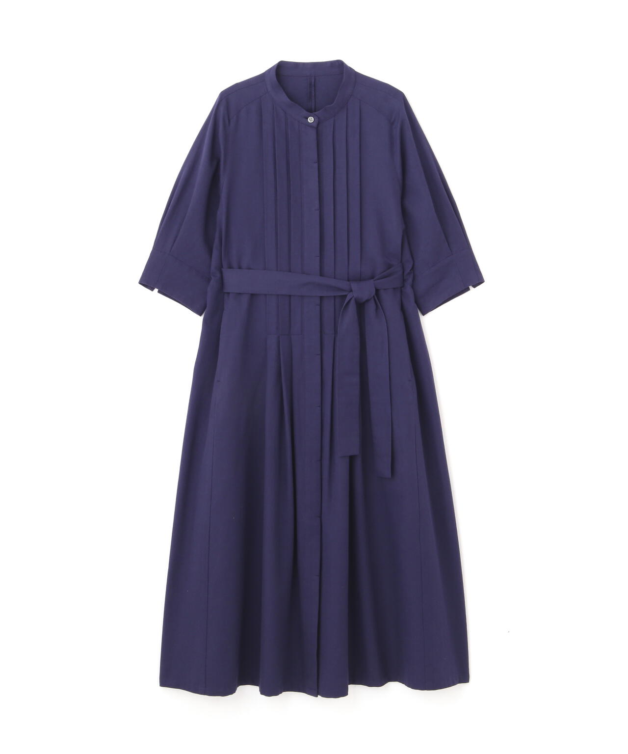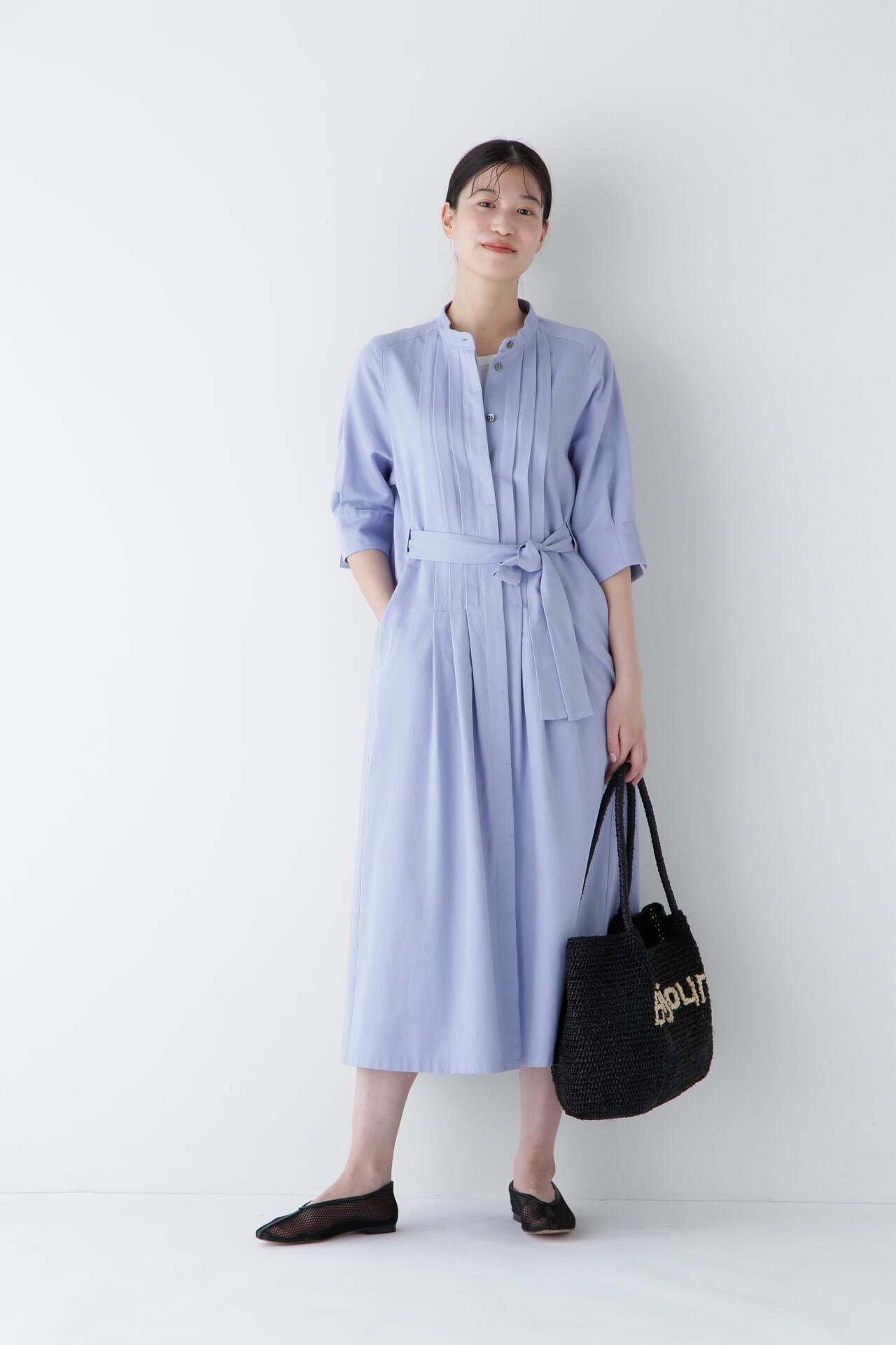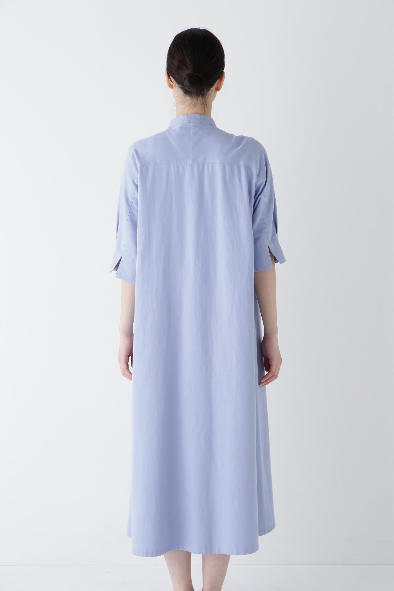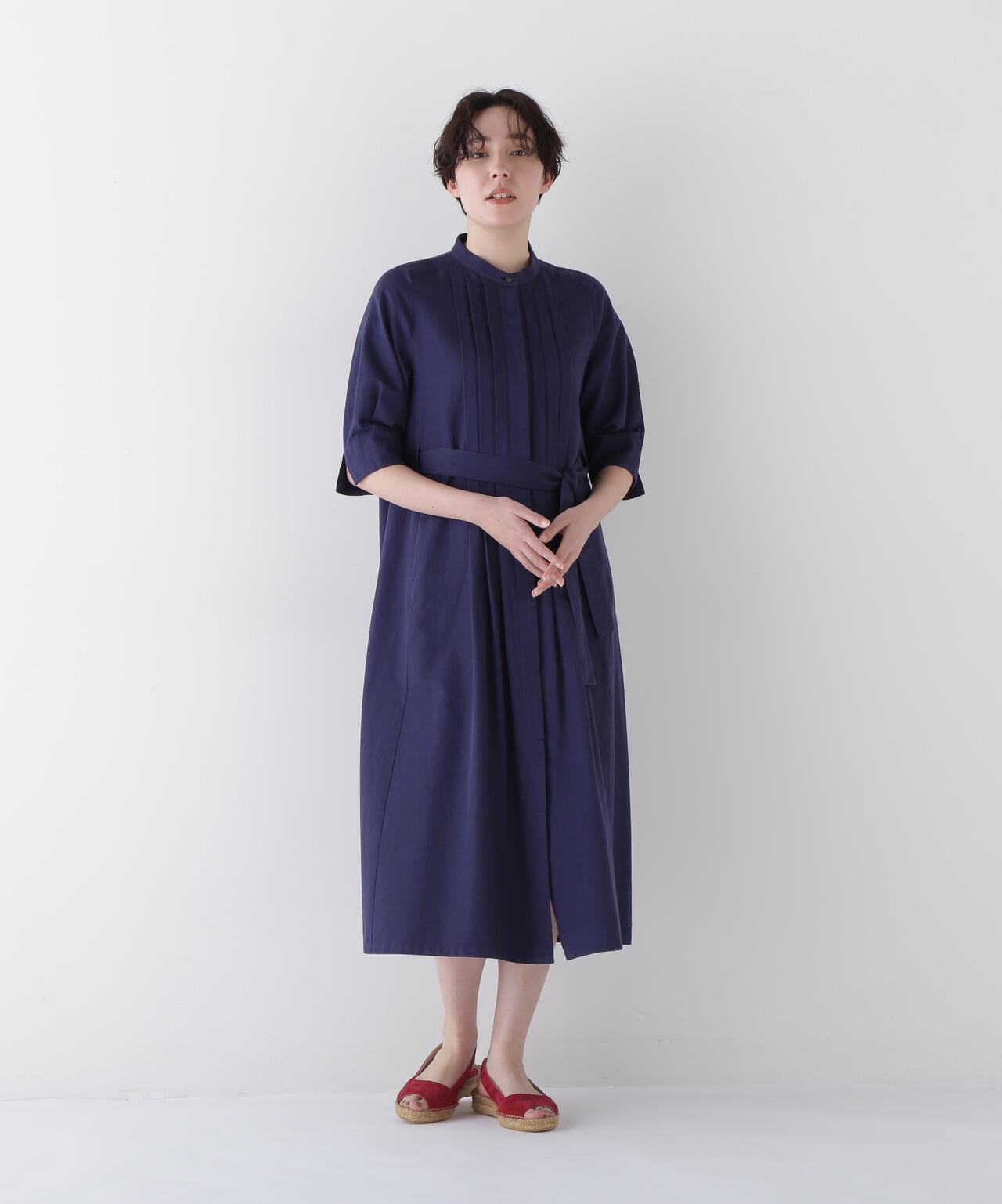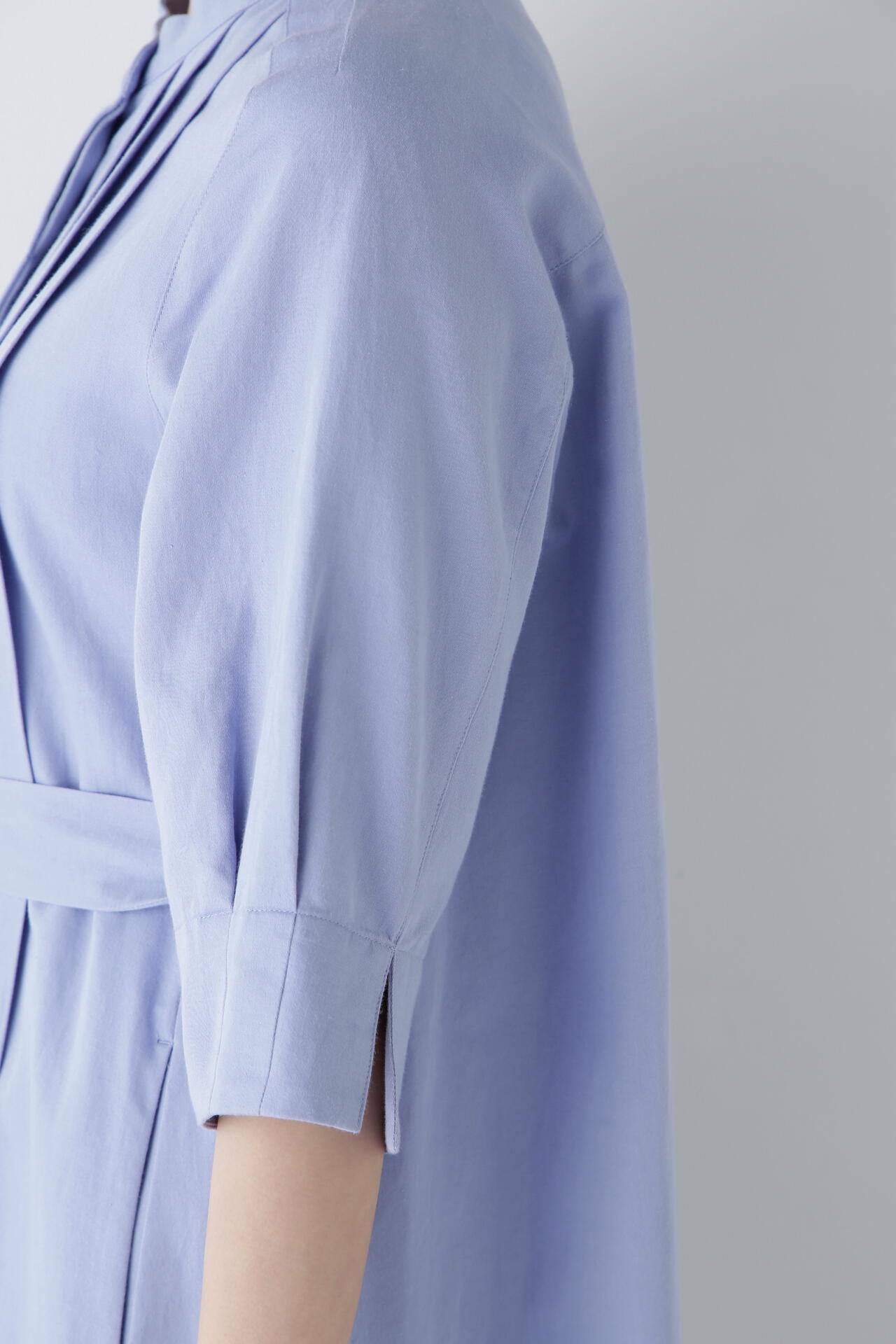 フロントにタックディテールの見えてくるバンドカラーワンピースです。変形ラグランスリーブの袖口はスリット仕様になっておりターンバックもできます。