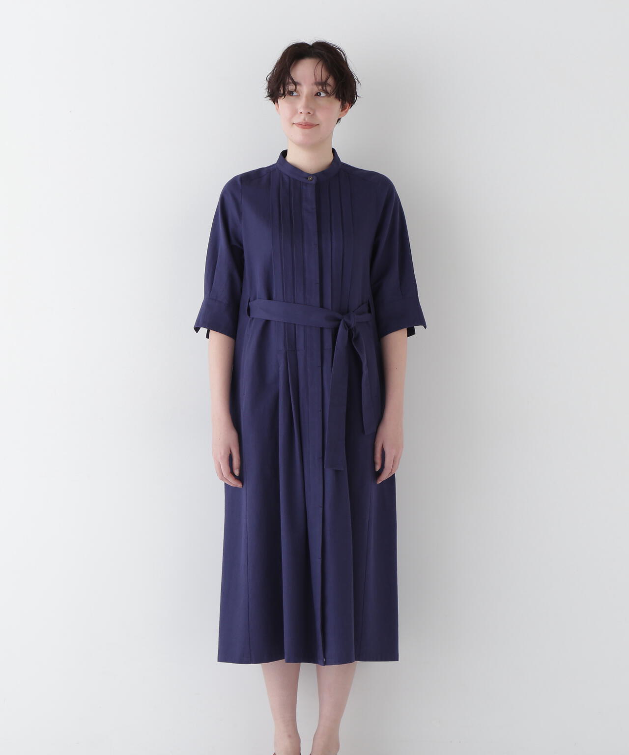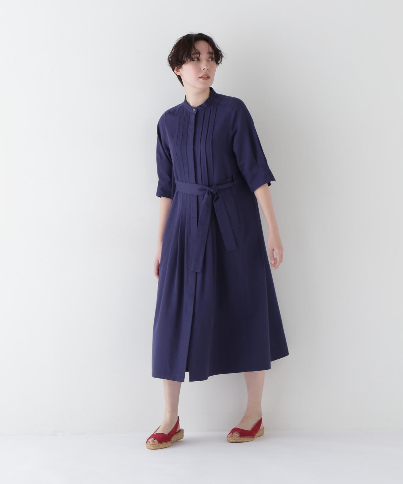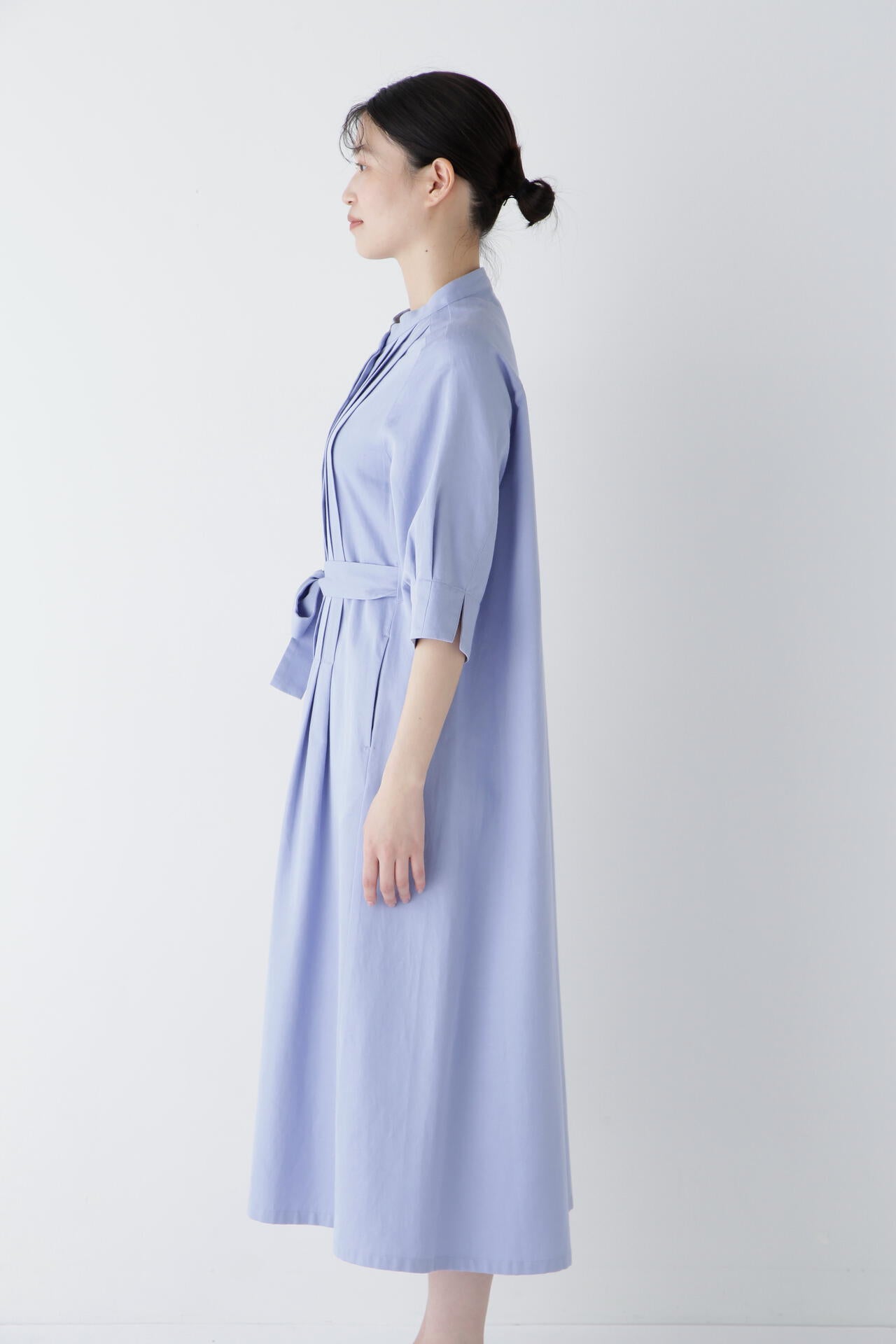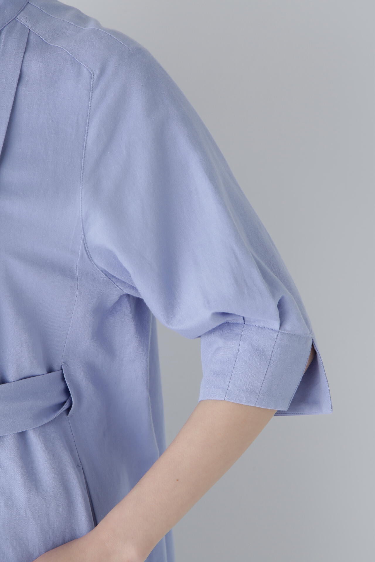 フロントにタックディテールの見えてくるバンドカラーワンピースです。変形ラグランスリーブの袖口はスリット仕様になっておりターンバックもできます。