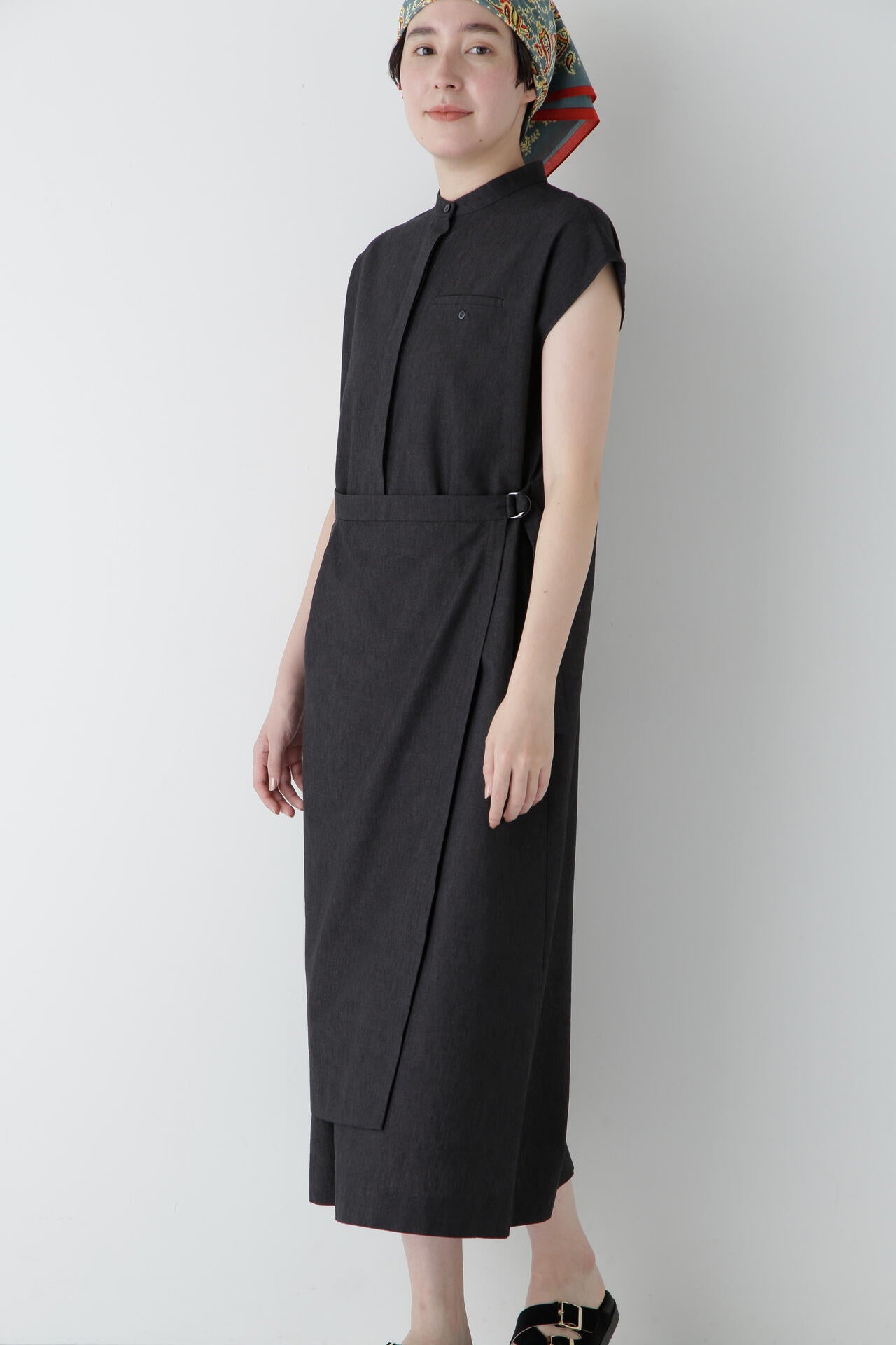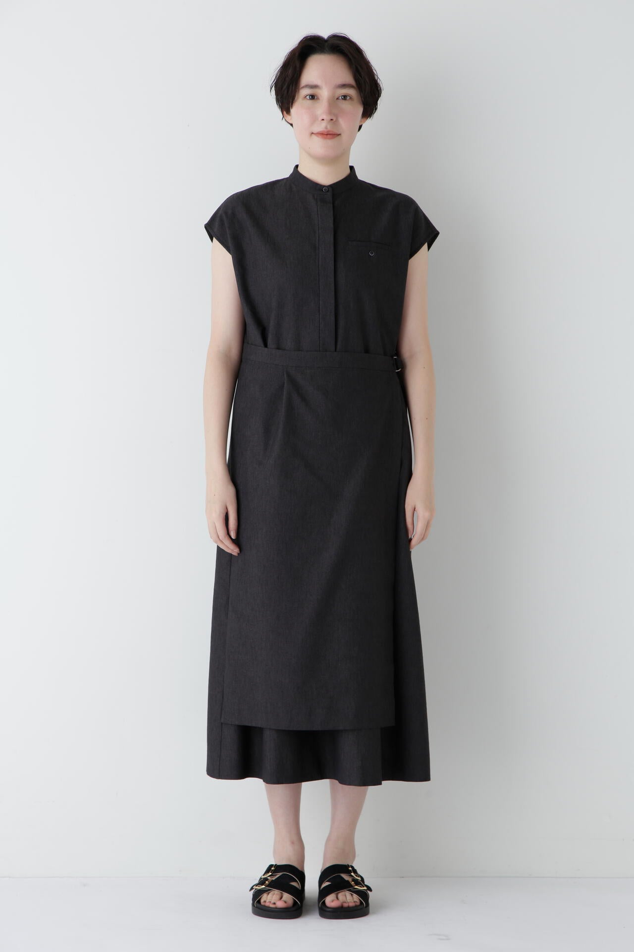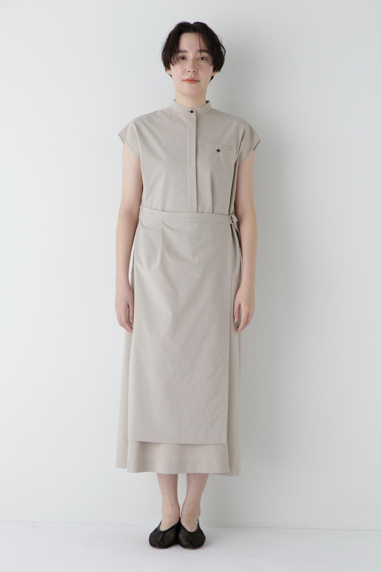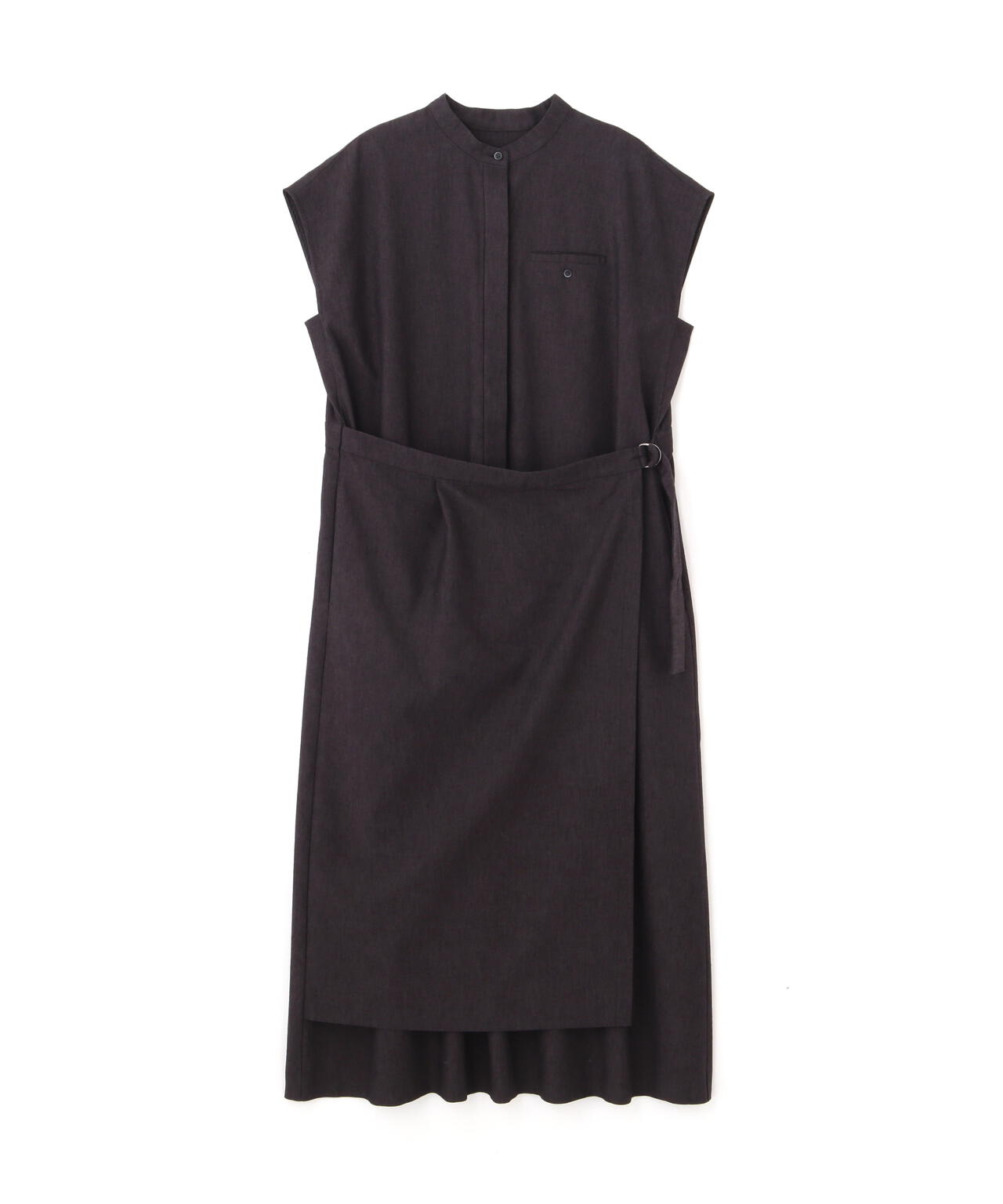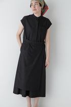 スカート部分の巻き風のデザインがまるでセットアップを着ているように見えるワンピースです。前が途中あきの前立てデザインにトラッド感のあるディテールを盛り込んでポイントにしています。